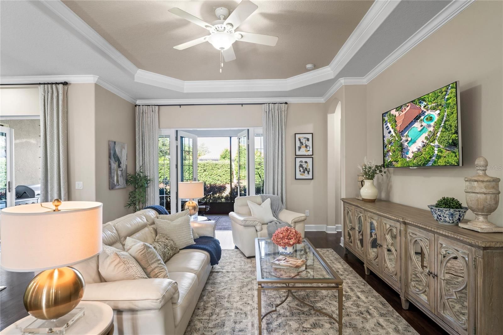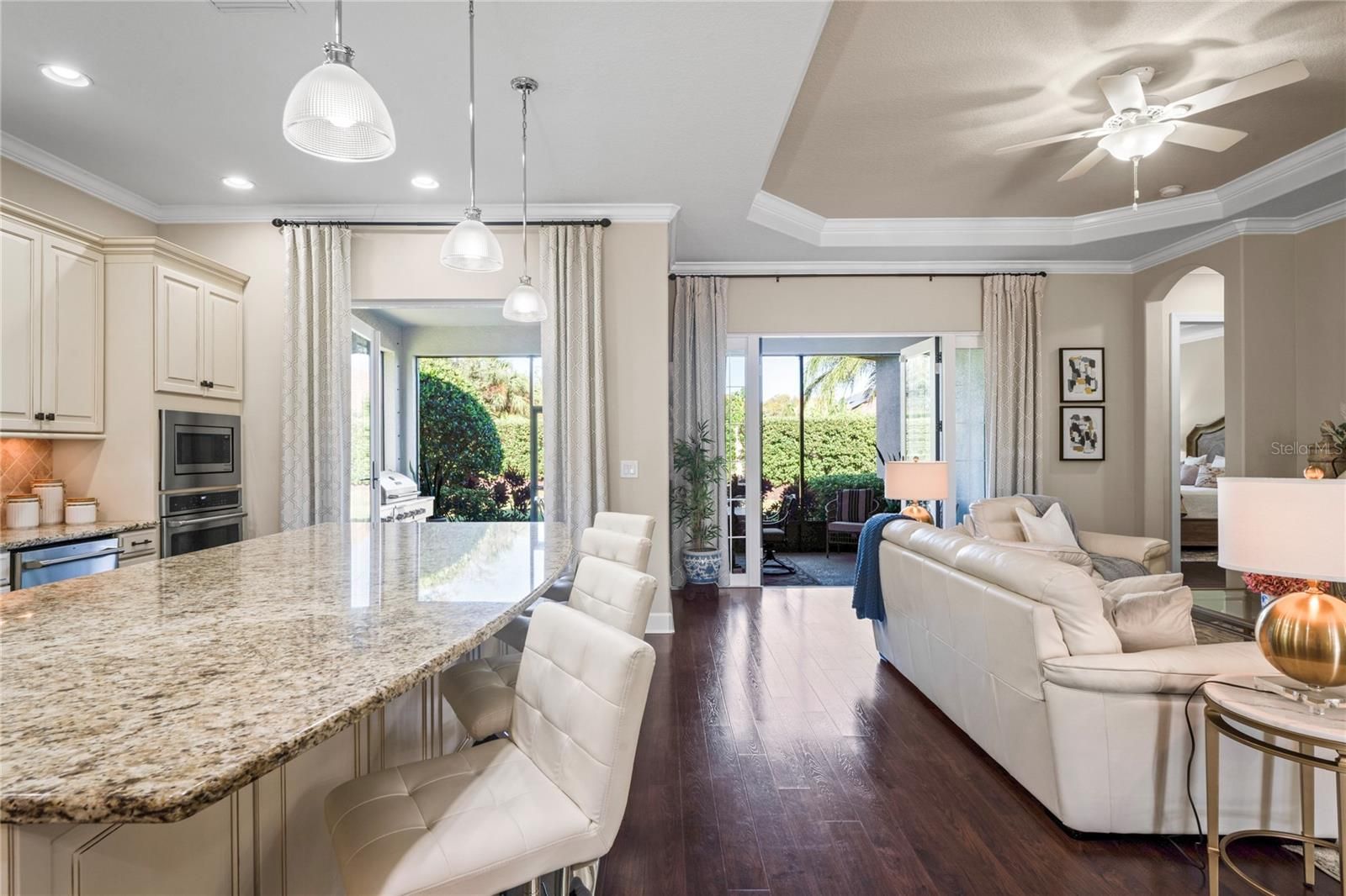 - Ceiling Fan(s), Crown Molding, Kitchen/Family Room Combo, Living/Dining Room, Open Floorplan, Main Level Primary, Stone Counters, Thermostat, Tray Ceiling(s), Walk-In Closet(s), Window Treatments
