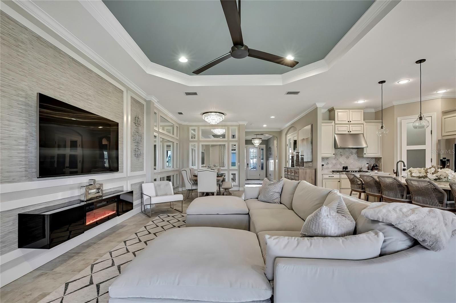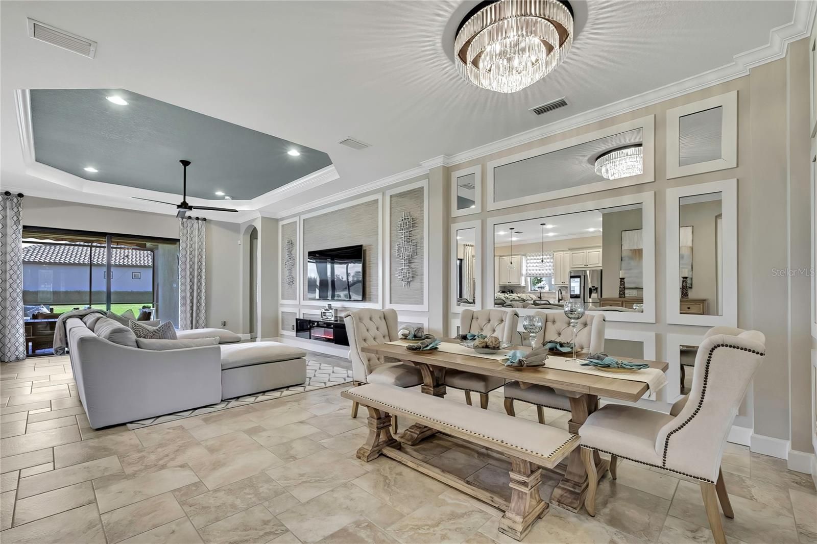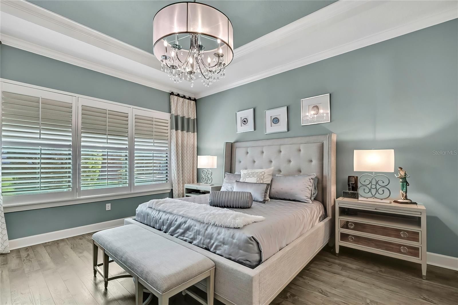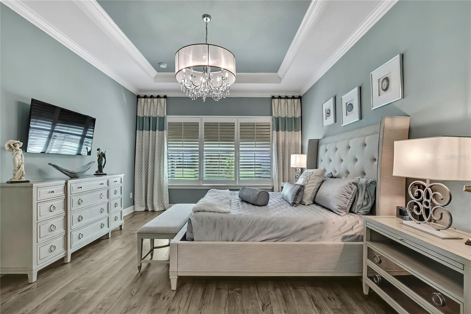 - Ceiling Fan(s), Crown Molding, Eat-in Kitchen, High Ceilings, Living/Dining Room, Open Floorplan, Main Level Primary, Solid Surface Counters, Solid-Wood Cabinets, Split Bedrooms, Thermostat, Tray Ceiling(s), Walk-In Closet(s), Window Treatments