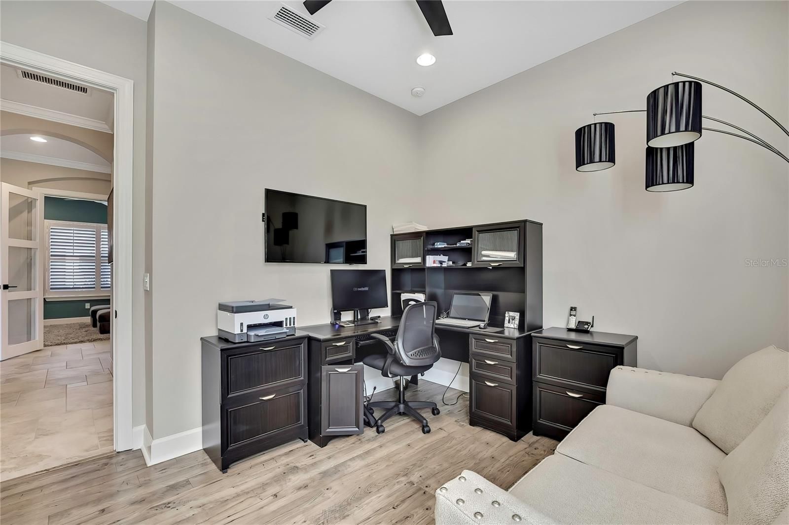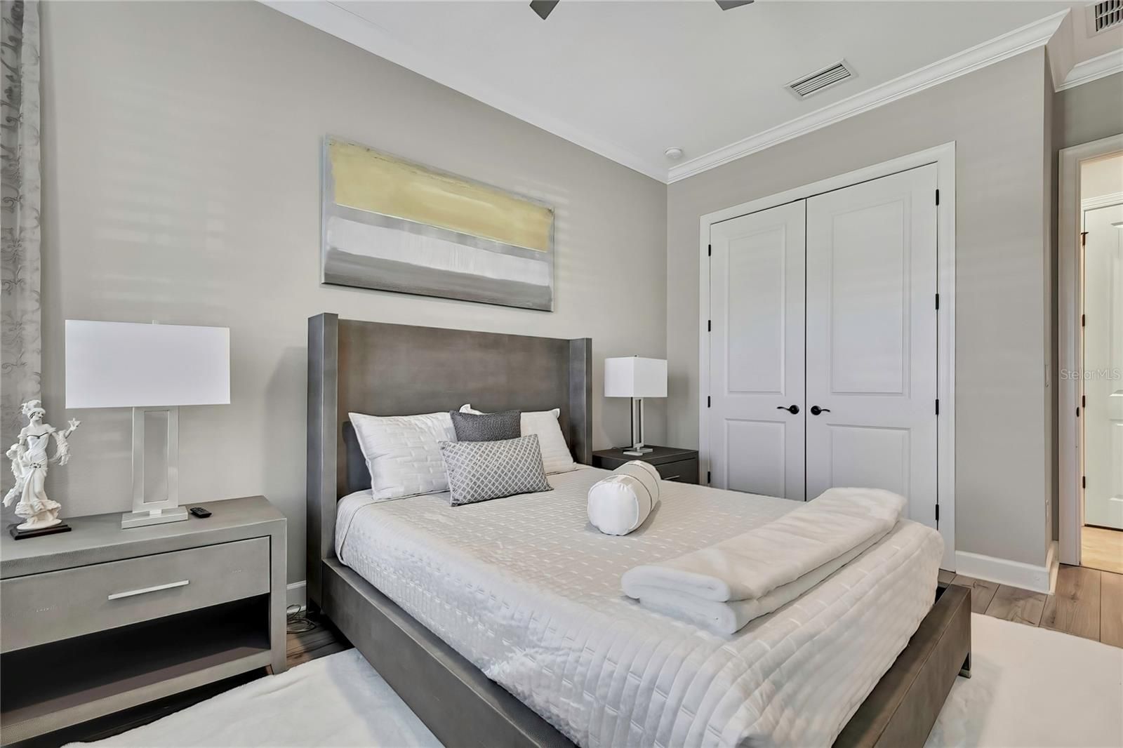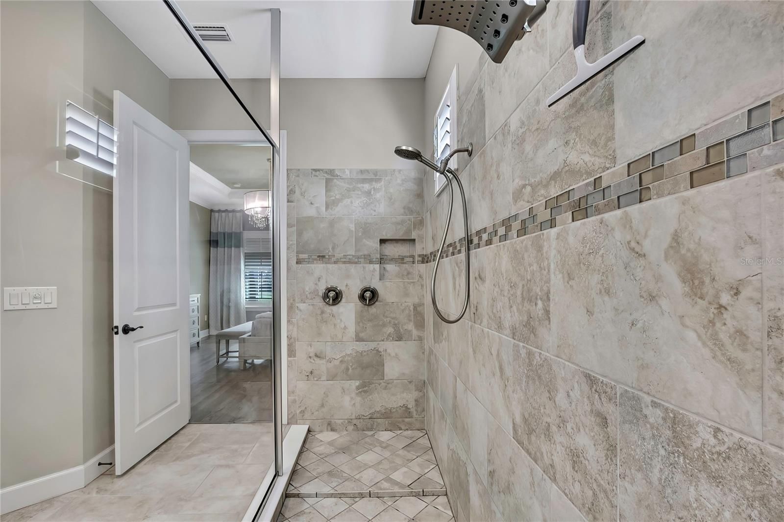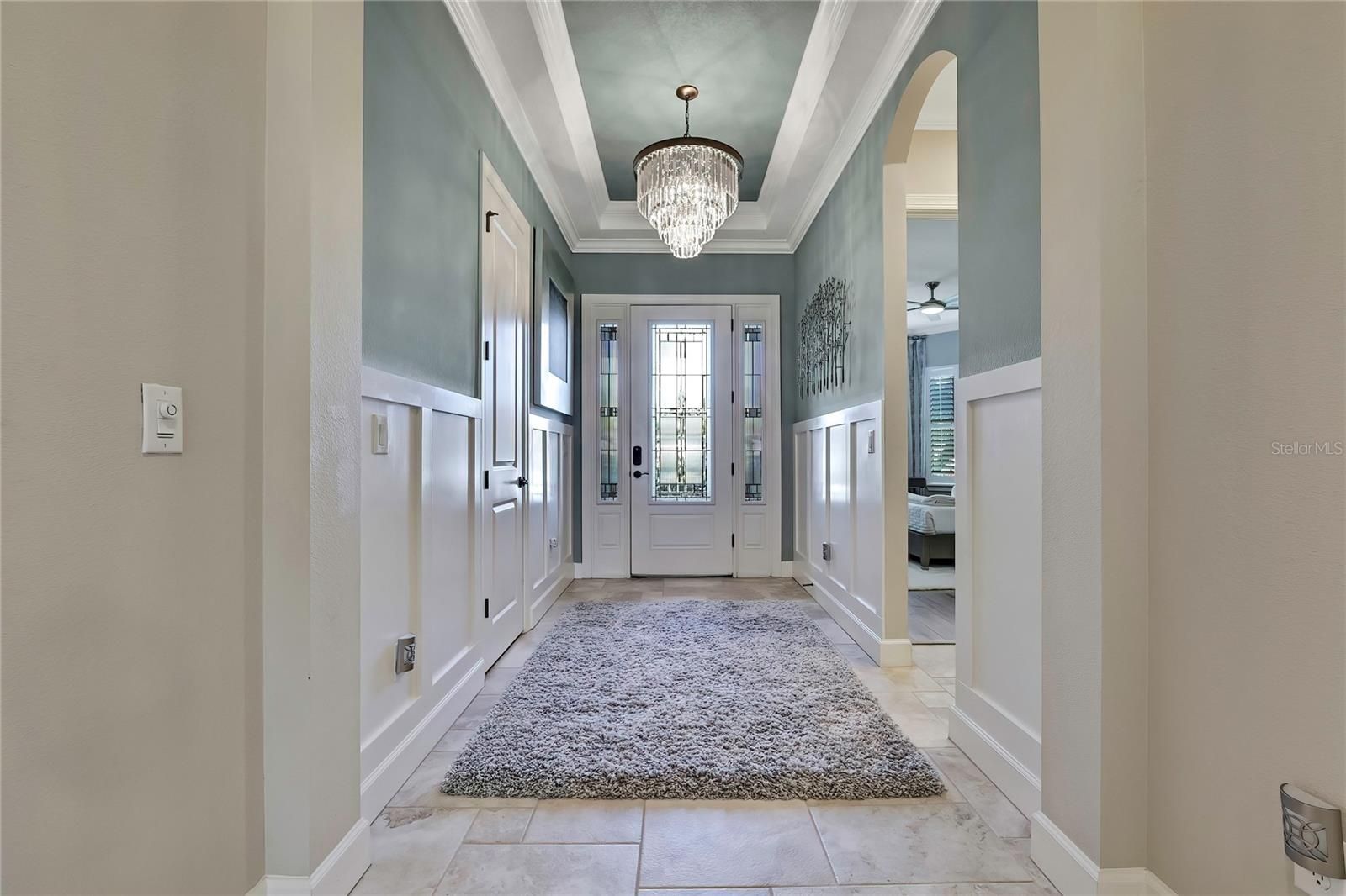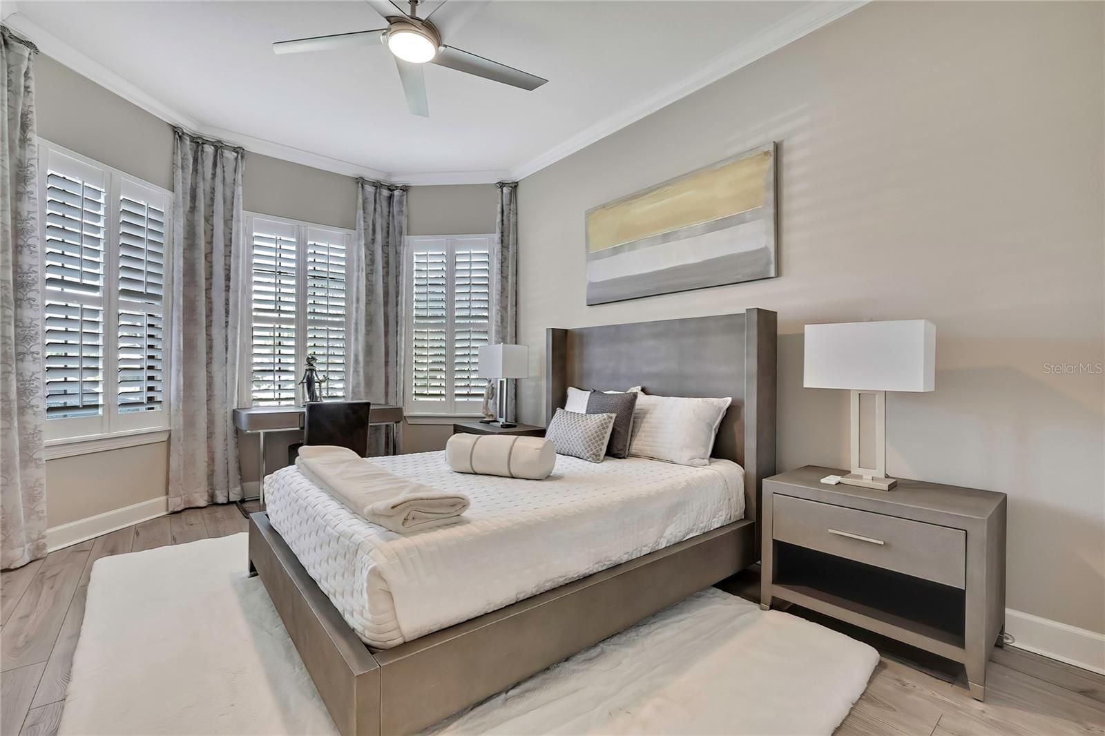 - Ceiling Fan(s), Crown Molding, Eat-in Kitchen, High Ceilings, Living/Dining Room, Open Floorplan, Main Level Primary, Solid Surface Counters, Solid-Wood Cabinets, Split Bedrooms, Thermostat, Tray Ceiling(s), Walk-In Closet(s), Window Treatments