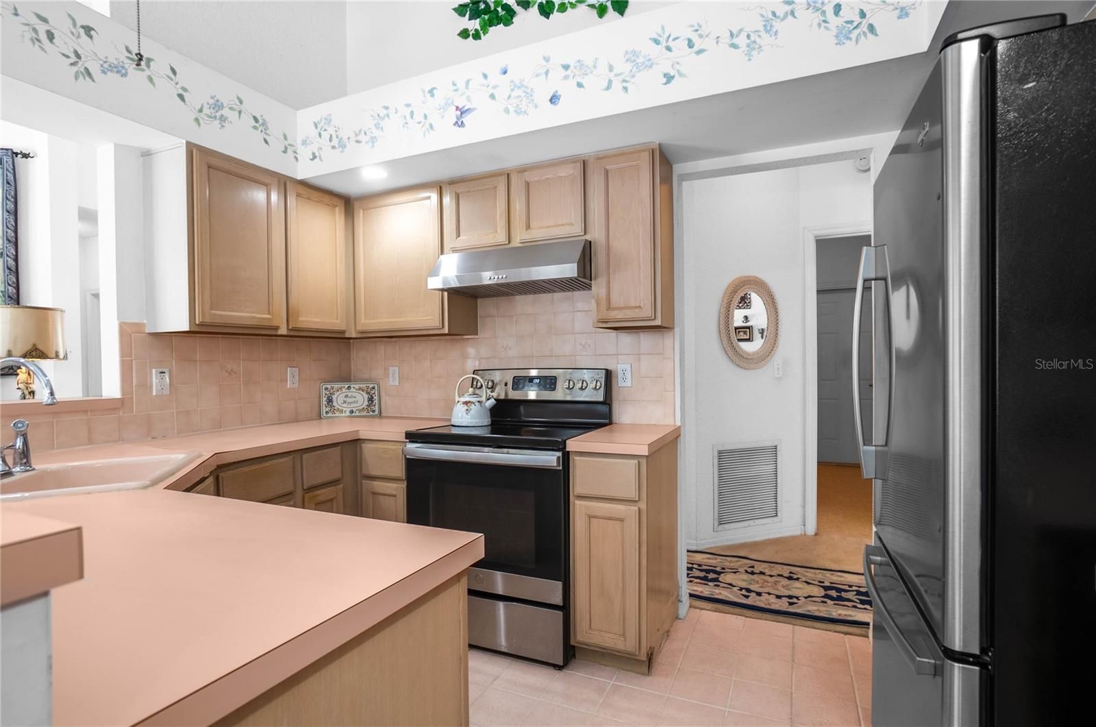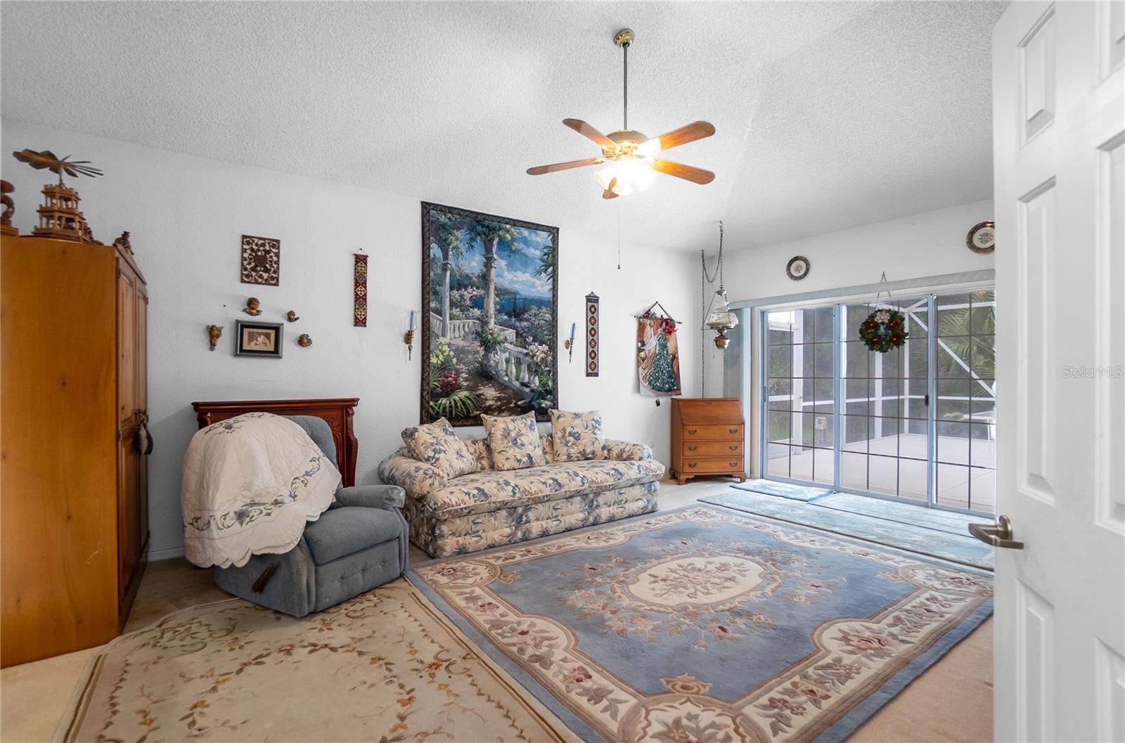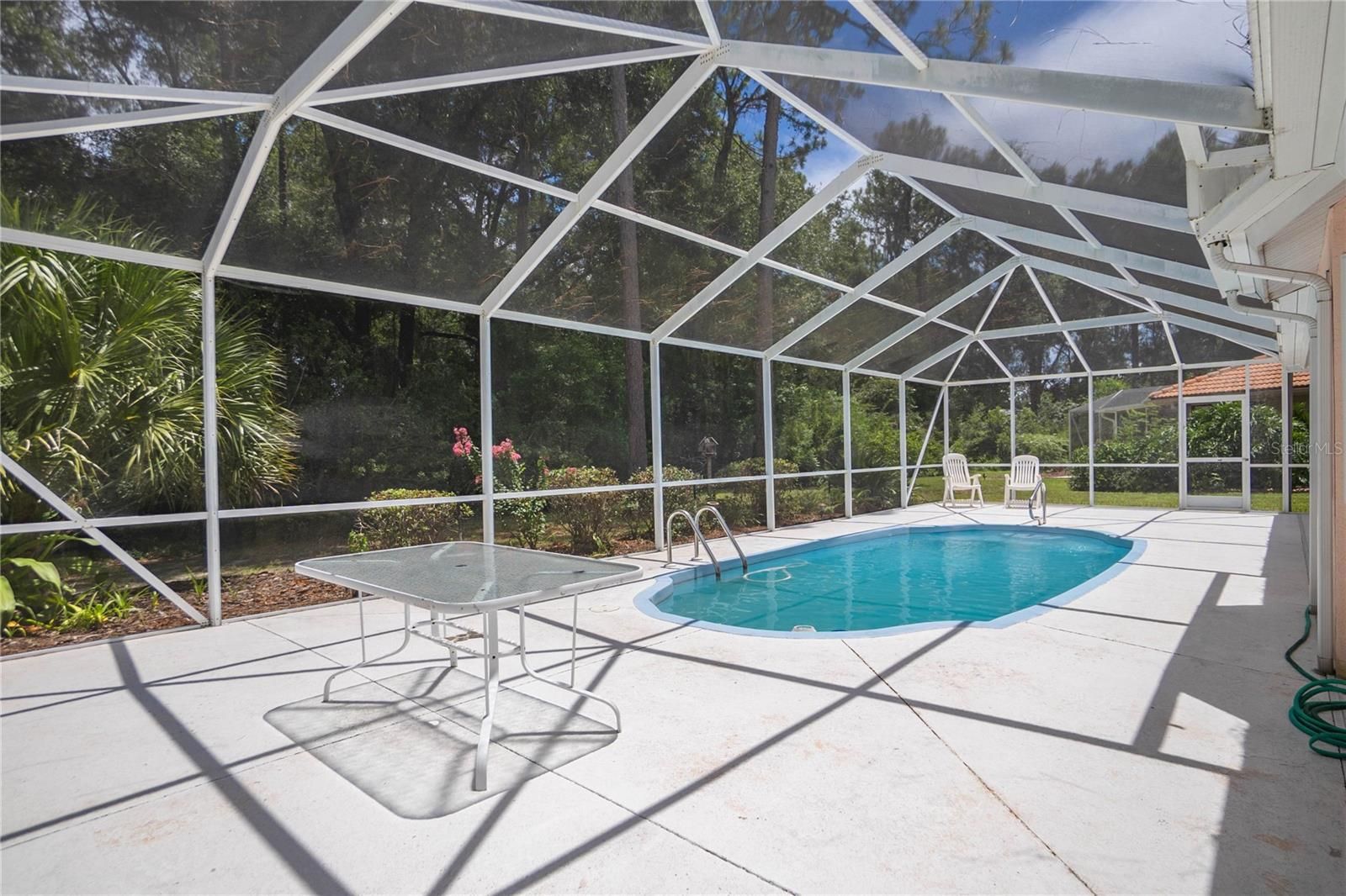 This home is the sought-after and hard to find Oak Run model – the Capri Extended – including with side-load garage being offered by the original owner. It is rock solid concrete block and stucco construction. Covered patio, 10’ x 24’ swimming pool with large, screened pool enclosure on 68’ x 16’ concrete deck. Private back yard with natural foliage for quiet and privacy. No homes are behind the house. French doors open to the very large primary bedroom with vaulted ceiling and fan. Attached en-suite bath with dressing table vanity, tub, walk-in shower and block glass. Three large double-pane glass sliding doors opening directly on to the pool. Kitchen has high ceiling, wood cabinetry and updated stainless appliances including electric range with exhaust hood, refrigerator and dishwasher, as well as track lighting and recessed lighting. Adjoining roomy eat-in breakfast nook has bump out windows overlooking the pool. The dining room has bump out windows overlooking the front yard, with light fixture matching that of the foyer. Recessed front door has cathedral and side glass panel, and half-moon upper window -- all with vertical blinds. Tiled foyer with light fixture matching dining area. Roomy living room with vaulted ceiling and fan has three very large windows overlooking the pool. Double French doors open to the second bedroom with large walk-in closet, two front-facing windows and ceiling fan. Second bath has a walk-in tiled shower with seat, private toilet with separate door, vanity with mirror, mirrored medicine cabinet and linen closet with modular shelving, The second bath has extra door opening directly onto the covered patio and pool area. Utility room has closet and opens to plus-size two-car garage. This can easily be converted to the inside laundry room. Garage has automatic double door, washer and dryer, utility sink, electric water heater, electric panel, Toro 9-channel irrigation controller, and internet link-up et al. Oak Run resort style living features six swimming pools including year-round indoor pool with free swim, lane swim and water volleyball – as well as two modern fitness facilities with fitness classes. outdoor and indoor pickle ball, tennis courts, shuffleboard, bocce ball, billiards, card room, ceramics, library, neighborhood cable channel and more than 50 clubs to join. Features Oak Room Bar and Grill restaurant. Royal Oaks Golf course membership available. Modest HOA dues. 55 Plus community. Original tile roof and HVAC updated 2012. Seller offering $16,000 at closing to replace the tile roof with shingle. Estimate and all warranty information available. Seller offering $3,000 credit at closing for sink and stove cabinets.