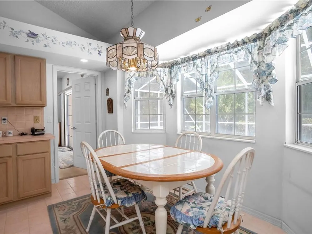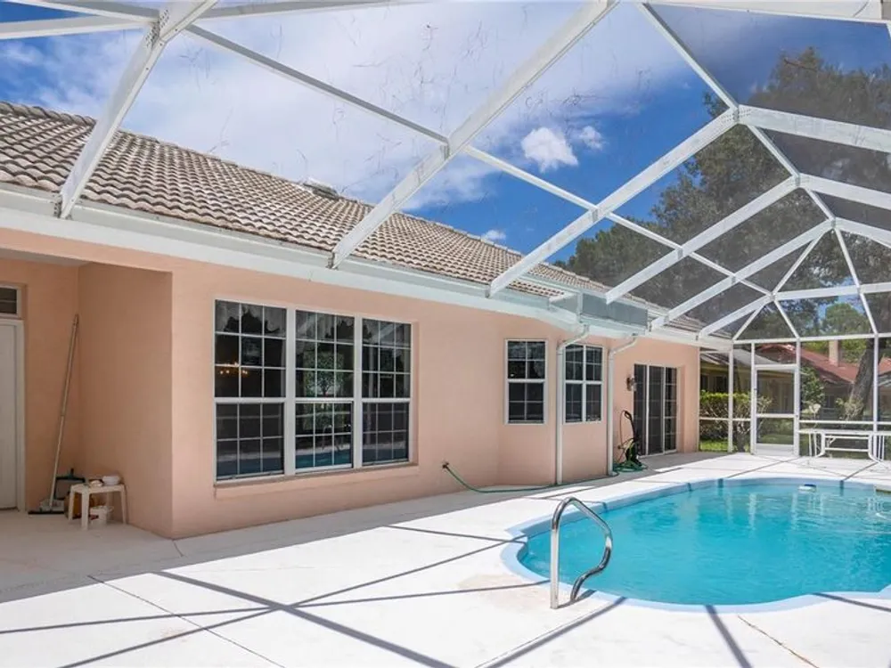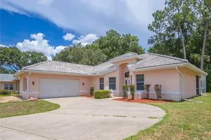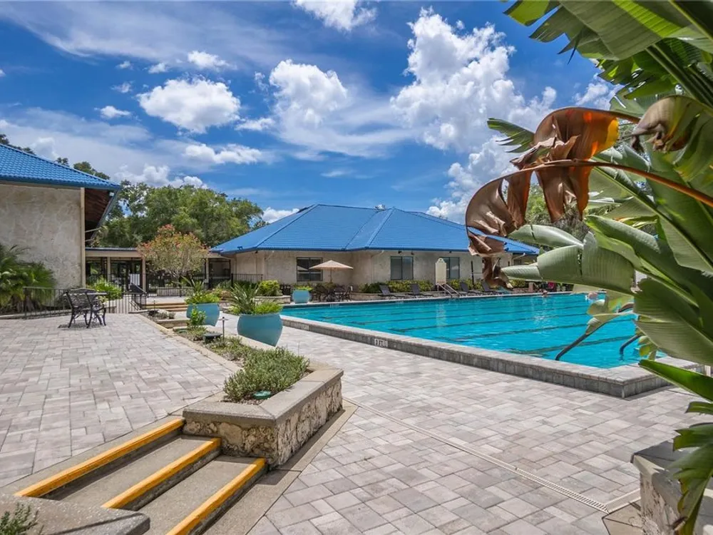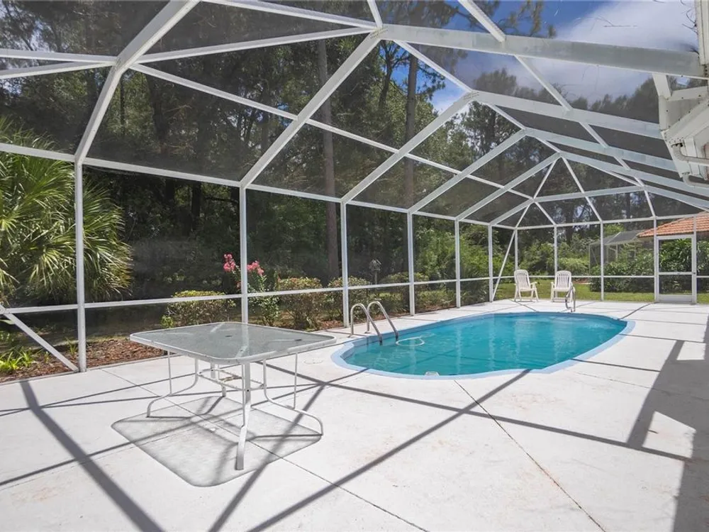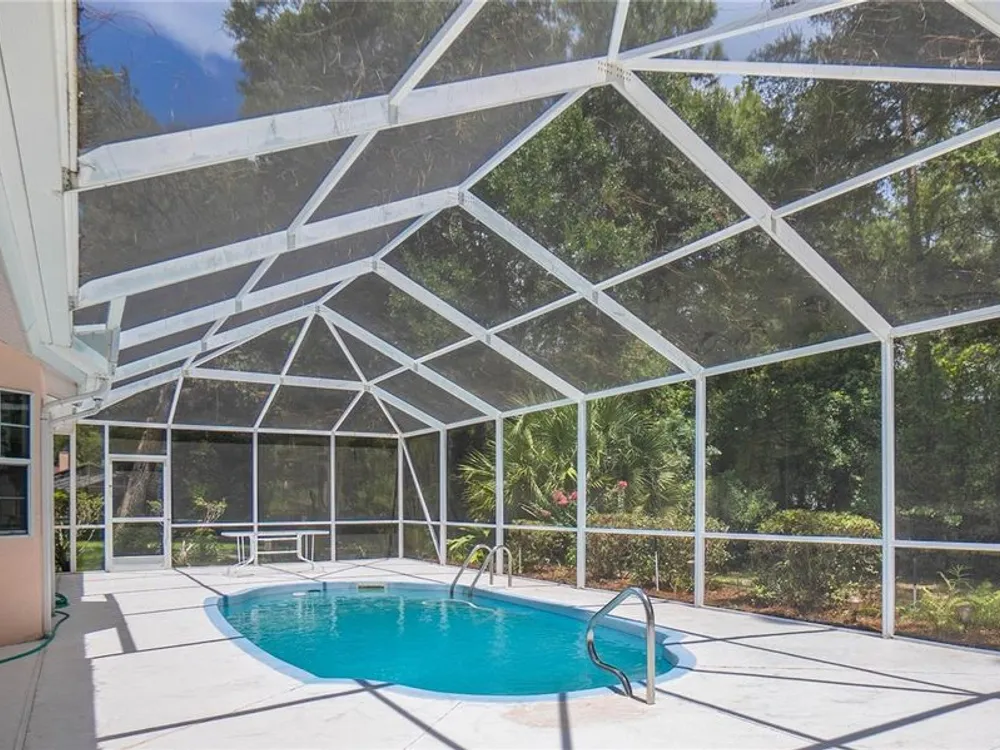This home is the sought-after and hard to find Oak Run model – the Capri Extended – including with side-load garage being offered by the original owner. It is rock solid concrete block and stucco construction. Covered patio, 10’ x 24’ swimming pool with large, screened pool enclosure on 68’ x 16’ concrete deck. Private back yard with natural foliage for quiet and privacy. No homes are behind the house. French doors open to the very large primary bedroom with vaulted ceiling and fan. Attached en-suite bath with dressing table vanity, tub, walk-in shower and block glass. Three large double-pane glass sliding doors opening directly on to the pool. Kitchen has high ceiling, wood cabinetry and updated stainless appliances including electric range with exhaust hood, refrigerator and dishwasher, as well as track lighting and recessed lighting. Adjoining roomy eat-in breakfast nook has bump out windows overlooking the pool. The dining room has bump out windows overlooking the front yard, with light fixture matching that of the foyer. Recessed front door has cathedral and side glass panel, and half-moon upper window -- all with vertical blinds. Tiled foyer with light fixture matching dining area. Roomy living room with vaulted ceiling and fan has three very large windows overlooking the pool. Double French doors open to the second bedroom with large walk-in closet, two front-facing windows and ceiling fan. Second bath has a walk-in tiled shower with seat, private toilet with separate door, vanity with mirror, mirrored medicine cabinet and linen closet with modular shelving, The second bath has extra door opening directly onto the covered patio and pool area. Utility room has closet and opens to plus-size two-car garage. This can easily be converted to the inside laundry room. Garage has automatic double door, washer and dryer, utility sink, electric water heater, electric panel, Toro 9-channel irrigation controller, and internet link-up et al. Oak Run resort style living features six swimming pools including year-round indoor pool with free swim, lane swim and water volleyball – as well as two modern fitness facilities with fitness classes. outdoor and indoor pickle ball, tennis courts, shuffleboard, bocce ball, billiards, card room, ceramics, library, neighborhood cable channel and more than 50 clubs to join. Features Oak Room Bar and Grill restaurant. Royal Oaks Golf course membership available. Modest HOA dues. 55 Plus community. Original tile roof and HVAC updated 2012. Seller offering $16,000 at closing to replace the tile roof with shingle. Estimate and all warranty information available.
