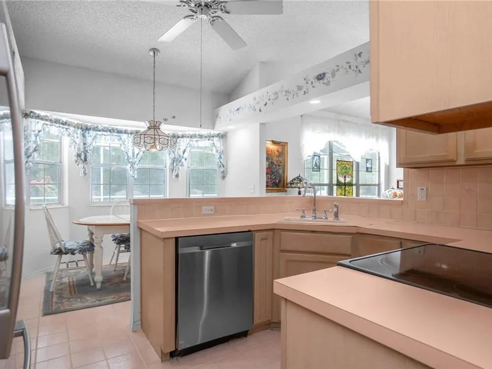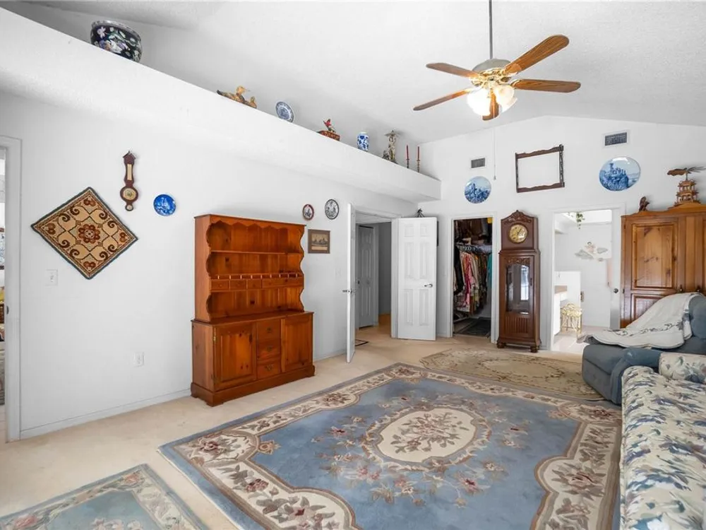 - Ceiling Fan(s), Eat-in Kitchen, High Ceilings, L-Shaped Dining Room, Open Floorplan, Main Level Primary, Solid-Wood Cabinets, Split Bedrooms, Thermostat, Vaulted Ceiling(s), Walk-In Closet(s)
