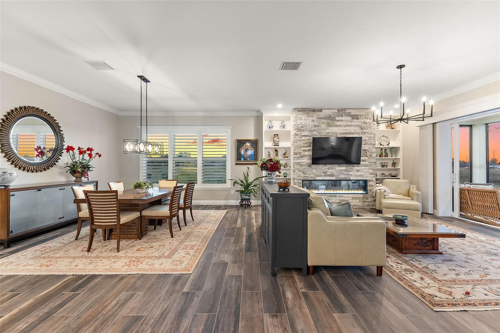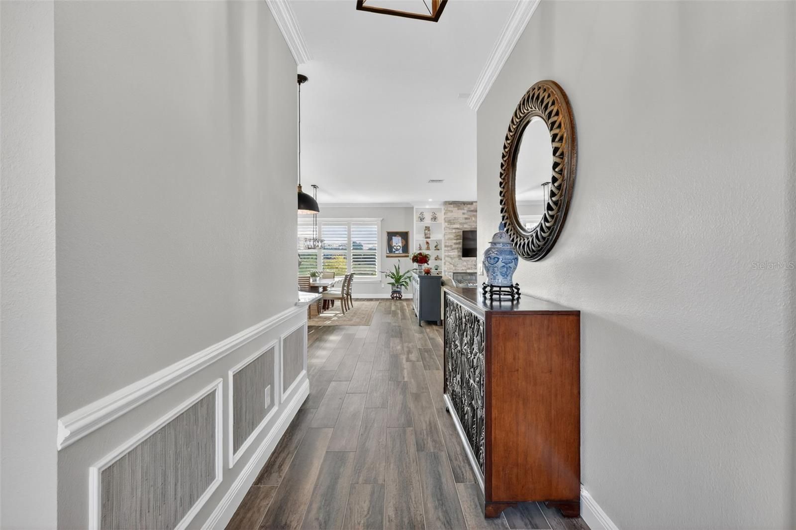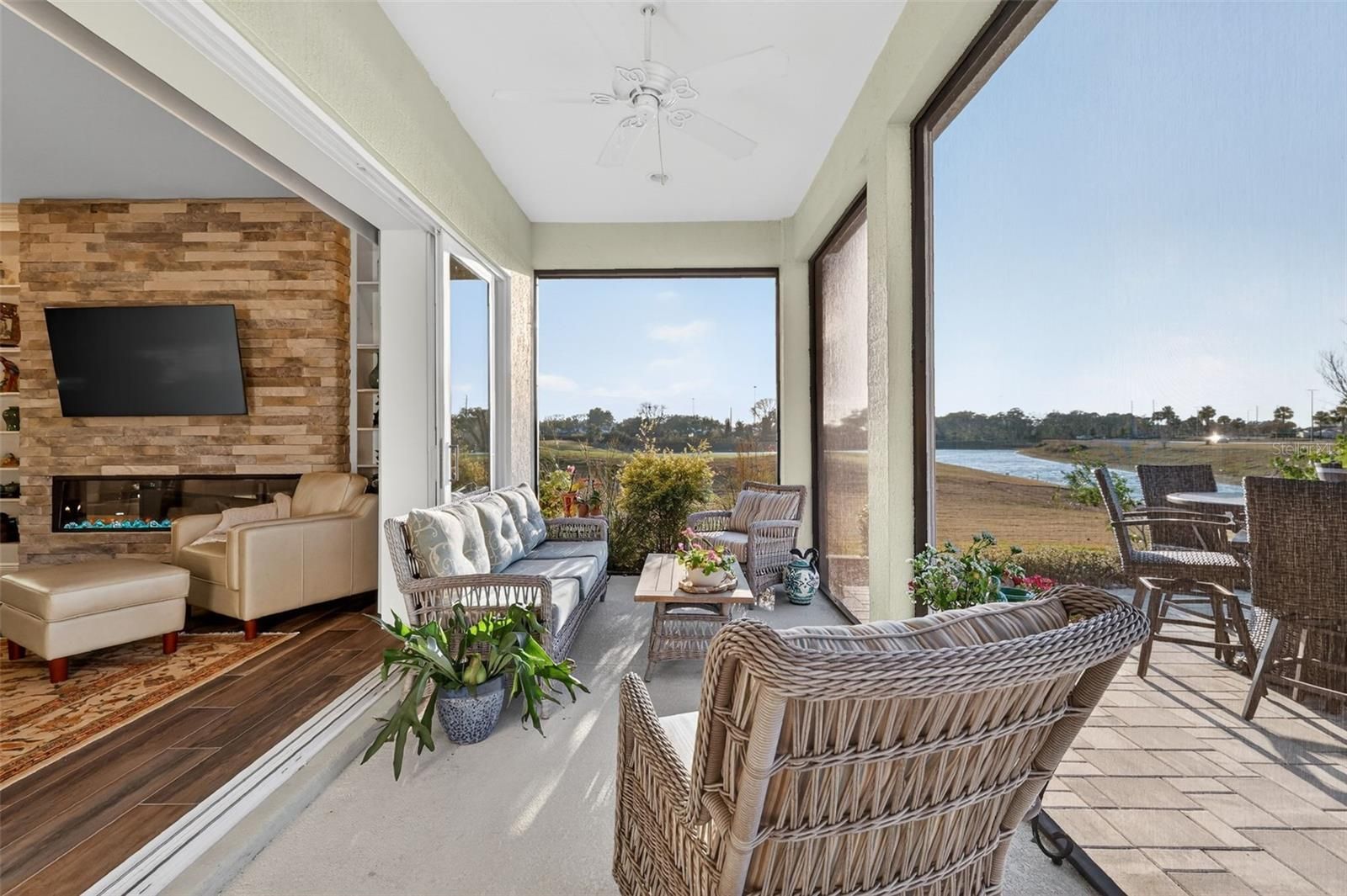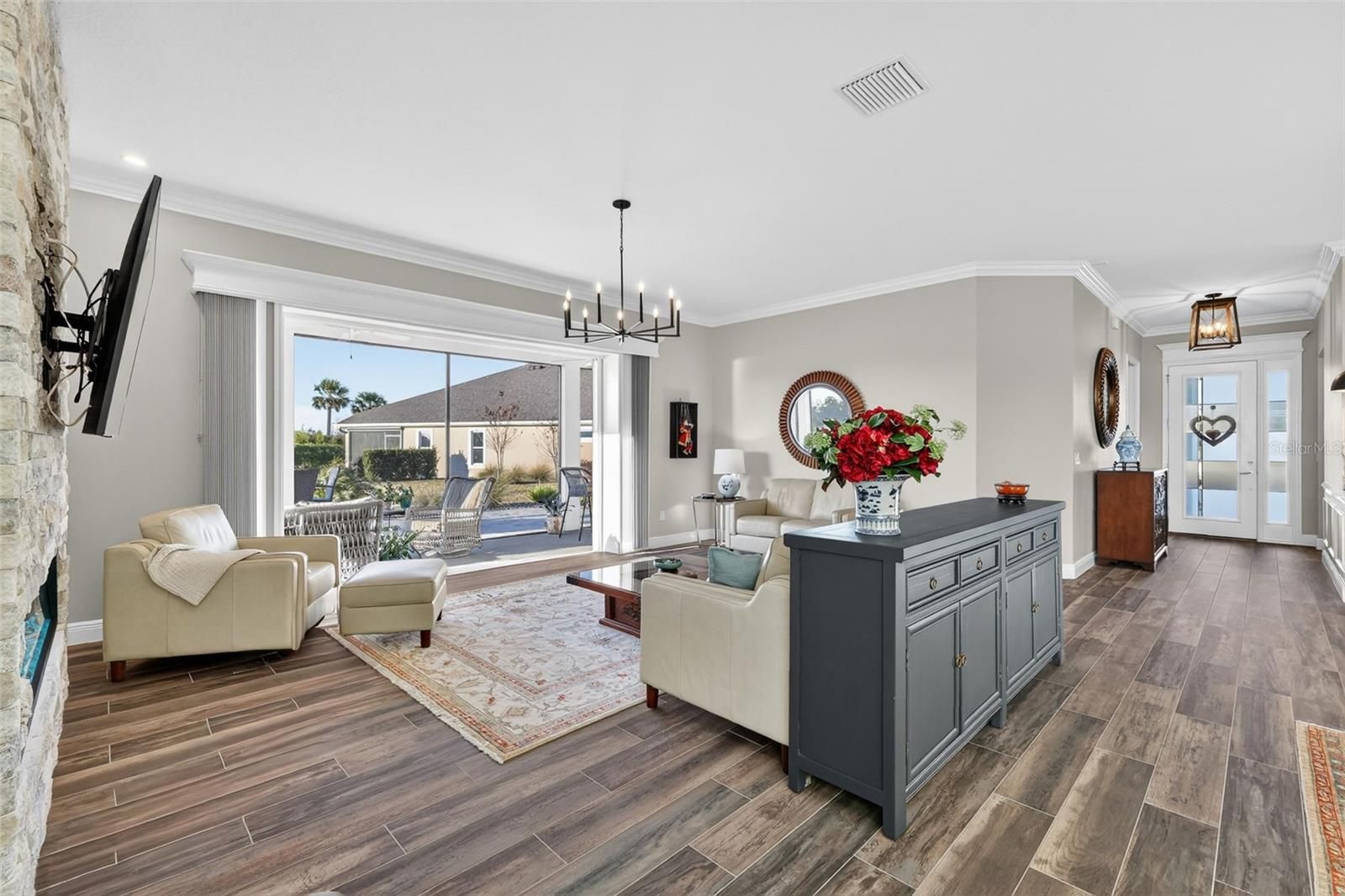 Welcome home! This beautiful 3/2 STRETCHED BEGONIA, former Premier Model Home features 10-foot ceilings, 8-foot elegant doors, and luxurious finishes, is situated in the Village of CASON HAMMOCK on a quiet CUL-DE-SAC. The home is located on the 14th green of Southern Oaks Championship Golf course and has a serene WATER VIEW. Arriving at the property you will notice the vibrant landscaping and charming brick driveway, creating an inviting first impression. As you step through the LEADED GLASS front door into the foyer, discover a breathtaking open floor plan with elegant PORCELAIN TILE FLOORS that flow seamlessly throughout. The kitchen is a chef's dream, featuring upgraded stainless-steel appliances, stunning QUARTZ countertops, a TILE BACKSPLASH, UPGRADED LIGHTING, ample storage, and a cozy eat-in area. The expansive breakfast bar comfortable seats 5, creating an inviting space for guests to enjoy a beverage and engage in conversation. It's also perfect for showcasing a delightful spread during gatherings. The spacious dining room can comfortably accommodate 8-guests, making it perfect for entertaining. The living room offers a relaxing retreat with direct views of the backyard through sliding glass doors that show case the spectacular SOUTHERN OAKS Championship Golf Course and WATER VIEWS. Relax in front of the beautiful BUILT-IN STONE FIREPLACE, perfect for the cool winter evenings. Retreat to the luxurious primary suite, featuring two beautiful walk-in custom closets and an en-suite bath with a ROMAN SHOWER, dual sinks, QUARTS countertops and separate commode. Pamper your guests with spacious accommodations, custom closet and a beautiful walk-in shower. The front bedroom boasts an additional 3-foot expansion for even more comfort. For your convenience, there is an INSIDE LAUNDRY ROOM with upper cabinets and a vanity. This home boasts many upgrades including: 2-foot EXPANSIONS in the guest bedrooms, living area and lanai, CROWN MOLDING throughout, UPGRADED LIGHTING, 6-inch BASEBOARDS, 10-foot CEILINGS, 8-foot DOORS, PLANTATION SHUTTERS and a NEST thermostat. Enjoy a peaceful evening on the expansive screened-in lanai, equipped with TELESCOPING SLIDERS and MOTORIZED BLINDS. The screened in lanai expands onto an open paved patio, perfect for watching the sun set and sitting by the outdoor firepit. The outside concrete pad is perfect for grilling. Additionally, the home includes a 2-car garage and a GOLF CART GARAGE offering plenty of storage. This home is in the perfect location for an active lifestyle as its close to Cason Hammock Rec Center, Hawkins Neighborhood Pool, Aviary Rec Center & Pool, Ezell Regional Rec Center & St. Catherine Neighborhood Pool & Rec Center. Golf enthusiast will enjoy playing the Southern Oaks and Shallow Creek Championship Golf courses, Bellaire Executive Golf course, and Mickylee Pitch and Putt. Minutes from the Market at Sawgrass and Bexley Bridge that will take you over the turn pike to explore the new Eastport Town Square.