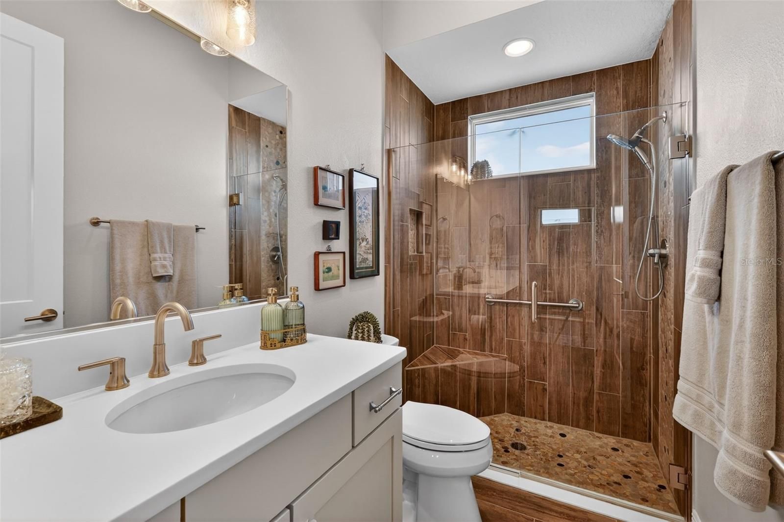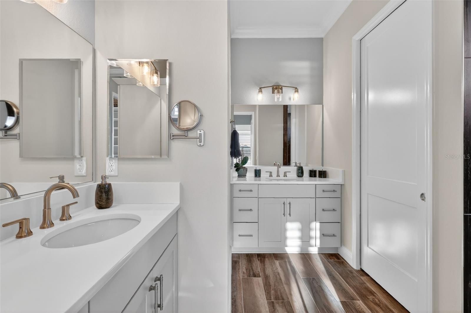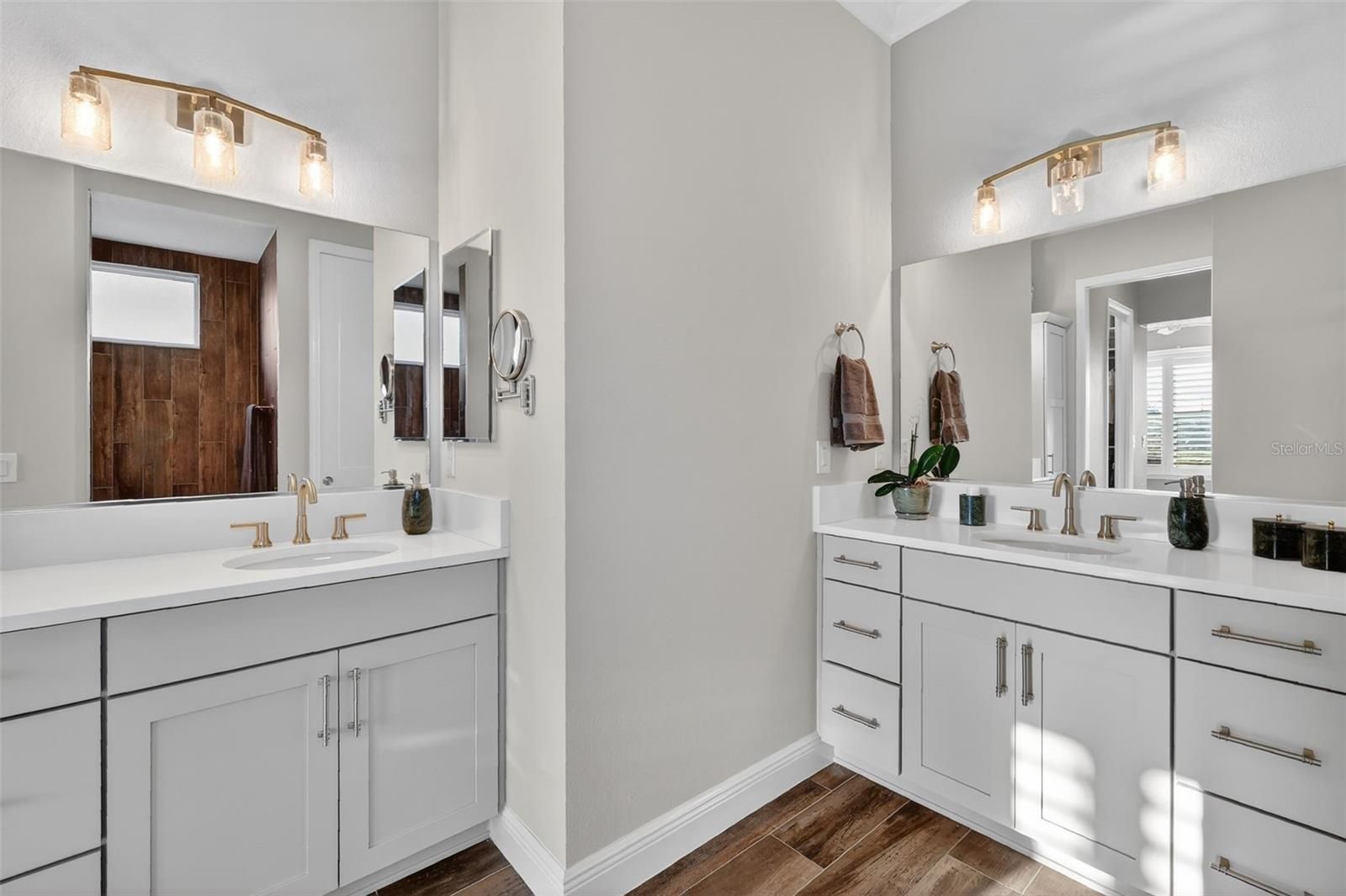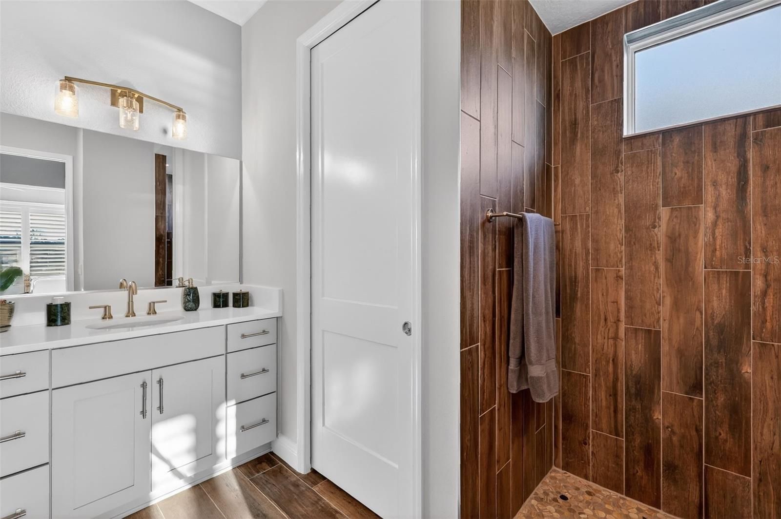 Welcome home! This beautiful 3/2 STRETCHED BEGONIA, former Premier Model Home features 10-foot ceilings, 8-foot elegant doors, and luxurious finishes, is situated in the Village of CASON HAMMOCK on a quiet CUL-DE-SAC. The home is located on the 14th green of Southern Oaks Championship Golf course and has a serene WATER VIEW. Arriving at the property you will notice the vibrant landscaping and charming brick driveway, creating an inviting first impression. As you step through the LEADED GLASS front door into the foyer, discover a breathtaking open floor plan with elegant PORCELAIN TILE FLOORS that flow seamlessly throughout. The kitchen is a chef's dream, featuring upgraded stainless-steel appliances, stunning QUARTZ countertops, a TILE BACKSPLASH, UPGRADED LIGHTING, ample storage, and a cozy eat-in area. The expansive breakfast bar comfortable seats 5, creating an inviting space for guests to enjoy a beverage and engage in conversation. It's also perfect for showcasing a delightful spread during gatherings. The spacious dining room can comfortably accommodate 8-guests, making it perfect for entertaining. The living room offers a relaxing retreat with direct views of the backyard through sliding glass doors that show case the spectacular SOUTHERN OAKS Championship Golf Course and WATER VIEWS. Relax in front of the beautiful BUILT-IN STONE FIREPLACE, perfect for the cool winter evenings. Retreat to the luxurious primary suite, featuring two beautiful walk-in custom closets and an en-suite bath with a ROMAN SHOWER, dual sinks, QUARTS countertops and separate commode. Pamper your guests with spacious accommodations, custom closet and a beautiful walk-in shower. The front bedroom boasts an additional 3-foot expansion for even more comfort. For your convenience, there is an INSIDE LAUNDRY ROOM with upper cabinets and a vanity. This home boasts many upgrades including: 2-foot EXPANSIONS in the guest bedrooms, living area and lanai, CROWN MOLDING throughout, UPGRADED LIGHTING, 6-inch BASEBOARDS, 10-foot CEILINGS, 8-foot DOORS, PLANTATION SHUTTERS and a NEST thermostat. Enjoy a peaceful evening on the expansive screened-in lanai, equipped with TELESCOPING SLIDERS and MOTORIZED BLINDS. The screened in lanai expands onto an open paved patio, perfect for watching the sun set and sitting by the outdoor firepit. The outside concrete pad is perfect for grilling. Additionally, the home includes a 2-car garage and a GOLF CART GARAGE offering plenty of storage. This home is in the perfect location for an active lifestyle as its close to Cason Hammock Rec Center, Hawkins Neighborhood Pool, Aviary Rec Center & Pool, Ezell Regional Rec Center & St. Catherine Neighborhood Pool & Rec Center. Golf enthusiast will enjoy playing the Southern Oaks and Shallow Creek Championship Golf courses, Bellaire Executive Golf course, and Mickylee Pitch and Putt. Minutes from the Market at Sawgrass and Bexley Bridge that will take you over the turn pike to explore the new Eastport Town Square.