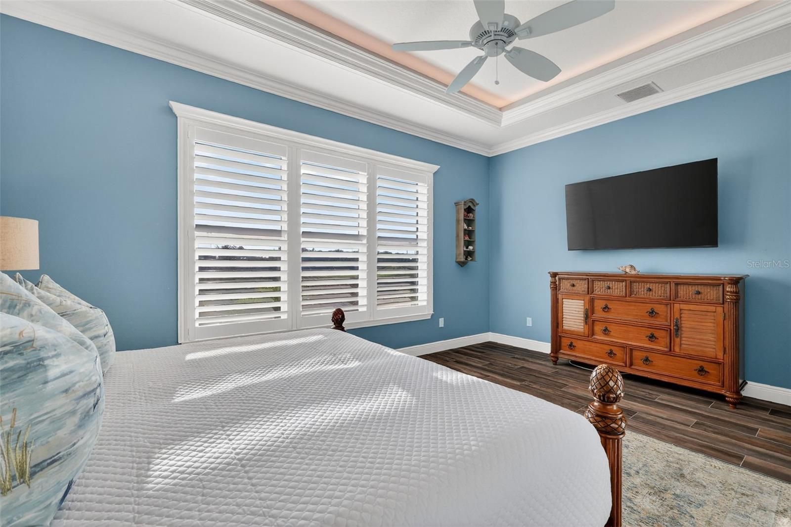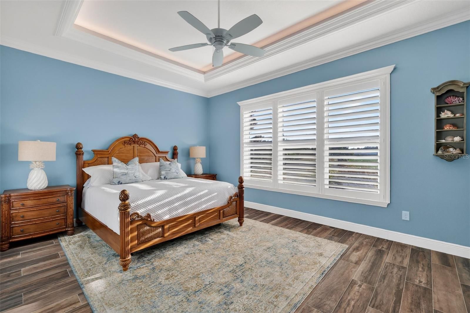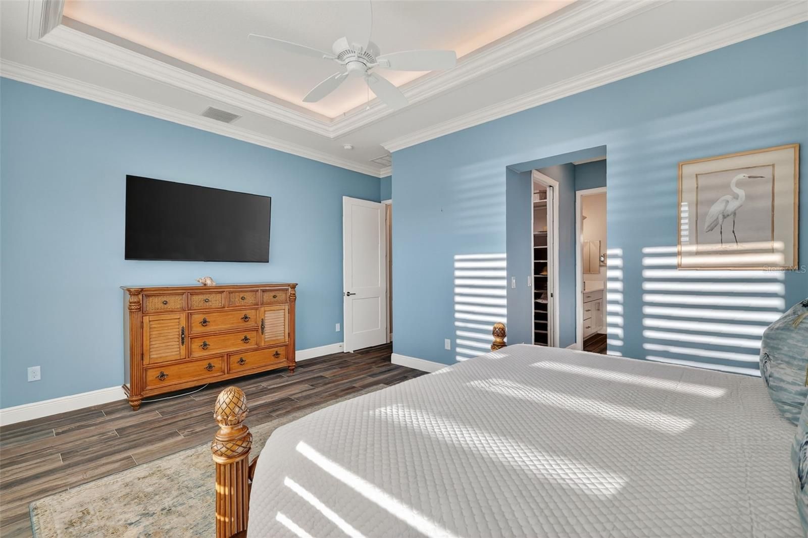 - Built-in Features, Ceiling Fan(s), Coffered Ceiling(s), Crown Molding, Eat-in Kitchen, High Ceilings, Living/Dining Room, Open Floorplan, Main Level Primary, Solid-Wood Cabinets, Split Bedrooms, Stone Counters, Thermostat, Tray Ceiling(s), Vaulted Ceiling(s), Walk-In Closet(s)