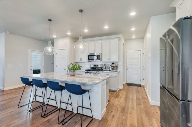 Come see for yourself, this BEAUTIFUL well kept home with lots of NATURAL light, has more than meets the eye. With granite countertops throughout, stainless steel appliances and a gas stove. The basement offers 9 ' EXTENDED basement ceilings with 7.1 wired surround sound. Smurf tubes in both the basement and living room for easy installation. 2' garage depth extension, 8' garage door with an EV charging outlet. Gas line to back patio for BBQ's or Firepits. Top down bottom up blinds throughout whole house! Walking distance to the Watercourse Pathway, Lookout Park, The Cove and Bespoke Bike Park. So many fun things to do so close to the house. Come see all that this Daybreak home and community has to offer! Square footage figures are provided as a courtesy estimate only and were obtained from county records. Buyer is advised to obtain an independent measurement.