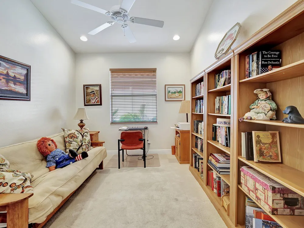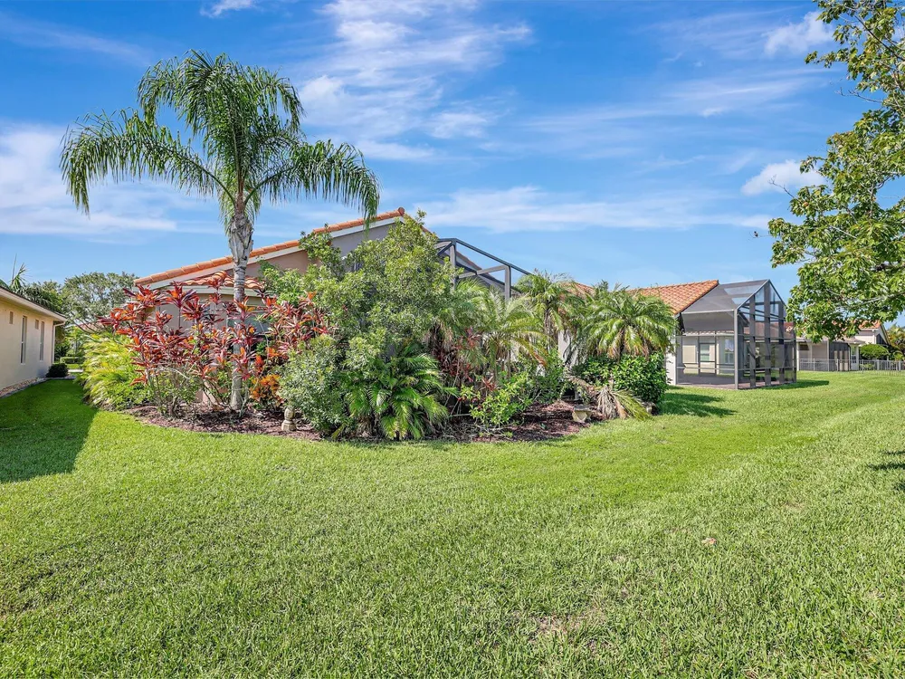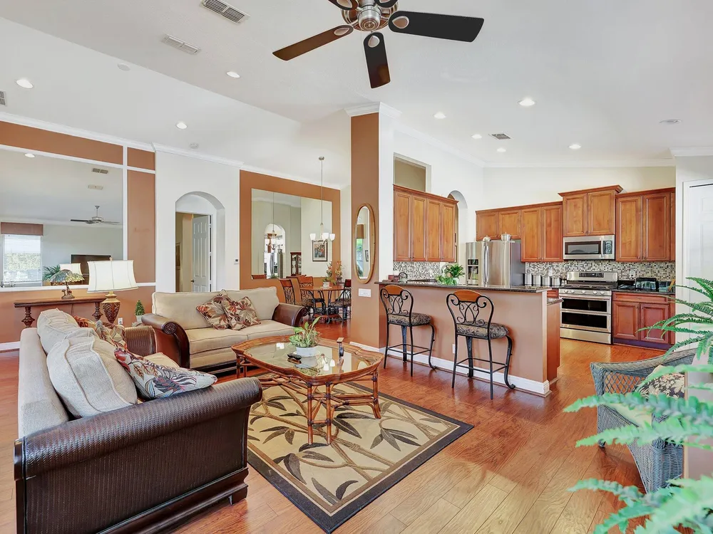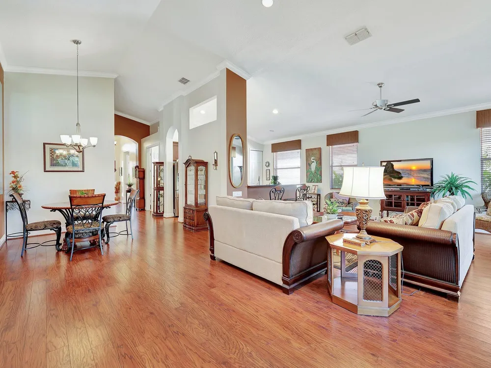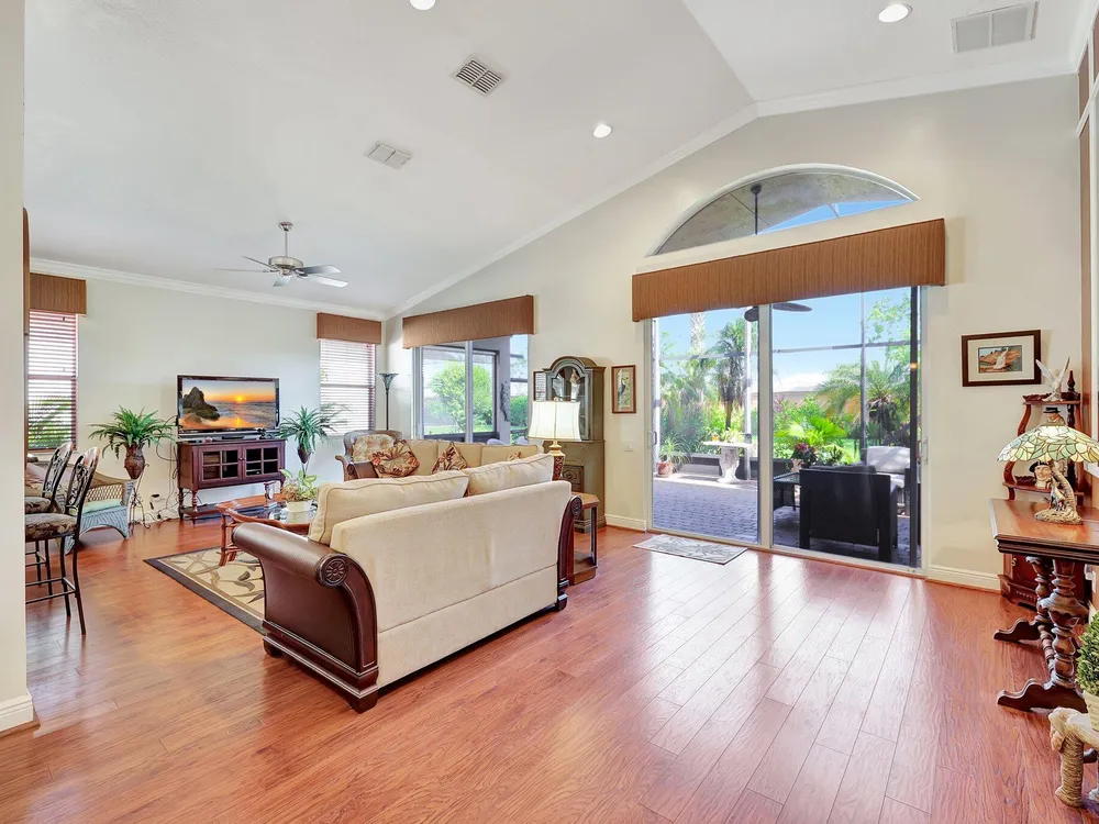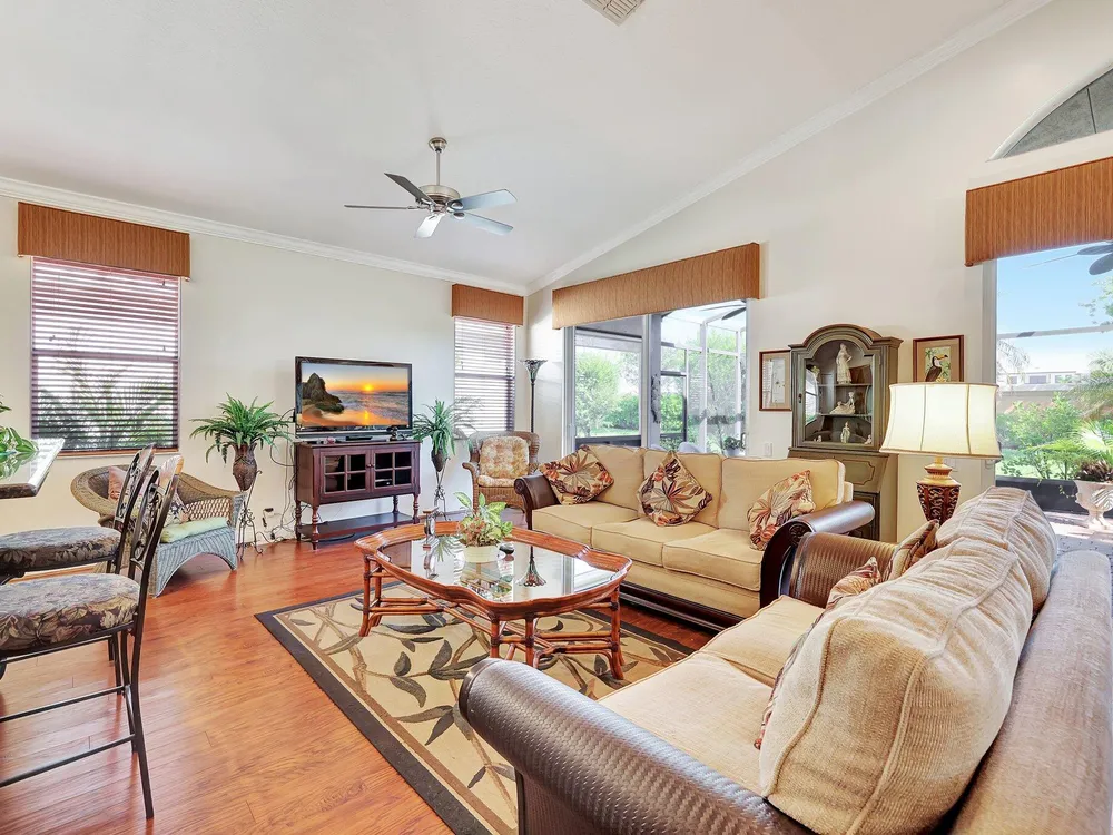 The spacious open-plan living area is bathed in natural light, highlighting the cathedral ceilings and elegant crown molding for a sophisticated feel. The kitchen boasts extra high cabinets offering ample storage and style. Step outside this 2/2 with a versatile den to the extended lanai surrounded by lush foliage providing a private and serene outdoor retreat. Nestled in a vibrant Community, residents enjoy access to a stunning Clubhouse with exciting events, clubs and top-tier amenities. Don't miss the opportunity to experience comfort, elegance and an active lifestyle in one perfect home. Stop looking - THIS is your home!
