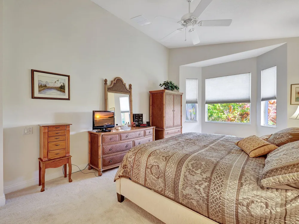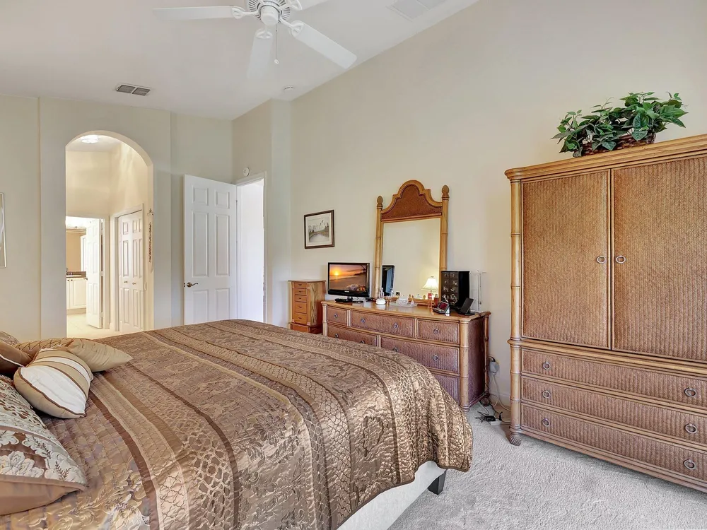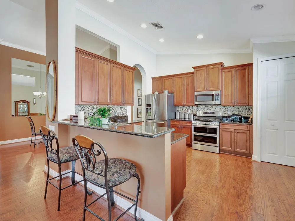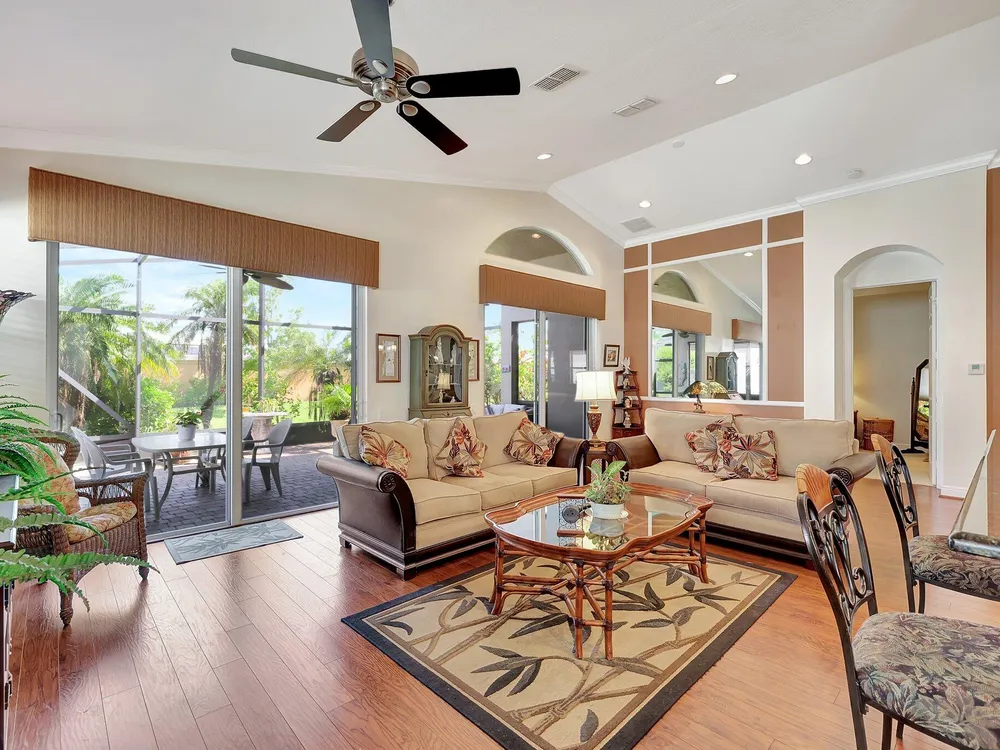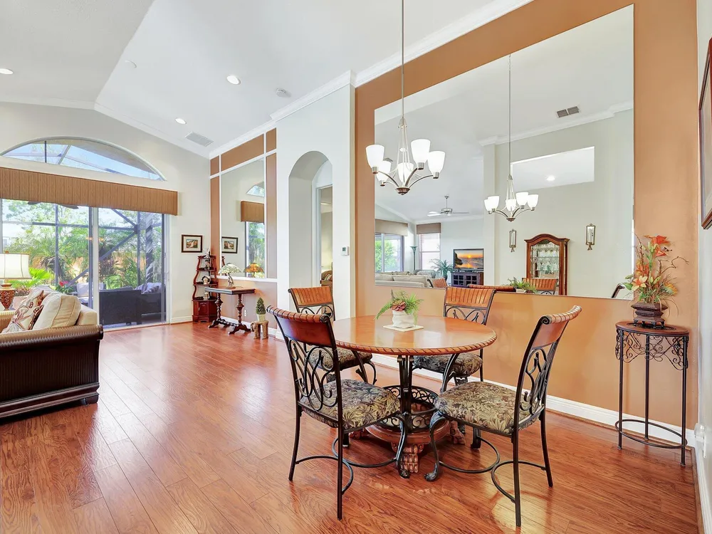 The spacious open-plan living area is bathed in natural light, highlighting the cathedral ceilings and elegant crown molding for a sophisticated feel. The kitchen boasts extra high cabinets offering ample storage and style. Step outside this 2/2 with a versatile den to the extended lanai surrounded by lush foliage providing a private and serene outdoor retreat. Nestled in a vibrant Community, residents enjoy access to a stunning Clubhouse with exciting events, clubs and top-tier amenities. Don't miss the opportunity to experience comfort, elegance and an active lifestyle in one perfect home. Stop looking - THIS is your home!