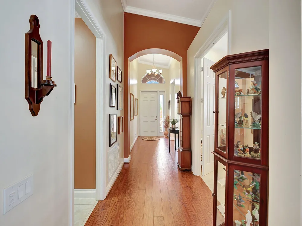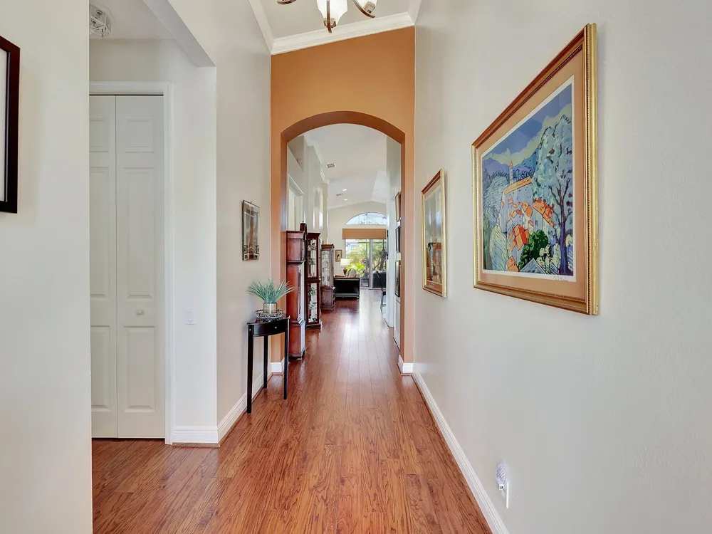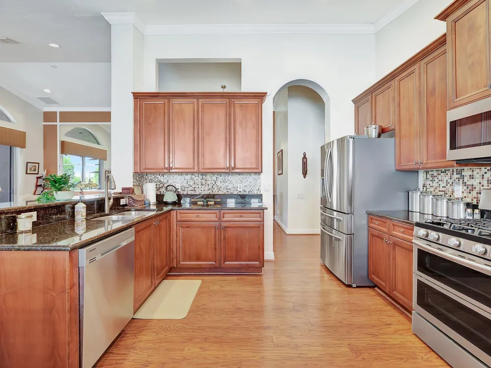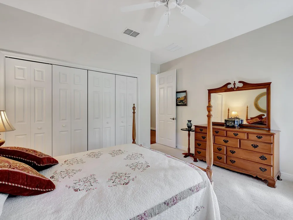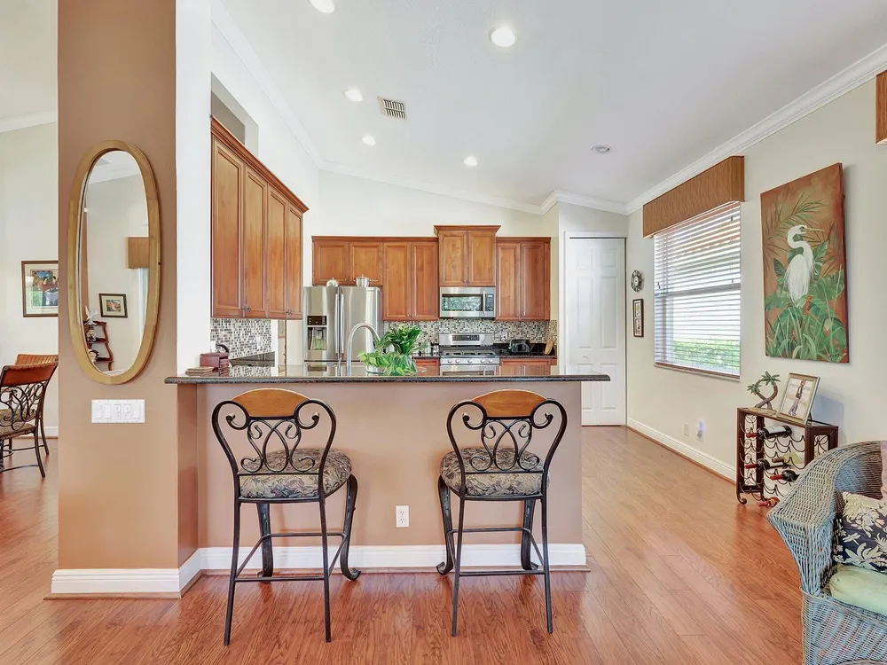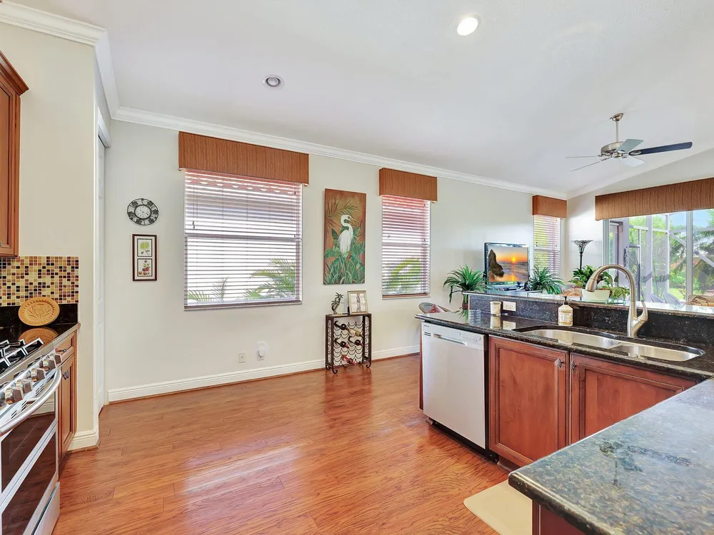 The spacious open-plan living area is bathed in natural light, highlighting the cathedral ceilings and elegant crown molding for a sophisticated feel. The kitchen boasts extra high cabinets offering ample storage and style. Step outside this 2/2 with a versatile den to the extended lanai surrounded by lush foliage providing a private and serene outdoor retreat. Nestled in a vibrant Community, residents enjoy access to a stunning Clubhouse with exciting events, clubs and top-tier amenities. Don't miss the opportunity to experience comfort, elegance and an active lifestyle in one perfect home. Stop looking - THIS is your home!