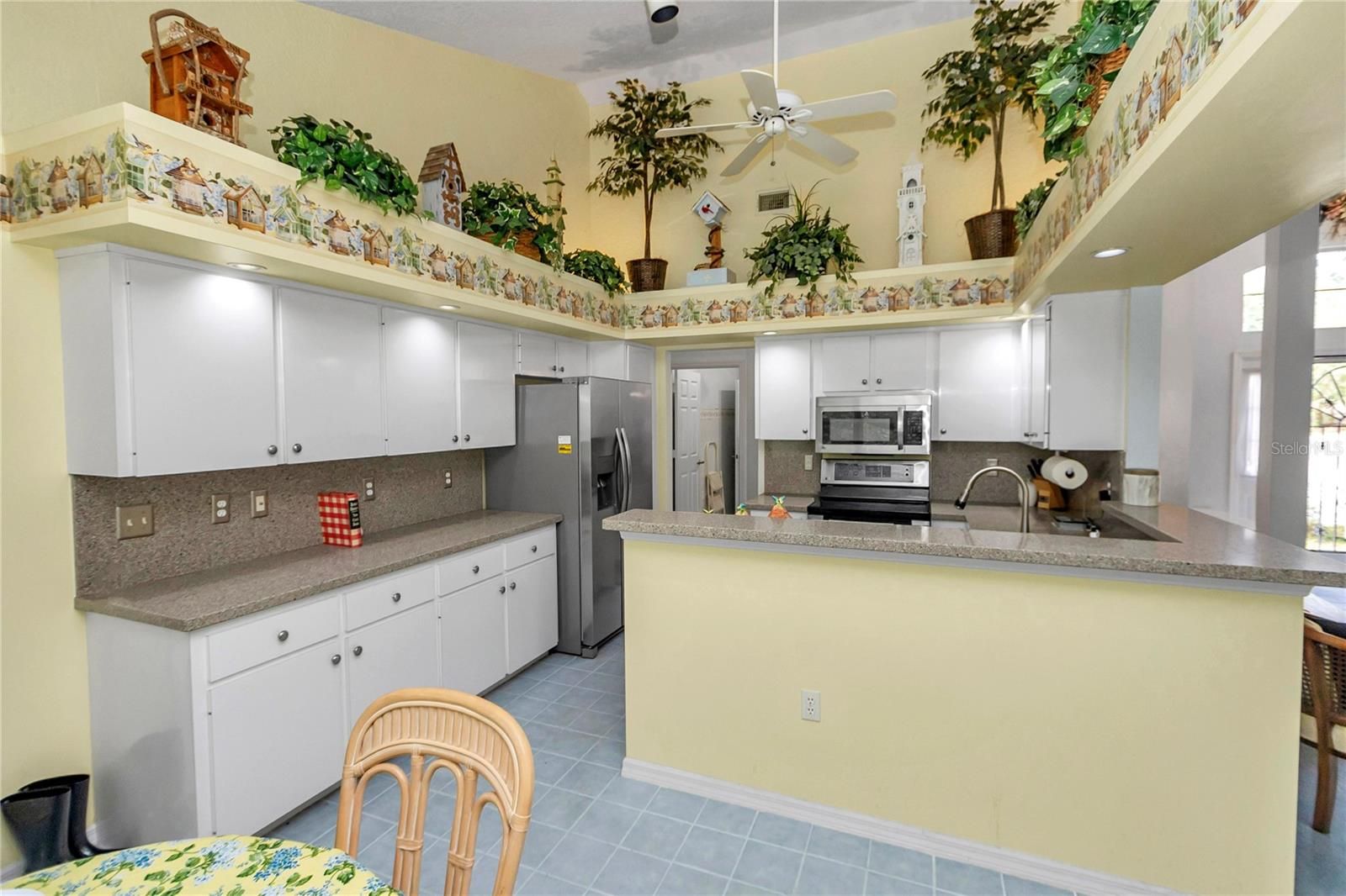 - Ceiling Fan(s), Eat-in Kitchen, High Ceilings, L-Shaped Dining Room, Open Floorplan, Main Level Primary, Split Bedrooms, Vaulted Ceiling(s), Walk-In Closet(s), Window Treatments