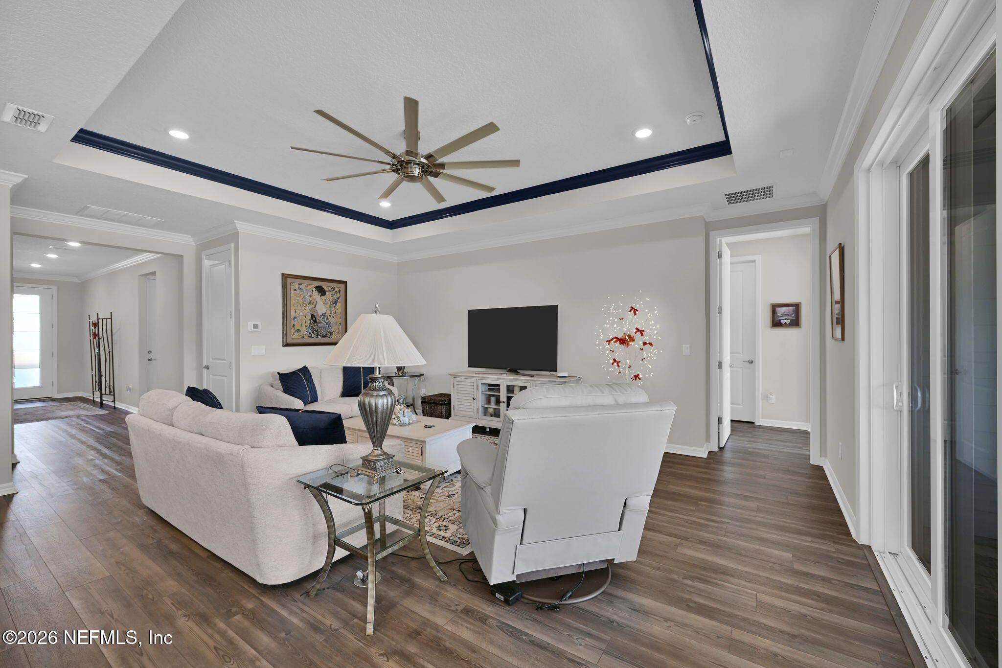 Welcome to 115 Lone Cypress Way, a beautifully upgraded 2,011 sq. ft. residence offering 2 bedrooms, 2 full baths, a half bath, and a versatile flex room behind glass doors for added privacy. Thoughtfully designed with luxury vinyl plank flooring throughout, crown molding in all living areas, and upgraded paint, this home blends comfort with refined style. The chef's kitchen features 42'' soft-close cabinetry, quartz countertops, tile backsplash, brushed nickel hardware, a canopy vent hood, and premium KitchenAid stainless steel appliances. The owner's suite showcases a tray ceiling, designer accent wall, motorized shades, and two custom walk-in closets, while the spa-like bath offers floor-to-ceiling tile, dual shower heads, and a private water closet. Outdoor living shines with a screened lanai, extended paver patio and driveway, epoxy-finished garage, and professionally enhanced landscaping. Every detail has been carefully curated for elevated everyday living.