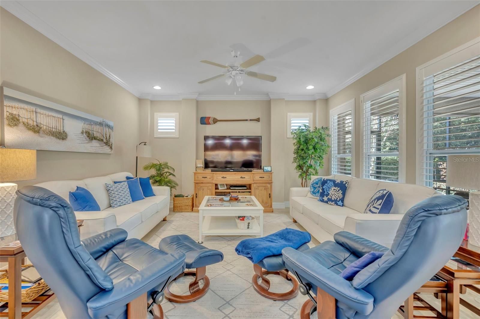 Come see this beautifully maintained 2-bedroom, 2-bath home featuring a den/office and additional flex space, offering versatility for work, hobbies, or guests. This coastal-inspired residence showcases thoughtful upgrades, tasteful finishes, and added square footage that enhance both comfort and functionality. Inside, you'll discover soft neutral tones throughout the main living areas, creating a bright, open, and inviting atmosphere. The chef-inspired kitchen features granite countertops, a ceramic tile backsplash, a spacious dining area, and a generous pantry—perfect for everyday living and entertaining. Enjoy year-round relaxation in the all-season enclosed lanai, an ideal space for morning coffee, quiet reading, or gathering with friends and family. Additional square footage has been thoughtfully incorporated into the breakfast area, pantry, laundry room, and second bedroom, providing added convenience and functionality rarely found in similar homes.