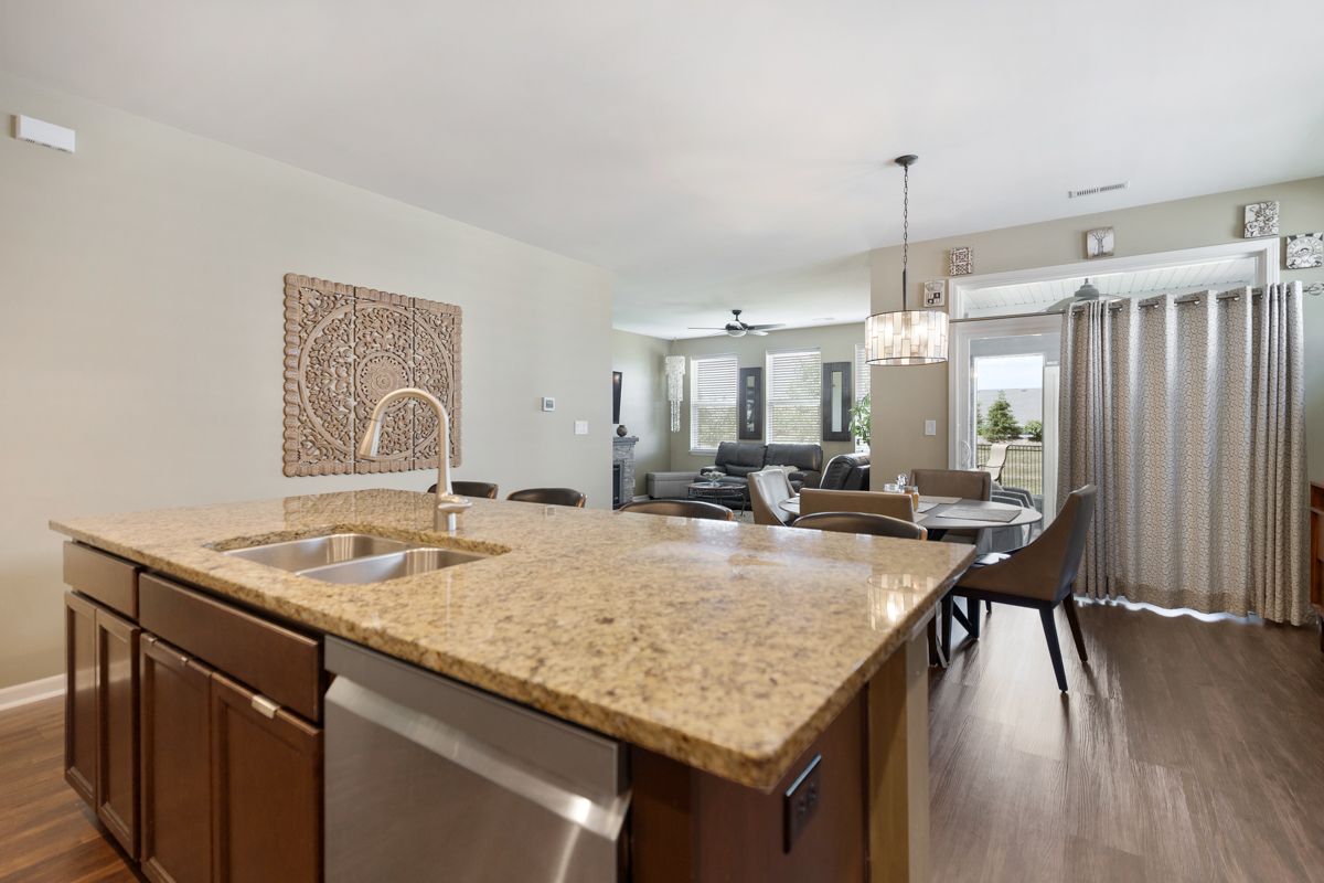 FABULOUS ARLINGTON MODEL OFFERING 2 BEDROOMS PLUS A DEN! OPEN CONCEPT WITH KITCHEN WITH 42" ESPRESSO CABINETRY, GRANITE COUNTERTOPS, EXPANDED ISLAND, PANTRY AND STAINLESS STEEL APPLIANCES! DINING AREA OPEN TO LIVING AREA AND A SCREENED IN PORCH - PRIMARY BEDROOM WITH WALK IN CLOSET AND FULL BATH WITH COMFORT HEIGHT DUAL SINKS AND TILED SHOWER - 2ND BEDROOM HAS A GUEST BATH JUST STEPS AWAY! FLEX ROOM/DEN - 2 CAR GARAGE - STONE/BRICK PATIO - BACKS TO BERM - LOW MAINTENANCE, PROFESSIONALLY LANDSCAPED IN THE CARILLON 55+ OR OLDER COMMUNTIY! ENJOY THE CLUBHOUSE, OUTDOOR POOL, TENNIS AND FITNESS CENTER! SO MUCH TO OFFER FOR THE ACTIVE ADULT LIFESTYLE! COME THIS THIS TODAY!