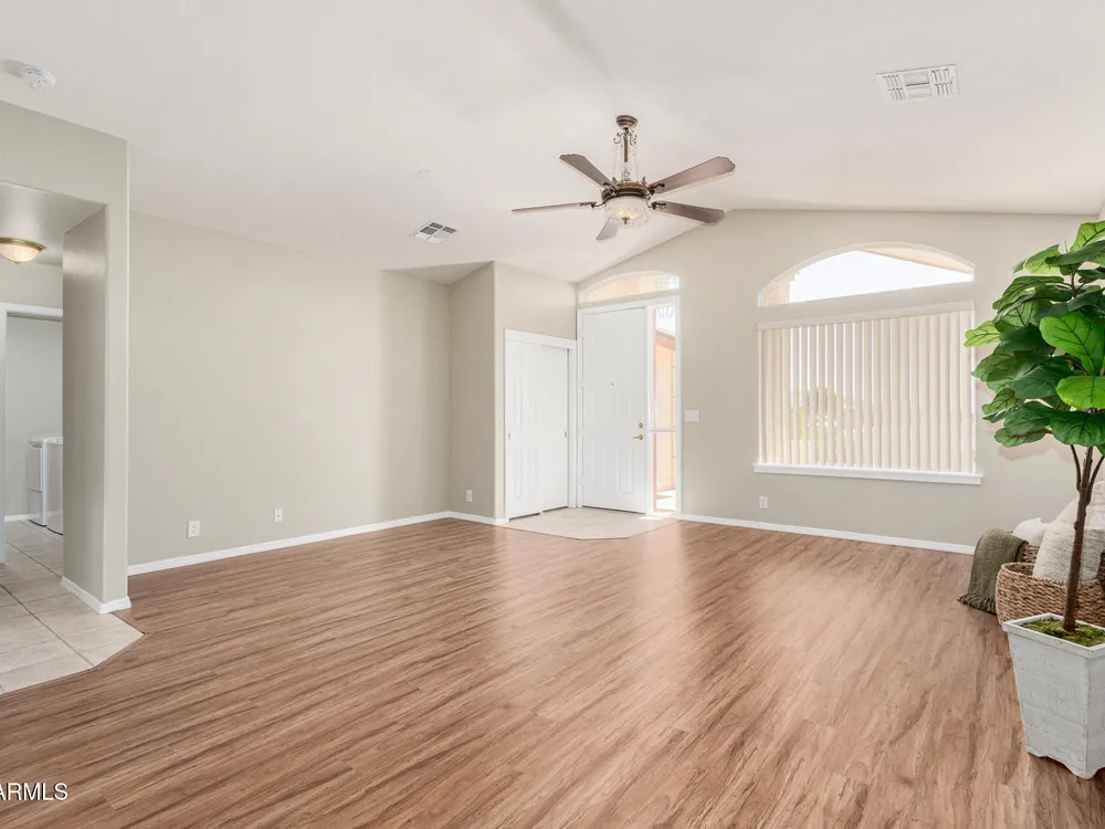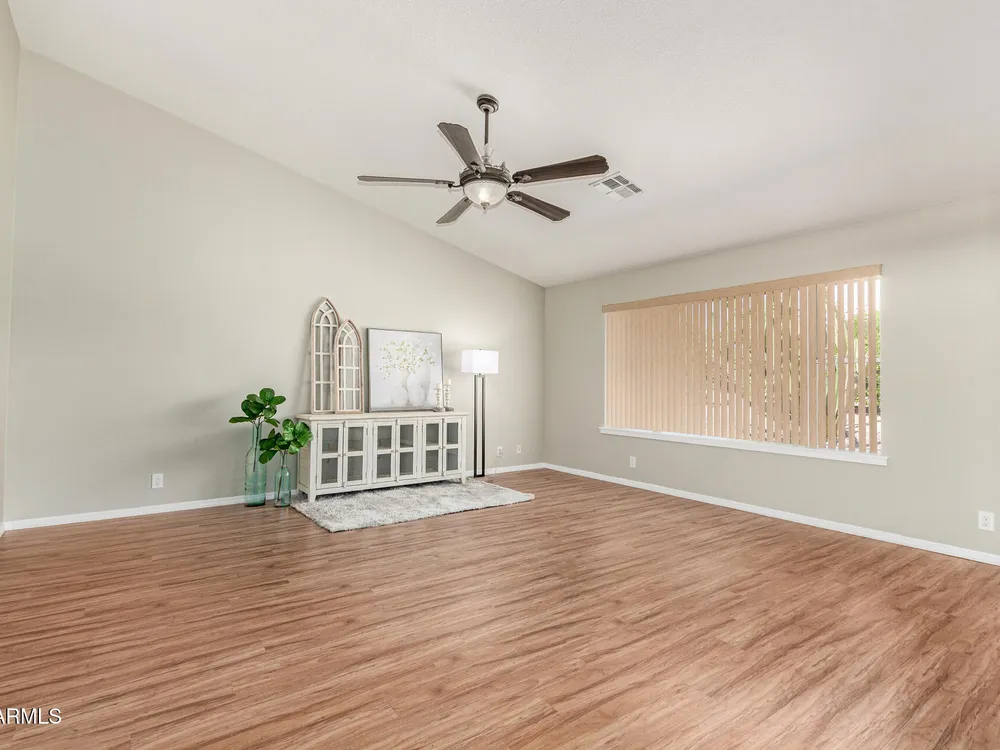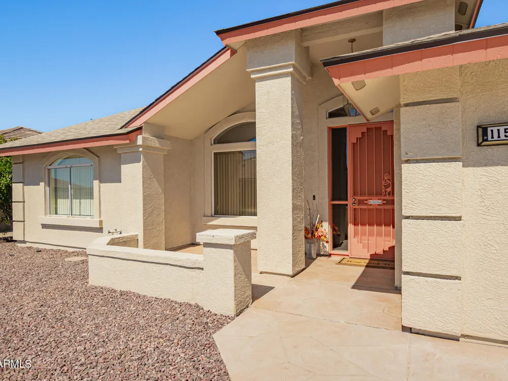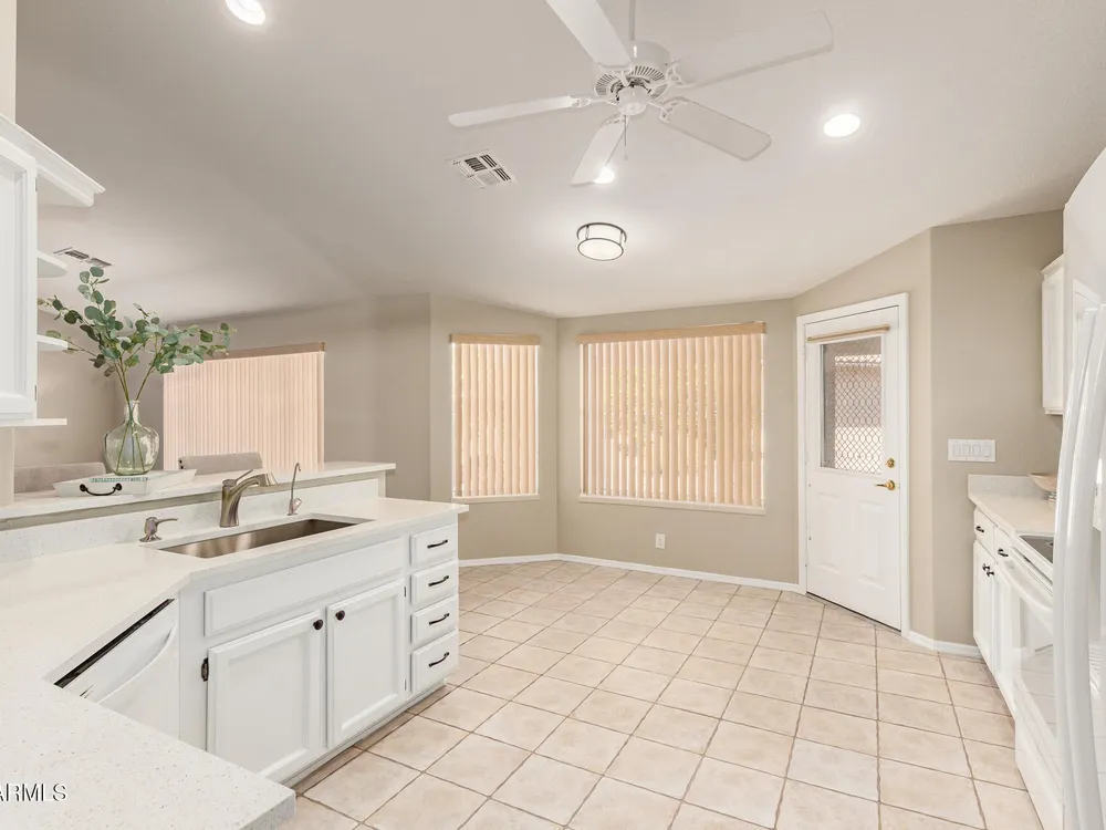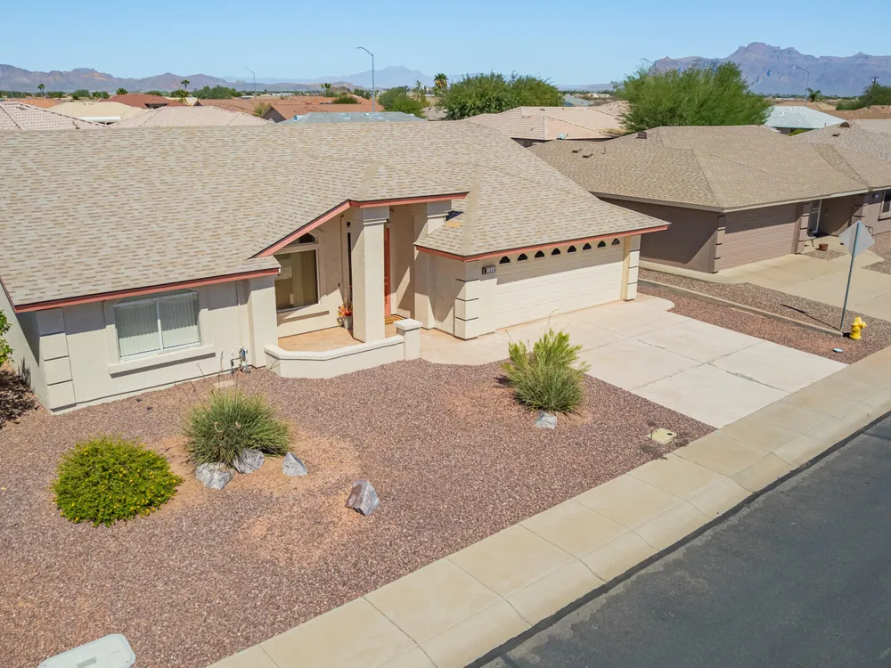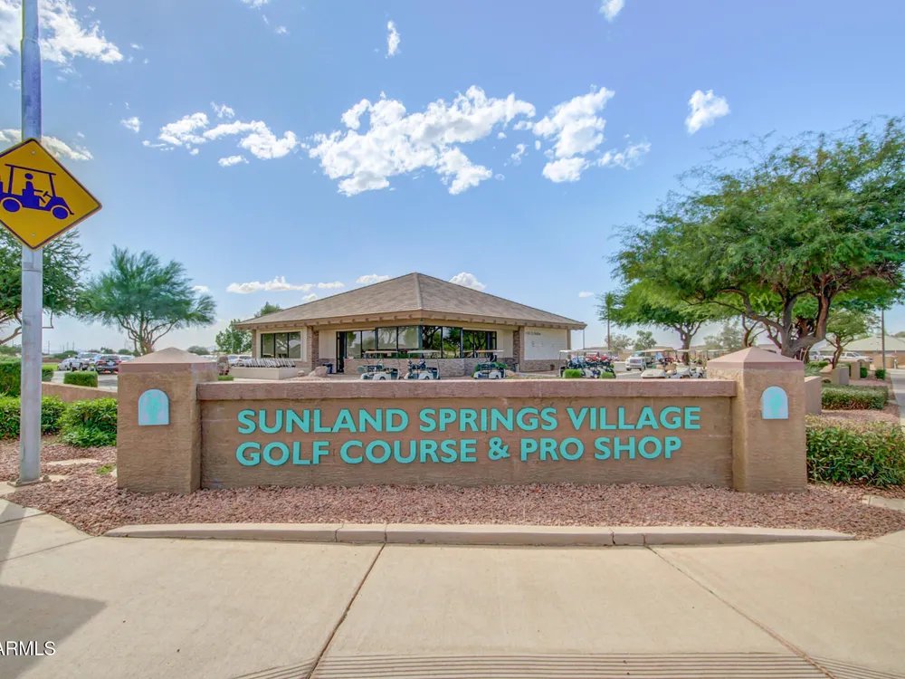 Updated home with golf course view without the price or flying golf balls! Recently replaced roof, A/C AND water heater, owned water softener & R/O system AND refrigerator, washer & dryer complete home's package*This turn key home is nestled in a serene & well-maintained community that welcomes you w/a balance of lifestyle & comfort*Open concept is ideal for entertaining, with formal & living spaces inviting conversation with the kitchen conveniently centered*Stylish kitchen appointments include white cabinets, quartz counters, single basin undermount sink, lots of counter space, storage and high top bar for optional seating*Split bedroom and bathroom invites guests or ideal roommate situation*Hard surface flooring throughout with no interior steps*Generous laundry room offers space for small desk or additional refrigerator and is tucked off hallway leading to oversized two-car garage*This N/S exposed, desirable interior homesite has it all*Designed for engaged, active residents, this 55+ home and community provide a modern, low-maintenance lifestyle without compromising style or comfort*Sunland Springs Village is a launchpad for your next chapter, surrounded by vibrant neighbors that may soon be friends*Bring your personal effects and see what the community has to offer; including a public 27 hole golf course, dog park, pools, spa, library, card/table games, ceramics, wood shop, fitness center, art & stained glass center, basketball, bocce ball, pickleball, tennis and shuffleboard courts*Conveniently located approximately 15 minutes to Mesa Gateway Airport AND about 40 minutes to Sky Harbor International Airport, freeway system, medical facilities, shopping, museums, theaters and restaurants provide very close options for optimal living!