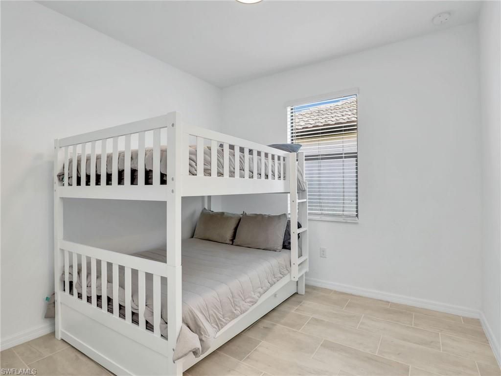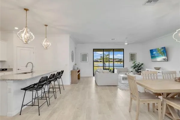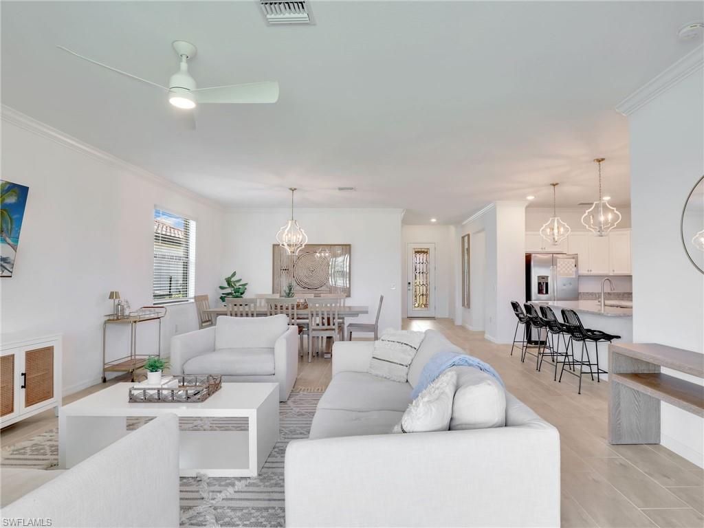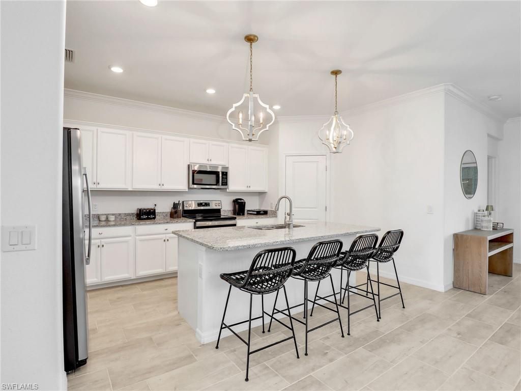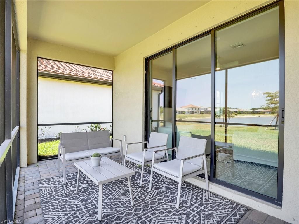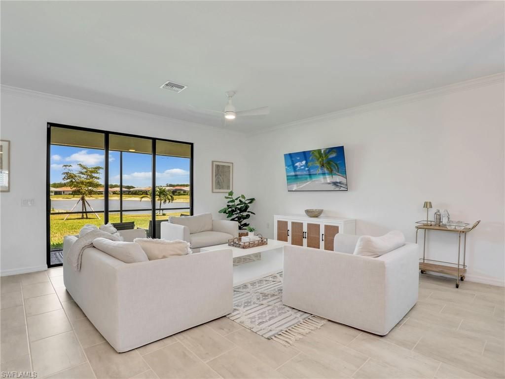 Welcome to this beautifully appointed bright, TURNKEY furnished one-story single family home in move in condition located in the highly sought after gated community of Arborwood Preserve! This Venice floor plan offers 1,852 square feet of open concept living space and has a light and bright northeast exposure with tranquil lake view. Built in 2022, this meticulously maintained 3-bedroom, 3-bathroom residence features a large primary bedroom with a split bedroom layout with 1 ensuite bedroom & additional guest bedroom and detached bathroom. The spacious kitchen offers white cabinetry including pull-outs in lower cabinets, granite countertops, a large island with two overhead pendant lights, GE stainless steel appliances, a stainless-steel sink, and a spacious walk-in pantry. The home boasts 12x24 tile plank flooring throughout—NO CARPET—and is enhanced by crown molding in the main living areas, 9.4" ceilings, faux wood blinds throughout, and a glass front entry door. There is plenty of storage with 2 walk-in closets in the primary, an extra-large storage/linen closet near the separated guest bedroom & bathroom, and a coat closet by the front door. The great room sliders open to a screened lanai with paver flooring, perfect for enjoying the serene outdoor views plus there is a nice sized backyard with plenty of room to add a pool. Additional features include a 2-car garage with epoxy floor, a separate laundry room with wire shelving, a Ring doorbell camera & Ring door sensors, and a charming front porch under a durable tile roof. This community also features sidewalks, streetlights, and is NOT IN A FLOOD ZONE. Residents of Arborwood Preserve enjoy resort-style amenities including a Town Center clubhouse with a community rock waterfall pool, lap pool, community spa/hot tub, tennis & pickleball courts, lighted bocce ball courts, a movie theatre, fitness center, yoga studio, aerobics room, a hobby/craft room, multiple card rooms, a library, a fire pit, internet café with complimentary coffee, on-site restaurant and bar, outdoor dining areas, and an active social calendar managed by an activities director. This community is centrally located tucked away off the Treeline corridor just minutes from RSW Airport, Red Sox and Twins ballparks, Hertz Arena, FGCU, shopping, dining, and easy access to I-75. With its exceptional amenities and prime location, this move-in ready home is not to be missed!