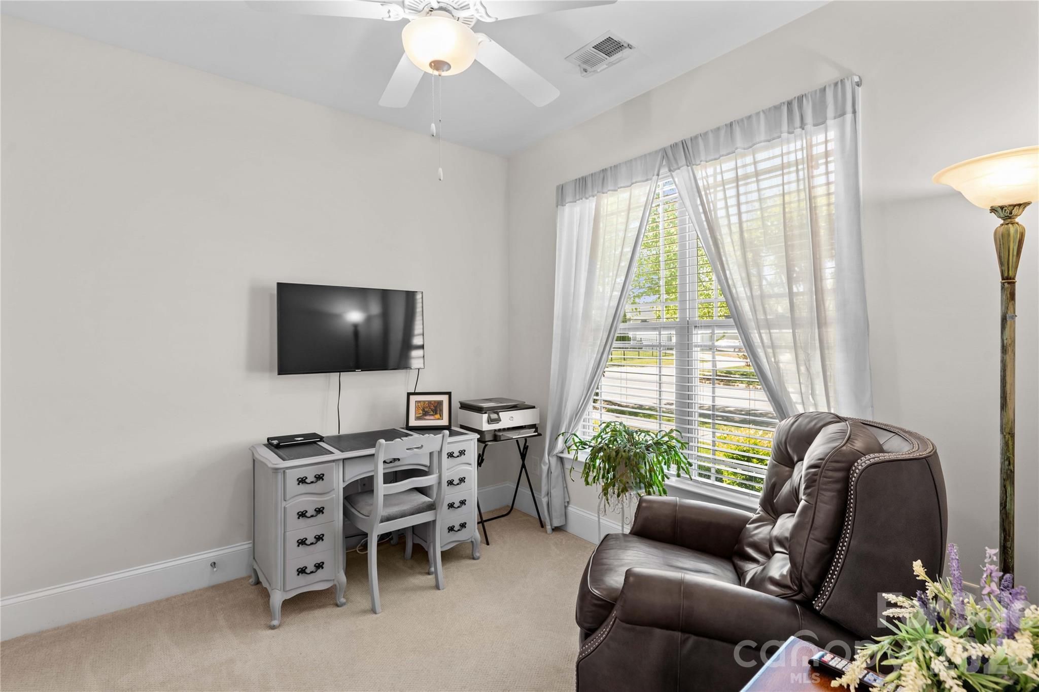 Charming and perfectly sized, this beautifully maintained home sits on a premium lot in the highly sought after 55+ community of Baileys Glen. Though designed with a smaller footprint, the open, thoughtfully planned layout lives large and offers an effortless flow. The kitchen features granite countertops, under cabinet lighting, stainless steel appliances, and a long breakfast bar ideal for casual dining or entertaining. It opens to a dining area framed by crown molding, wainscoting, and abundant windows that fill the space with natural light. The cozy living room centers around a gas fireplace and showcases rich wood floors that run throughout the main living areas. The spacious primary suite includes two walk-in closets, providing exceptional storage. A split bedroom design places two secondary bedrooms at the front of the home along with a conveniently located full bath—perfect for guests or flexible use. Step outside to a serene backyard setting where the patio overlooks a beautifully landscaped yard and peaceful woods. An electric awning with built in lighting extends over the entire patio, allowing you to enjoy the outdoors comfortably even on the warmest days. Thoughtful upgrades include tinted windows for heat and glare control, a recirculating hot water system, attic cooling fan, solar tubes for added natural light, in ground irrigation, and blinds throughout. Baileys Glen offers an exceptional active adult lifestyle with resort style amenities—pool, tennis and pickleball courts, putting green, clubhouse, gym, and a wide variety of clubs including woodworking, gardening, and pottery. It’s a welcoming, tight knit community where neighbors connect easily and everyday living feels a little more joyful.