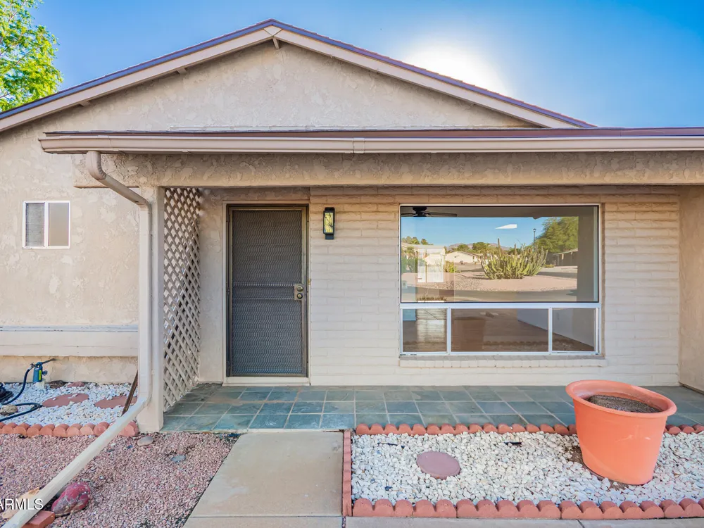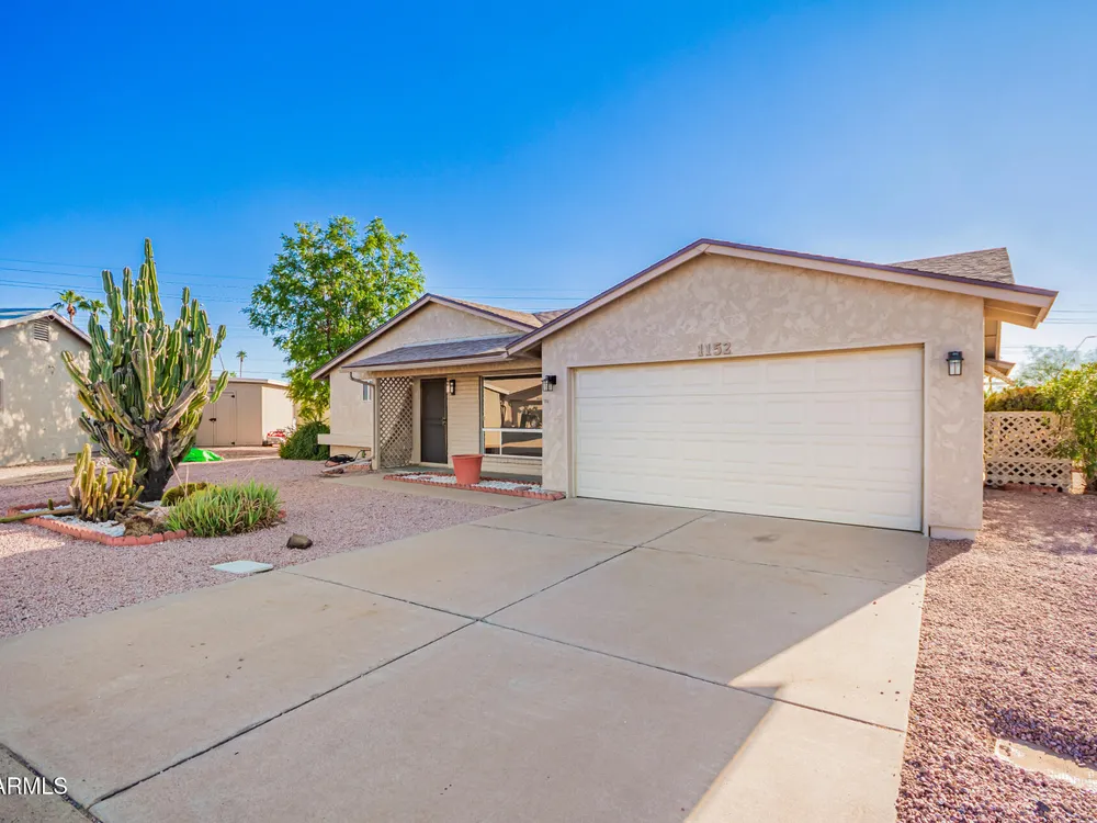 Remodeled 2 bed, 2 bath home in Fountain of the Sun—an active adult golf course community—featuring fresh interior & exterior paint, an oversized cul-de-sac lot & a spacious layout designed for comfort & convenience. The primary suite offers dual closets and a tiled roll-in shower, while the inviting living area includes a cozy fireplace & enclosed patio. The kitchen boasts a breakfast bar & generous eat-in space, perfect for casual dining. A separate laundry room includes built-in cabinets for added storage & functionality. The 2-car garage also features built-in cabinets, providing excellent organization and workspace options. With a newer roof & thoughtful upgrades throughout, this move-in-ready home blends style & accessibility in one of the area's most desirable 55+ communities.