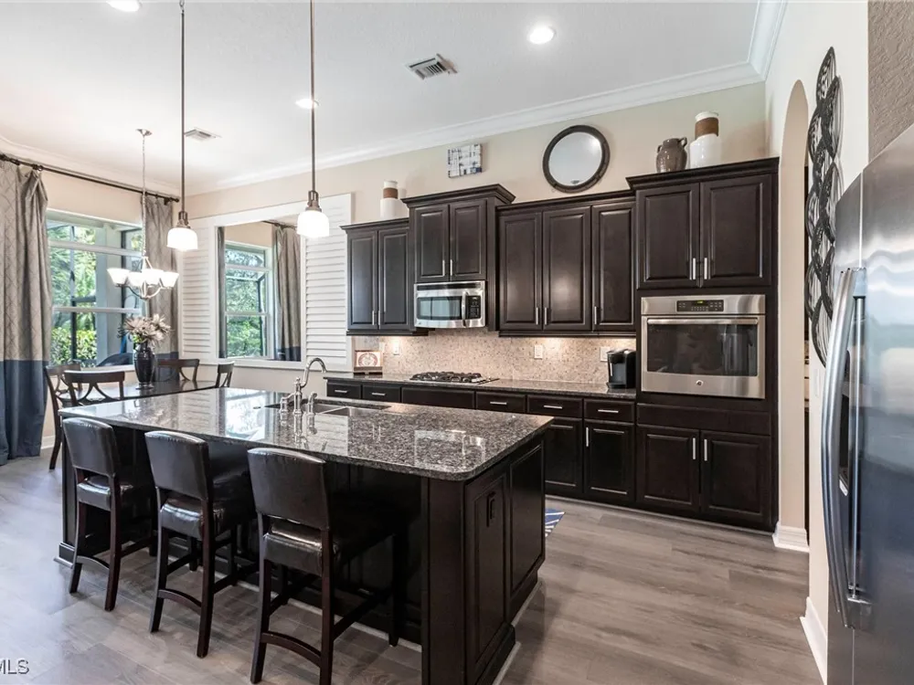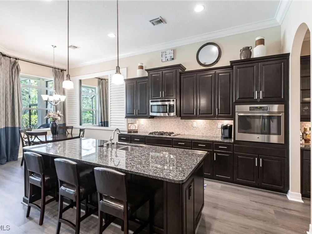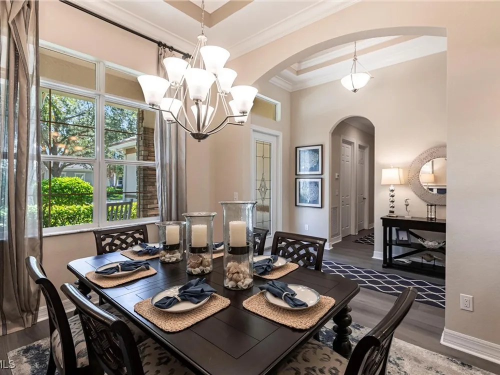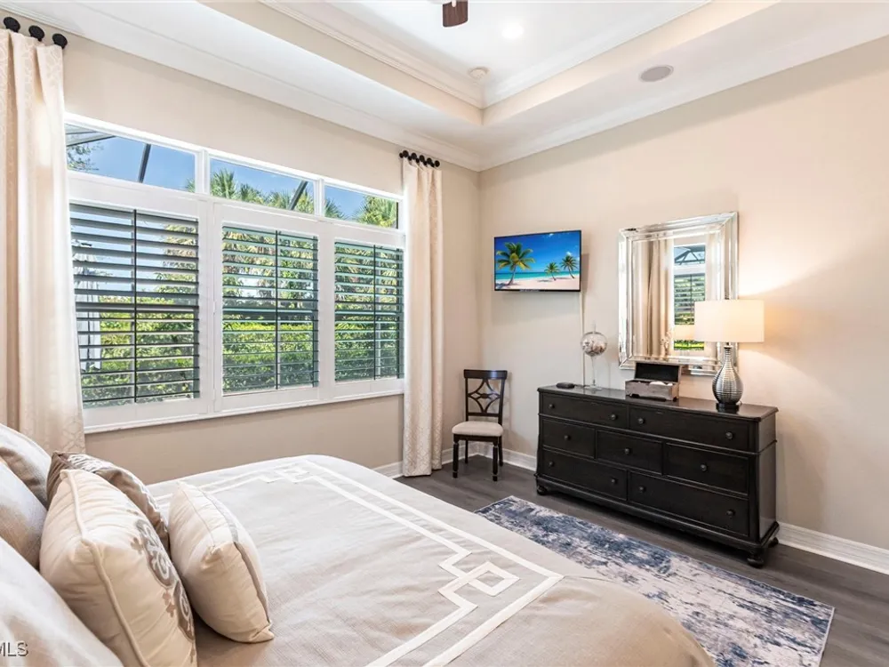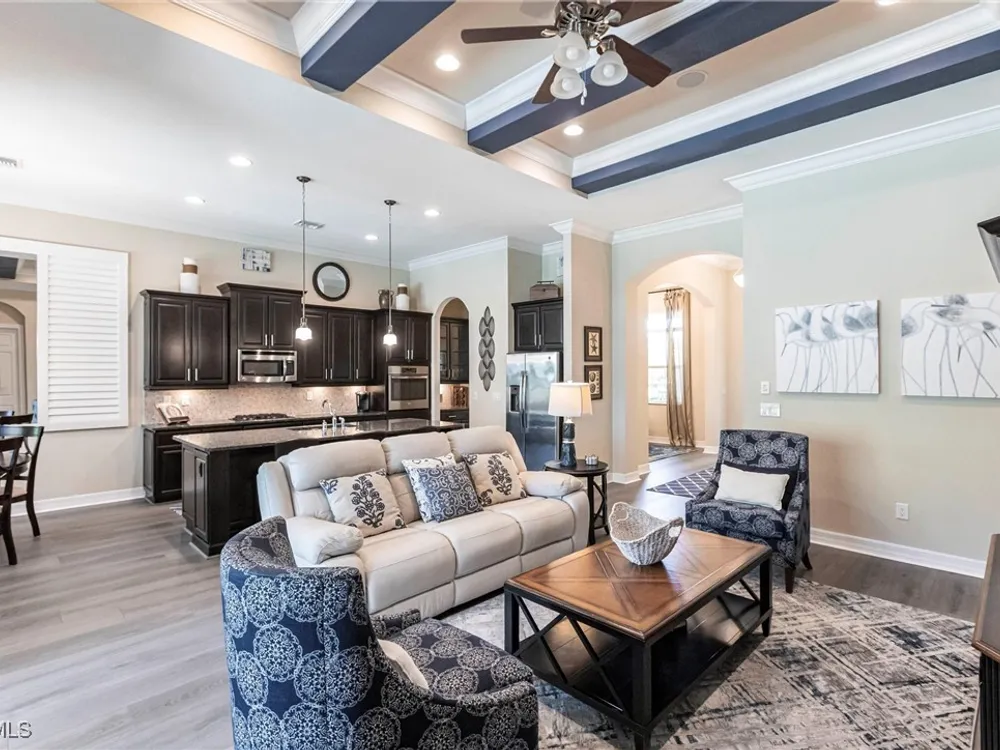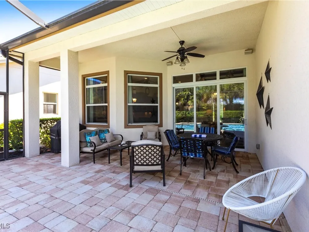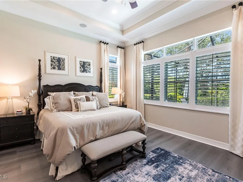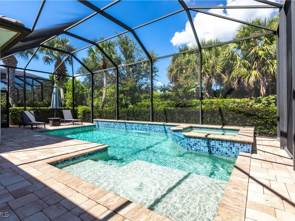 This stunning former Kolter Homes Anna model is a must-see, featuring a large heated pool and spa. What sets Kolter Homes apart from other builders is their commitment to quality and attention to detail. All homes boast 12ft ceilings, 8ft interior doors, and transom windows that flood the space with natural light. This home has been meticulously maintained and updated, with a new AC system featuring ultra-violet light, new LVP wood flooring in the main areas and primary bedroom, carpet in two additional bedrooms, plantation shutters, window treatments, two new toilets, a Butler’s Pantry, Blue Pearl Edge Granite countertops, Tumbled Marble Stone backsplash, crown molding throughout, 42-inch cabinets with under cabinet lighting, stainless steel appliances, and a wall oven with a natural gas cooktop. The primary suite is a luxurious retreat, with his-and-her walk-in closets, a spacious en suite bathroom with double vanities, a soaking tub, and a large walk-in shower. The private screened lanai boasts an auto-fill custom pool with an elevated jetted spa. The Anna model also features hurricane impact glass, coffered ceilings, laundry cabinets with a sink, and a brand new washer and dryer. Additional features include an alarm system with cameras, built-in surround sound, upgraded landscaping, and pavers on the driveway and lanai. Verandah, the community where this home is located, offers a wealth of amenities for residents to enjoy. These include two championship golf courses designed by Jack Nicklaus and Bob Cupp, a tennis complex, state-of-the-art fitness facilities, a resort-style heated community pool, pickleball, bocce, a dog park, kayaks, playground, multiple restaurants, and an active social calendar. Secure your place in paradise now by scheduling a viewing of this exceptional property.