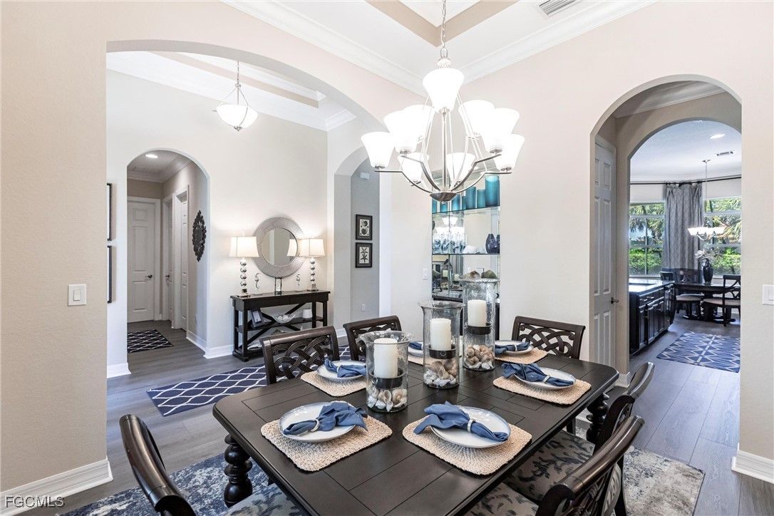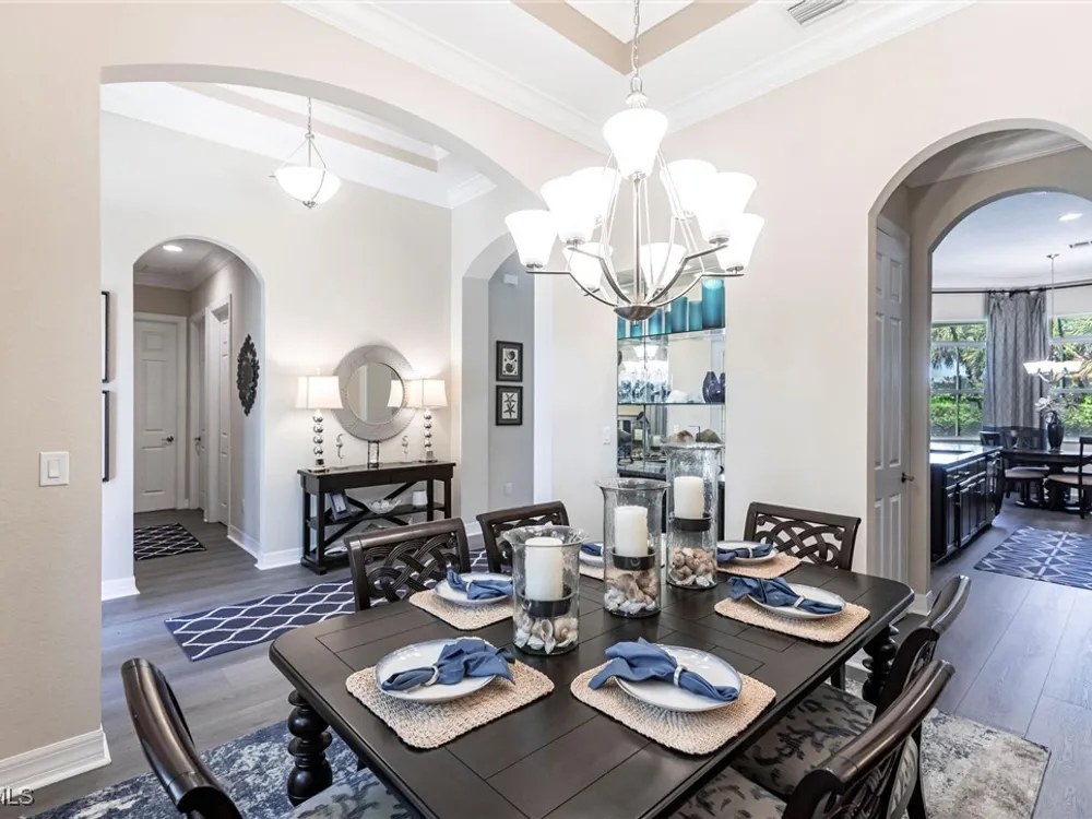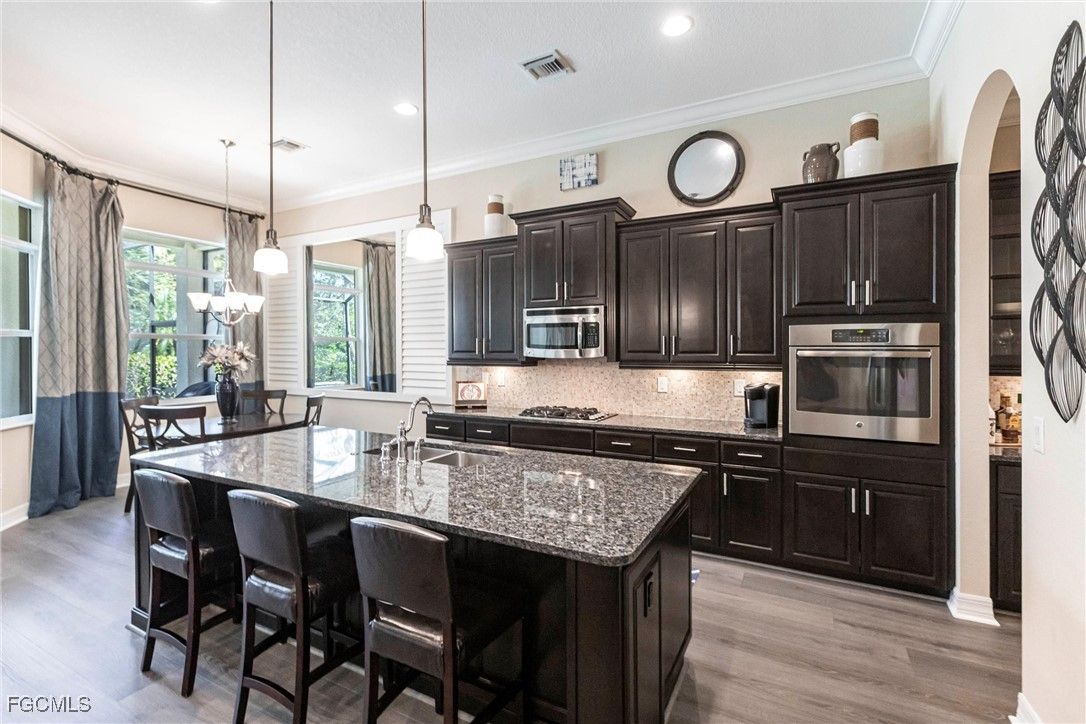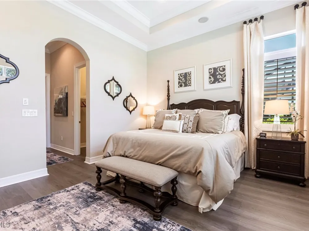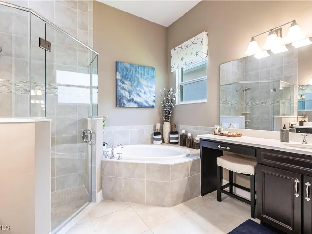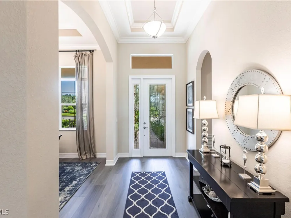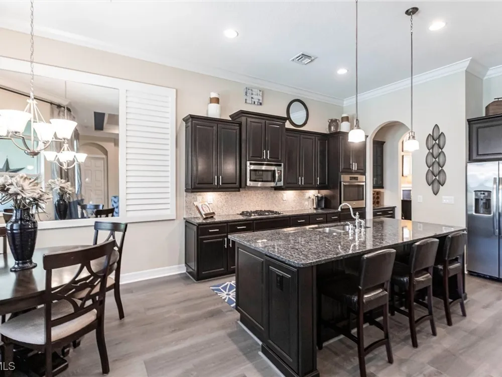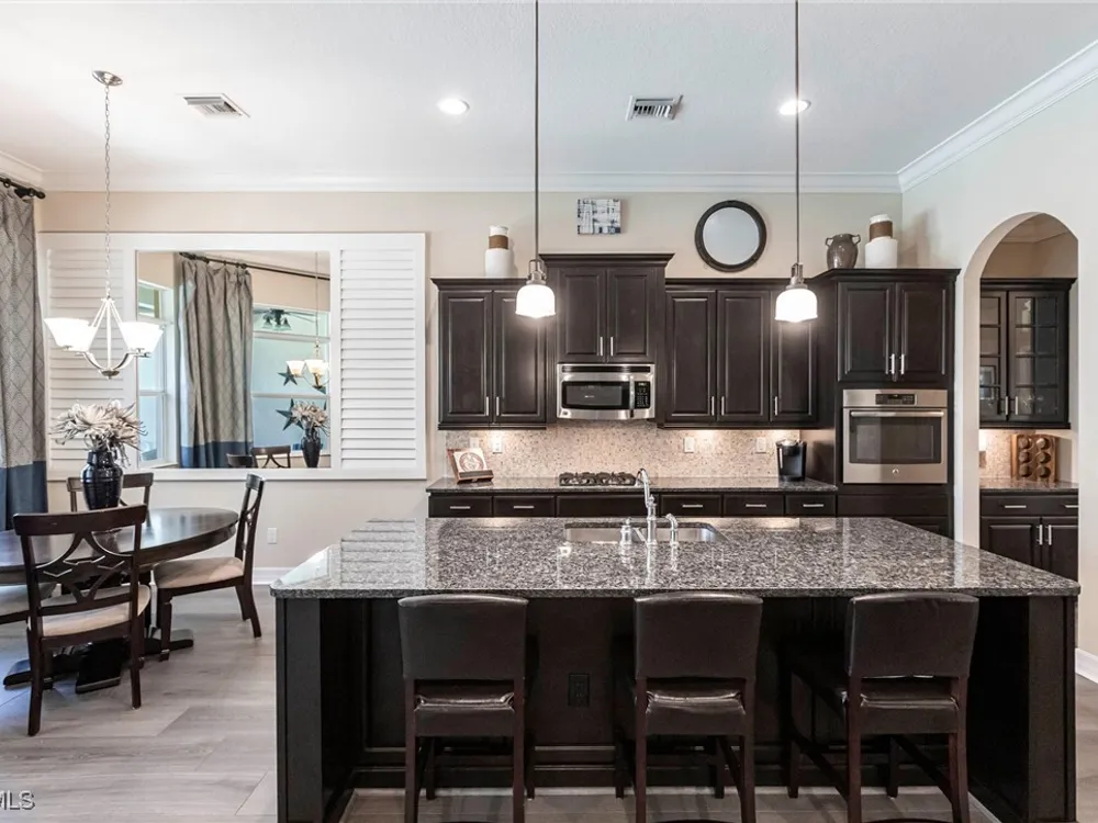 This stunning former Kolter Homes Anna model is a must-see, featuring a large heated pool and spa. What sets Kolter Homes apart from other builders is their commitment to quality and attention to detail. All homes boast 12ft ceilings, 8ft interior doors, and transom windows that flood the space with natural light. This home has been meticulously maintained and updated, with a new AC system featuring ultra-violet light, new LVP wood flooring in the main areas and primary bedroom, carpet in two additional bedrooms, plantation shutters, window treatments, two new toilets, a Butler’s Pantry, Blue Pearl Edge Granite countertops, Tumbled Marble Stone backsplash, crown molding throughout, 42-inch cabinets with under cabinet lighting, stainless steel appliances, and a wall oven with a natural gas cooktop. The primary suite is a luxurious retreat, with his-and-her walk-in closets, a spacious en suite bathroom with double vanities, a soaking tub, and a large walk-in shower. The private screened lanai boasts an auto-fill custom pool with an elevated jetted spa. The Anna model also features hurricane impact glass, coffered ceilings, laundry cabinets with a sink, and a brand new washer and dryer. Additional features include an alarm system with cameras, built-in surround sound, upgraded landscaping, and pavers on the driveway and lanai. Verandah, the community where this home is located, offers a wealth of amenities for residents to enjoy. These include two championship golf courses designed by Jack Nicklaus and Bob Cupp, a tennis complex, state-of-the-art fitness facilities, a resort-style heated community pool, pickleball, bocce, a dog park, kayaks, playground, multiple restaurants, and an active social calendar. Secure your place in paradise now by scheduling a viewing of this exceptional property.