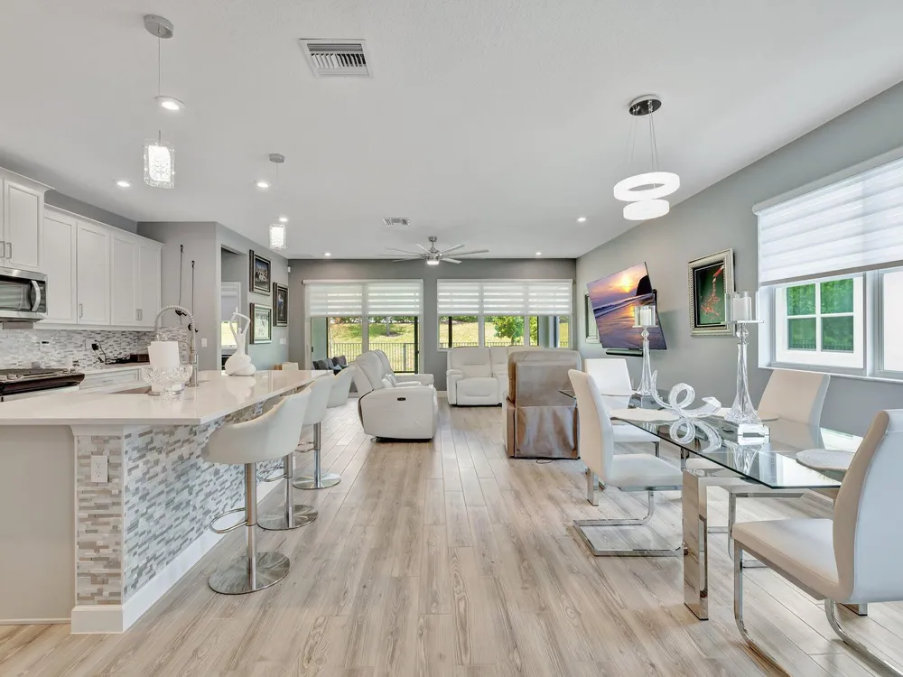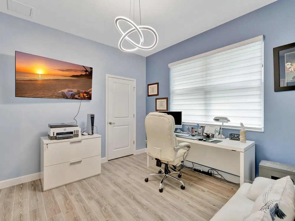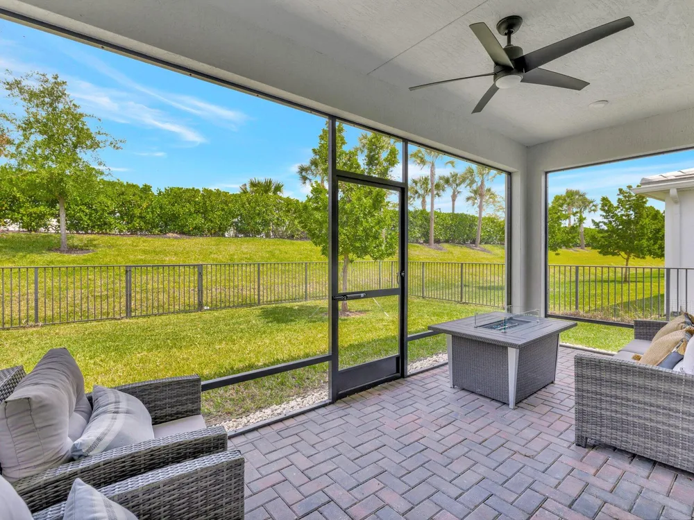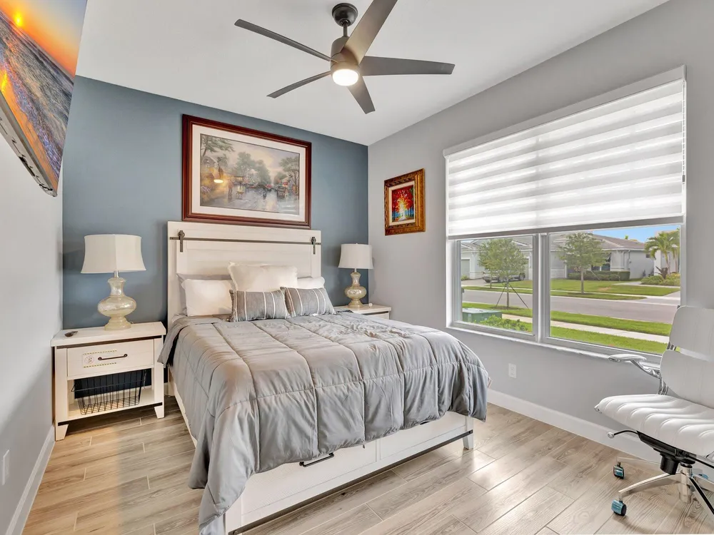 This Eden construction model features 2 large bedrooms and a beautiful sized space that I use as an office but can easily be converted into a 3rd legal bedroom (It has a window and closet). This was originally sold as a 'flex' space without the walls and door. Tiled wood-like floors throughout the entire home. Both bedrooms have an amazingly large en suites. Both showers are tiled to the ceiling and we added a glass door on 2nd bedroom shower. All modern appliances are included. Enjoy your backyard with a added screened-in patio & the huge backyard is fenced in. Upgraded blinds and beautiful fixtures and extra large fans included. Built w/energy efficient CBS construction, natural gas & impact windows throughout. Beautiful clubhouse with resort style activities.