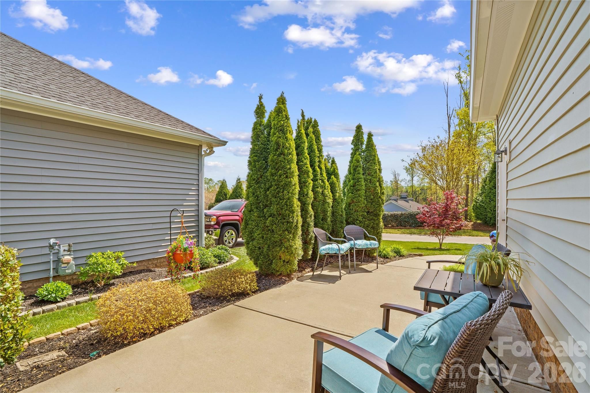 This extremely well-maintained home sits on a premium lot in the highly sought after 55+ community of Baileys Glen. A charming rocking chair front porch welcomes you into the popular Hunter floorplan, complete with a bright and airy sunroom. The kitchen features a large center island, granite countertops, gas range, and a pantry upgraded with custom pull out drawers. It opens seamlessly to the dining area and living room, creating an expansive entertaining space accented by wood floors. Natural light pours into the inviting sunroom—an ideal spot for morning coffee, an afternoon read, or simply enjoying the peaceful view. The spacious primary suite offers his and hers closets, dual sinks with lighted mirrors, and a tiled shower with bench seating. Two generously sized secondary bedrooms provide comfortable accommodations for guests or flexible space for hobbies or an office. Thoughtful customizations by this original owner include a redesigned laundry room with utility sink and two separate walk-in closets in the primary suite. This home is filled with upgrades: solar tubes for added natural light, custom closet systems, a recirculating hot water system, an oversized deep garage, in ground irrigation, and more. The private back patio overlooks serene woods, creating a tranquil outdoor retreat. Baileys Glen offers an exceptional active adult lifestyle with resort style amenities—pool, tennis and pickleball courts, putting green, clubhouse, gym, and a wide variety of clubs including woodworking, gardening, and pottery. This special home is just a short walk from many of these amenities.
