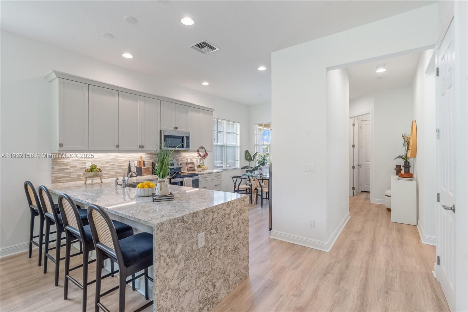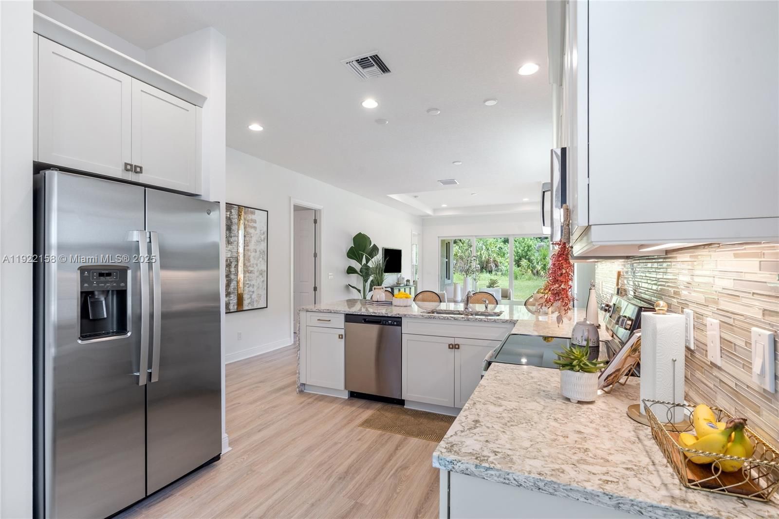 Enjoy resort-style living with this stunning home featuring 3 beds/2 baths in the exclusive PGA Verano community. Exceptional style, comfort, and privacy are yours: property features a quiet, serene backyard that sits directly next to a protected nature preserve and a beautiful water view right from the kitchen. Step inside the elegant open-concept design with 10-foot ceilings and abundant natural lights. The gourmet kitchen has waterfall-edge granite countertops, premium cabinetry, and an ideal setup for everyday living and entertaining. The PGA Verano Community offers a 40,000 sq. ft. luxury clubhouse, 27 pickleball courts, 4 lighted tennis courts, a heated indoor Olympic-sized lap pool & spa, outdoor resort-style pool with cabanas, saunas, massage room, card room, library, billiards area, bocce courts, dog park, playground, a 7,000 sq. ft. gym, and a pilates/aerobics studio. With 3 nearby golf courses, shopping, dining and entertainment, every day feels like a vacation.
