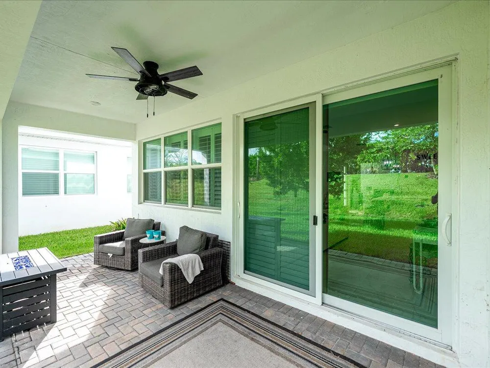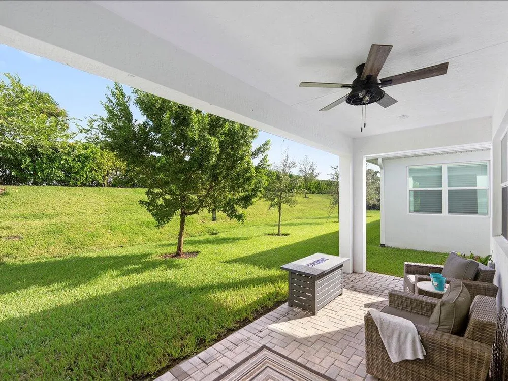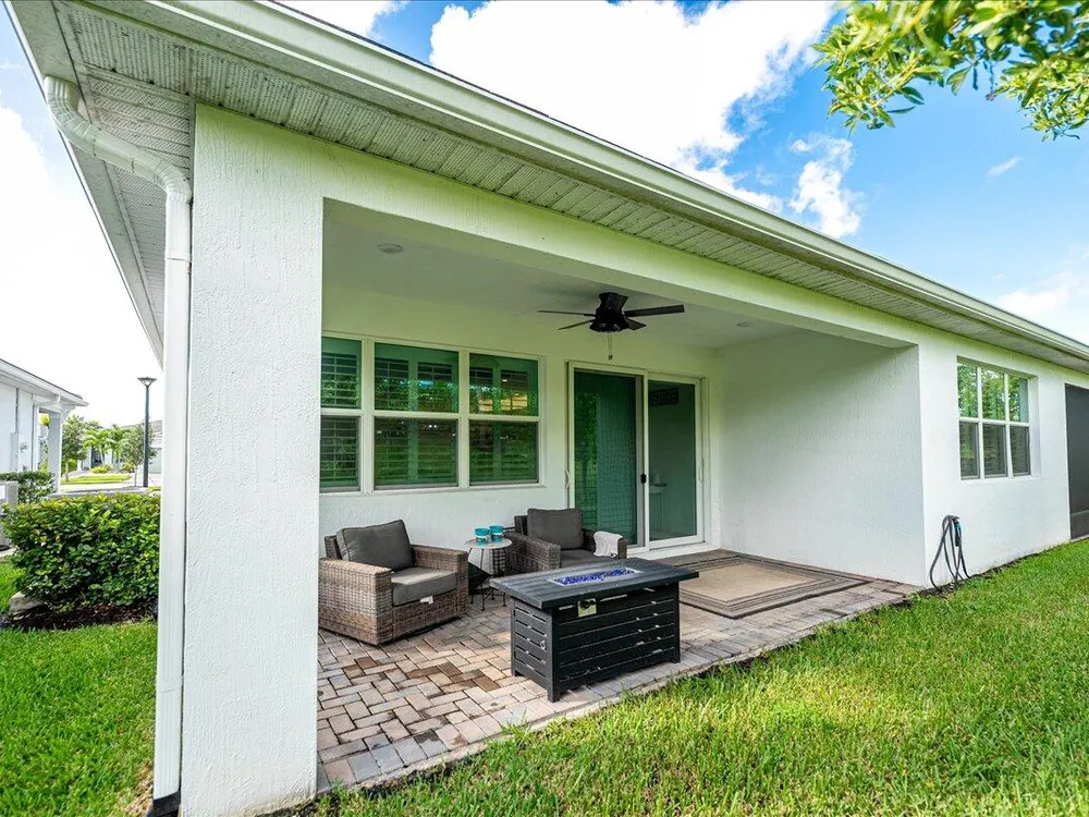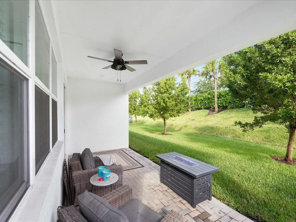 LOCATION! LOCATION! LOCATION! Walking distance to the Heart at Tradition and many restaurants and shops. Step into this modern villa, where you will find a spacious and flexible layout This 2-bedroom, 2.5-bathroom residence features a versatile flex room that can serve as a home office, den, or guest space. The entire home is adorned with beautiful tile flooring, offering both a clean and contemporary feel.Rest easy with the complete peace of mind offered by impact-resistant glass on all windows and doors and a home security system. The primary bedroom boasts a generous walk-in closet for ample storage and a large master bathroom. Outside you can enjoy private peaceful evenings on your covered porch that backs a beautiful grass berm and hedge for additional privacy.
