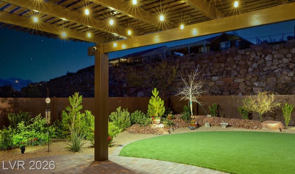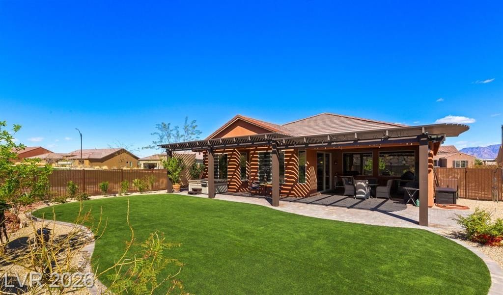 $280K in upgrades! Stunning 3-bedroom, 2.5-bath home with den on a premium Sun City Mesquite lot! Chef's kitchen shines with 42" cabinets, executive island with end-cap shelves, gas cooktop, granite countertops, tile backsplash and walk-in pantry. Primary suite is a retreat with walk-in shower, piedrafina marble countertops, 11' x 14' closet, and soundproofing, with additional soundproofing in bathrooms and laundry room. Vinyl and tile floors throughout. Bay windows in primary bedroom and dining room. Crown molding in primary bedroom and gathering room. Ceiling fans, and Cat 6 throughout. Backyard paradise with 100+ shrubs/trees, decorative rock and boulders, ~approx 1,000 SF artificial turf, paver patio, full-length awning, low-voltage lighting, privacy fencing with three gates, and garbage can enclosure. Expanded driveway, front courtyard with custom gate. Oversized 2-car garage with overhead storage racks, cabinets and coated flooring complete this one-of-a-kind home!