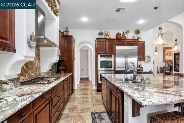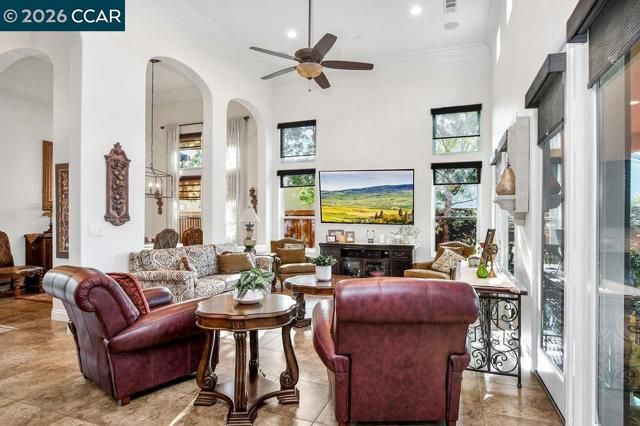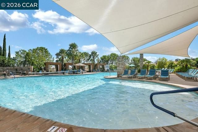 Open House Sat 1 to 4pm. Stunning Italian Tuscany Rafael Model – Many Upgrades - 2-BR plus an office (or 3rd bed), 2.5-bth, 2,751 sq ft home, 2.5 car garage. A 55 & over gated community, “Trilogy at the Vineyards”. Front door entry filled w/ vines & succulents. Formal dining rm w/custom chandelier, custom window treatments throughout. Large family room, high ceilings, custom flooring throughout. Kitchen-granite counters, cherry cabinets w pullouts, Jenn-Air appliances double ovens, microwave, dishwasher, wine cooler, gas stove, & plus dinette area. The Harth Room - gas fireplace, a brick-accent wall & views of the hills. Possible 3rd BR is currently her & his private room & office. Primary suite - coffered ceiling, French doors & the large walk-in closet. Primary bath - shower stall, his & her vanity, a large tub w/ view of the hills. 2nd BR suite with bathroom. Hallway - guest bath, Cherry wood cabinets & granite tops. Laundry rm - sink & cabinets. A fabulous backyard - 2 custom patios & patio covers, fans, decorative lights & waterfall features. Views of the sunset. Tesla SOLAR, 220 EV charging station, tankless water heater, epoxy garage floor & storage cabinets. The Club house has a restaurant, a spa, gym, 2 pools, tennis, pickle ball, bocce & endless social activities.