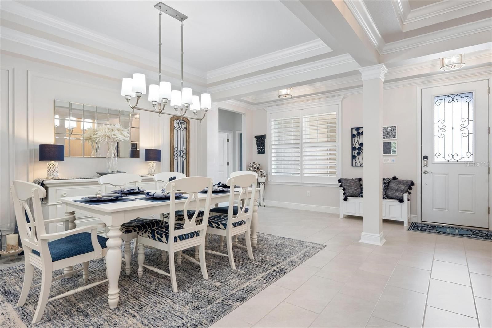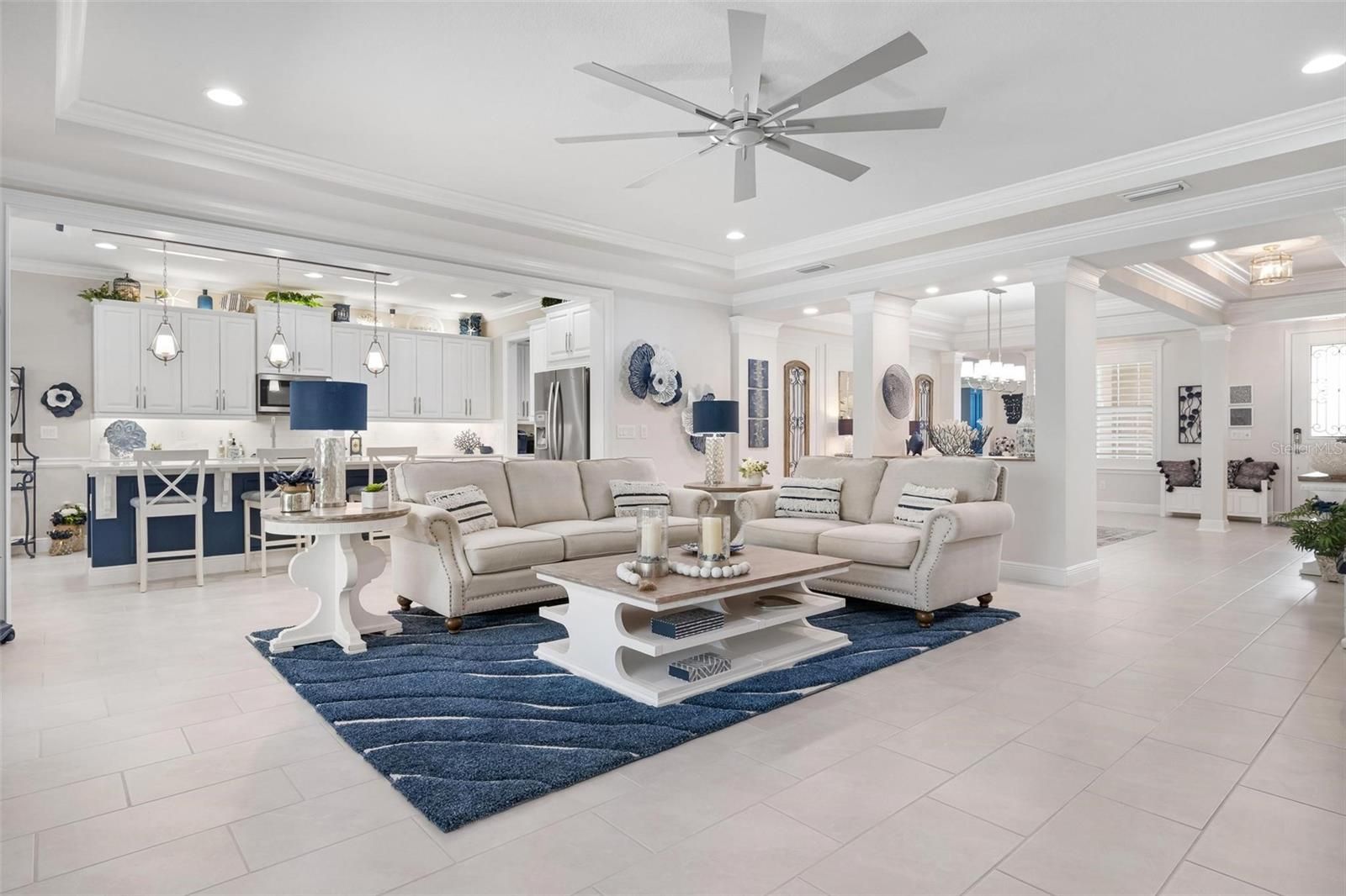 - Built-in Features, Ceiling Fan(s), Coffered Ceiling(s), Crown Molding, Eat-in Kitchen, High Ceilings, In-Wall Pest Control, Open Floorplan, Main Level Primary, Solid Surface Counters, Split Bedrooms, Thermostat, Tray Ceiling(s), Walk-In Closet(s), Window Treatments