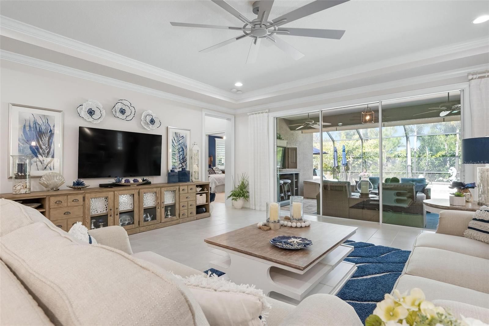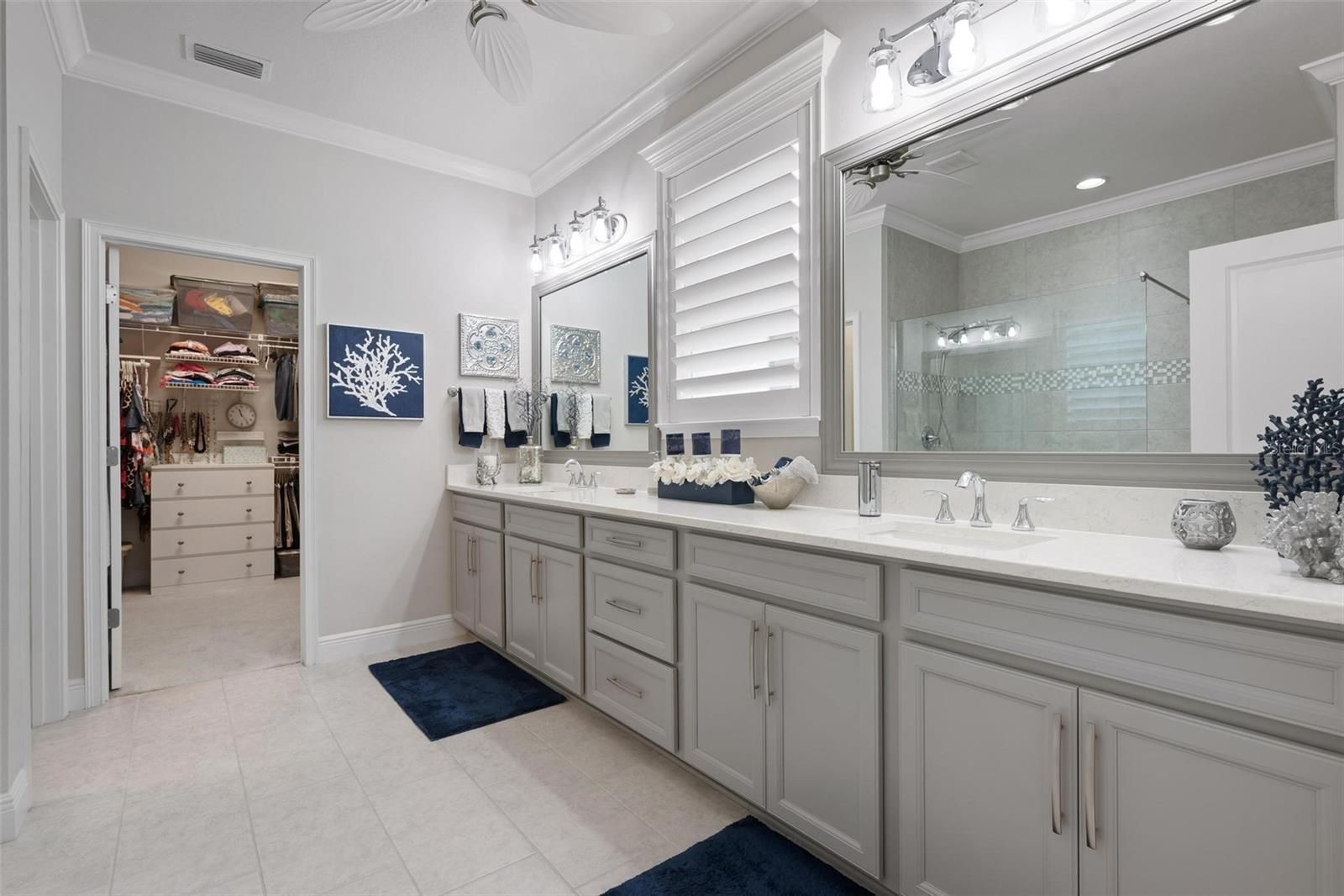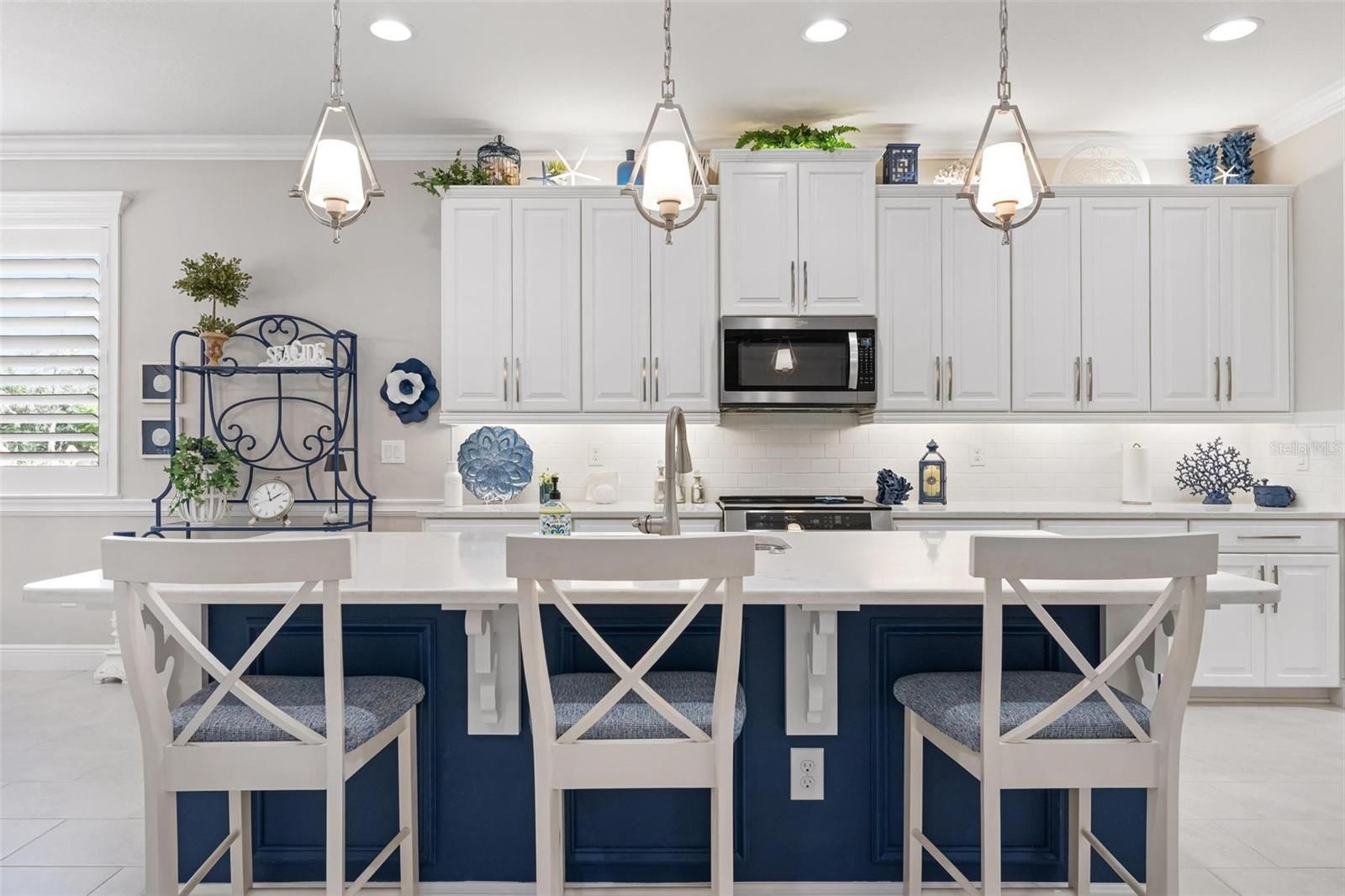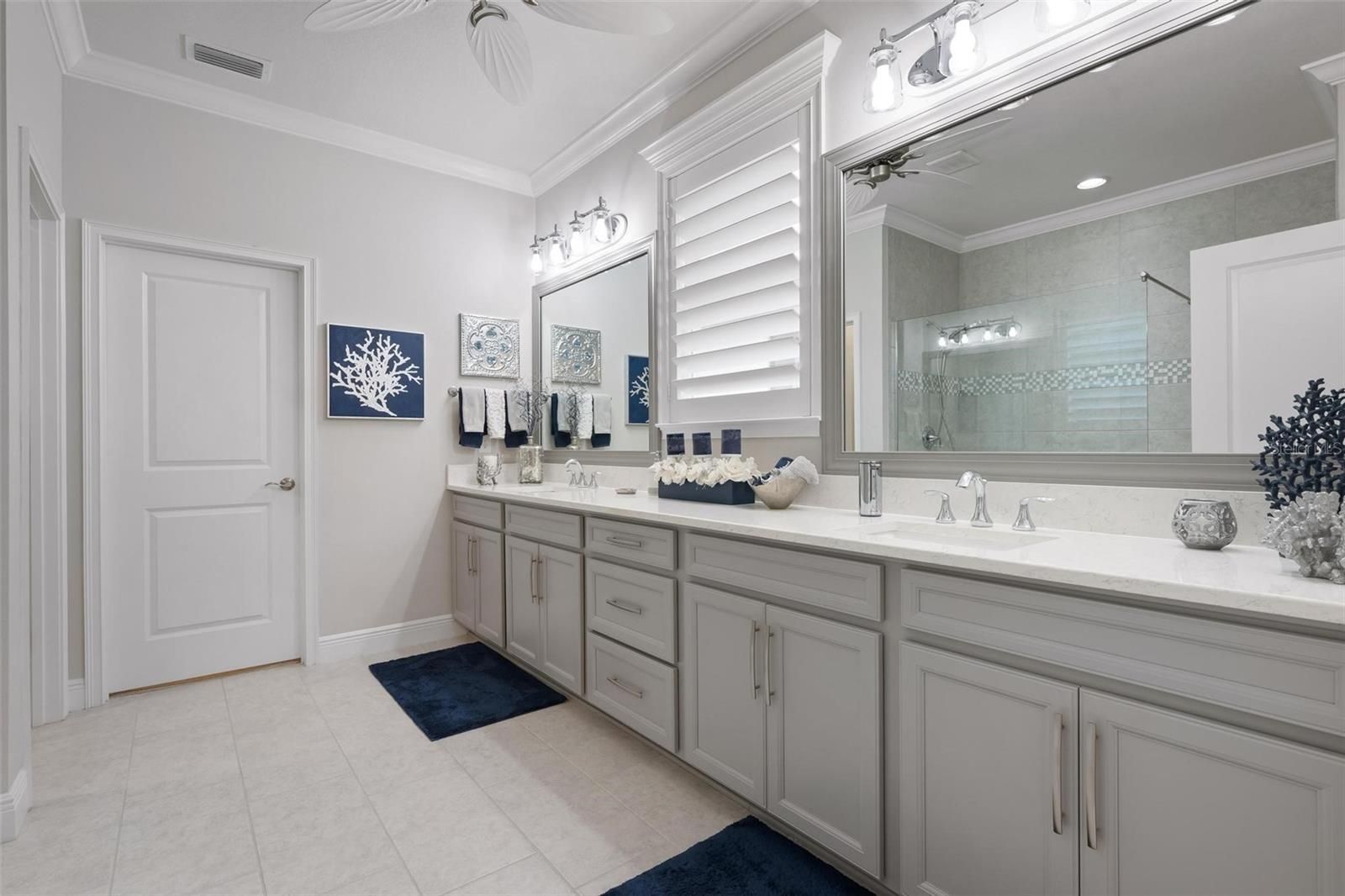 Professionally decorated and beautifully upgraded, this stunning Mattamy “Nantucket” floor plan in the gated, maintenance-free Renaissance community of Wellen Park shows like a builder’s model. Situated on a quiet, private lot at the end of the street and featuring one of the community’s more favorable HOA fees, this home offers exceptional value, design, and lifestyle. A paver driveway and welcoming courtyard entry set the tone for what awaits inside. The thoughtfully designed split floor plan offers 4 bedrooms (or 3 bedrooms plus a den), 3 full baths, a spacious great room, formal dining area, and a generous kitchen dinette. Crown molding throughout, coffered and tray ceilings, porcelain plank flooring, upgraded cabinetry, and quartz countertops elevate the home’s elegant interior. The chef’s kitchen features raised panel cabinetry, stainless steel appliances, a large center island with seating, and an adjoining pantry/coffee room complete with additional cabinetry, counter space, wine rack, and wine refrigerator—ideal for entertaining and everyday convenience. Sliding glass doors open to an expansive screened lanai designed for year-round enjoyment. The heated pool with soothing water feature, built-in serving area with wall cabinet for a television, and retractable awning with LED lighting create a private outdoor retreat perfect for relaxing or hosting gatherings. Additional highlights include hurricane protection for peace of mind, a 3-car garage with pull-down stairs to plywood-floored attic storage in the 2-car bay, and extra shelving in the separate 1-car garage. Residents of Renaissance enjoy resort-style amenities including a clubhouse with a full calendar of social activities, pool, fitness center, pickleball and tennis courts, bocce ball, walking and biking trails, a playground and a dog park. Located across from CoolToday Park, the spring training home of the Atlanta Braves, and just minutes to Downtown Wellen Park with dining, shopping, entertainment, and community events. Convenient access to area beaches, golf courses, Costco, and I-75 provides easy connectivity to Sarasota and surrounding areas. Experience refined Florida living in one of Wellen Park’s most desirable communities.