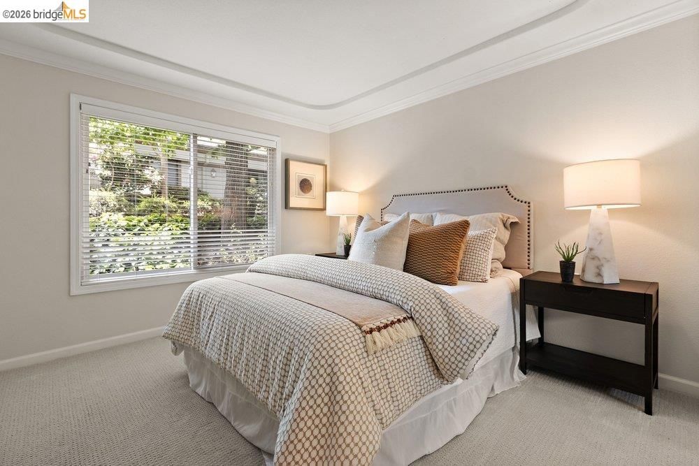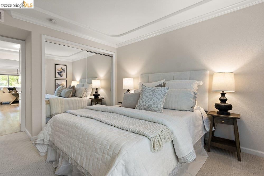 Enjoy lush tree and Hill views with lovely light streaming through dual paned windows. Recently refreshed, this two bed/two bath unit plus office was lightly lived in after being remodeled by one of Rossmoors' most prestigious designers. Features include tray ceilings, laminate flooring, newly carpeted bedrooms, two beautifully tiled baths, crown molding and office space with a built-in desk. The open concept kitchen has abundant soft close cabinets, an island, stainless steel appliances, quartz countertops, under mount lighting and a custom backsplash. The living room has built-in cabinets, an electric fireplace and recessed connections to accommodate a flat screened television. A private balcony off the dining room is the perfect spot to greet the day with a morning cup of coffee! Only eight steps down to the entry and a chairlift is already installed and may convey if desired. With in-unit laundry, this home has it all! Move-in ready at a wonderful price! Rossmoor is a premier 55+ community located two miles from downtown Walnut Creek and near downtown Lafayette. Gated Rossmoor features incredible natural beauty, clubhouses, two golf courses, a fitness center, swimming pools, pickle ball, lawn bowling, a restaurant, a movie theater and more than 200 clubs. Enjoy an affordable Bay Area lifestyle in an active resort community.