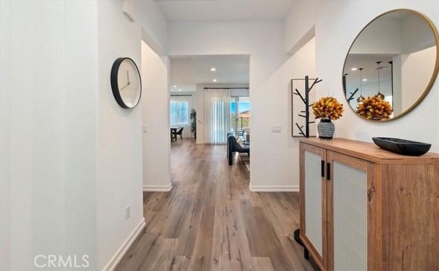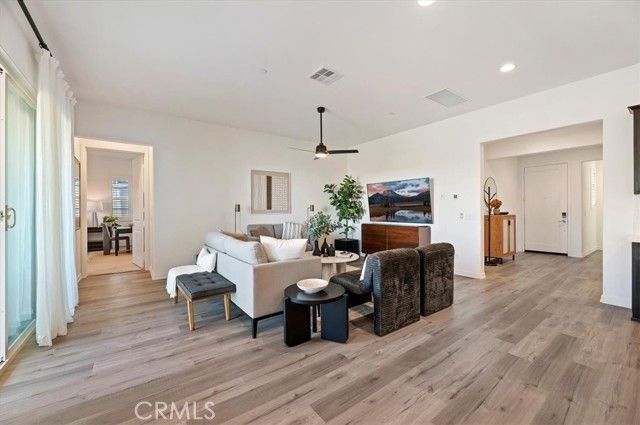 Welcome to resort-style living in the prestigious, gated Terramor 55+ Community. Situated on a premium lot with picturesque views, this newly built, turnkey home offers modern comfort and exceptional functionality. The light-filled open floor plan features 9-foot ceilings, luxury vinyl plank flooring throughout, and a spacious living, dining, and kitchen area perfect for entertaining. The kitchen includes a large center island with seating, walk-in pantry, recessed lighting, and ample cabinetry. This home offers three spacious bedrooms, including a versatile third bedroom/den or office with double glass doors, two bathrooms, a dedicated laundry room, and an open family room. Enjoy peaceful outdoor living on the covered front porch with scenic views. Additional highlights include solar panels and thoughtful upgrades throughout. Experience elevated, low-maintenance living in one of Southern California’s premier active adult communities Homeownership includes exclusive membership to The Terrace Club, available only to Terramor’s 55+ residents. Resort-style amenities include a grand clubhouse, outdoor pool, indoor saltwater pool, spa, fitness center, wellness studio, sauna, tennis and pickleball courts, bocce ball, outdoor cooking areas, craft room, and a full calendar of classes and social events. Terramor also offers miles of walking trails, dog parks, basketball courts, a community garden, and access to Temescal Valley Community Park. Conveniently located near Tom’s Farms, Glen Ivy Hot Springs, The Shops at Dos Lagos, and The Crossings at Corona.