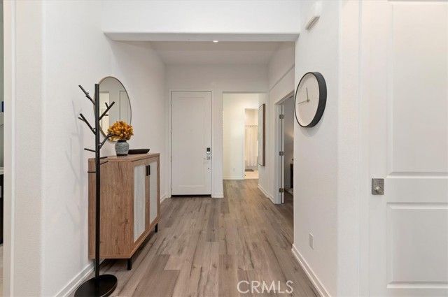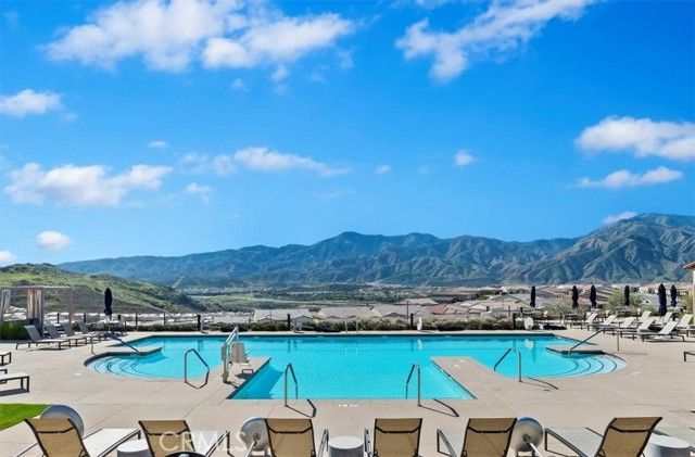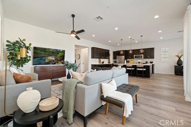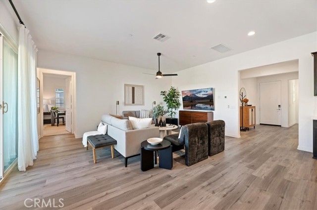 Welcome to resort-style living in the prestigious, gated Terramor 55+ Community. Situated on a premium lot with picturesque views, this newly built, turnkey home offers modern comfort and exceptional functionality. The light-filled open floor plan features 9-foot ceilings, luxury vinyl plank flooring throughout, and a spacious living, dining, and kitchen area perfect for entertaining. The kitchen includes a large center island with seating, walk-in pantry, recessed lighting, and ample cabinetry. This home offers three spacious bedrooms, including a versatile third bedroom/den or office with double glass doors, two bathrooms, a dedicated laundry room, and an open family room. Enjoy peaceful outdoor living on the covered front porch with scenic views. Additional highlights include solar panels and thoughtful upgrades throughout. Experience elevated, low-maintenance living in one of Southern California's premier active adult communities Homeownership includes exclusive membership to The Terrace Club, available only to Terramor's 55+ residents. Resort-style amenities include a grand clubhouse, outdoor pool, indoor saltwater pool, spa, fitness center, wellness studio, sauna, tennis and pickleball courts, bocce ball, outdoor cooking areas, craft room, and a full calendar of classes and