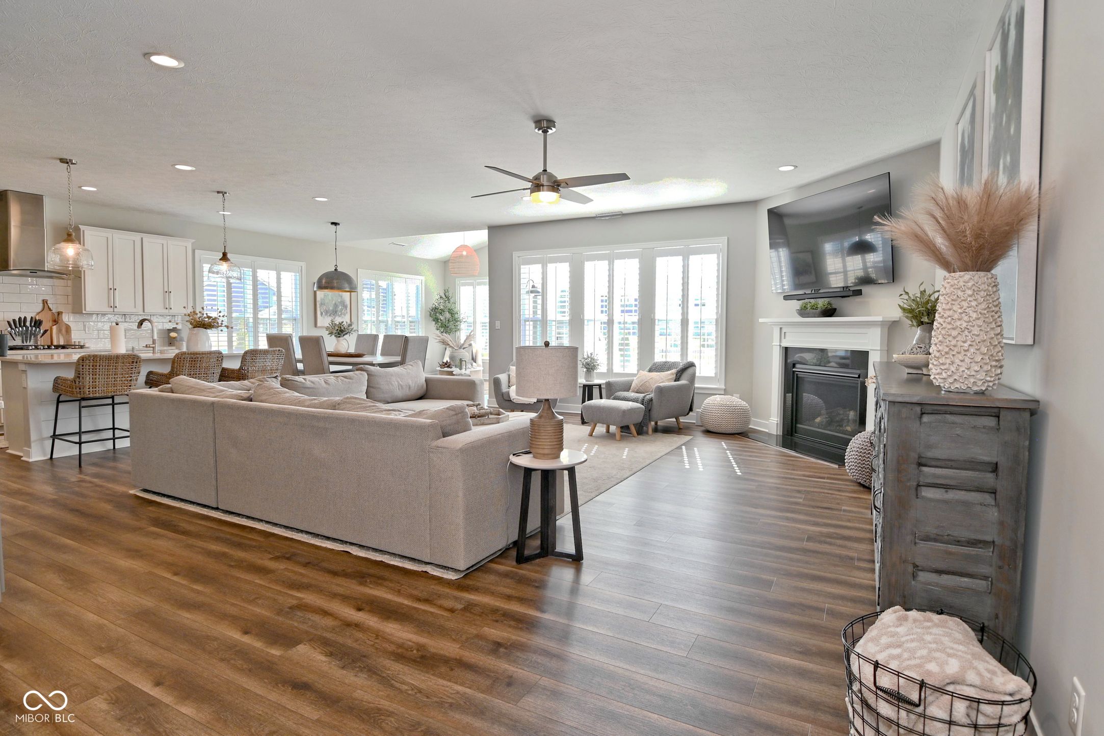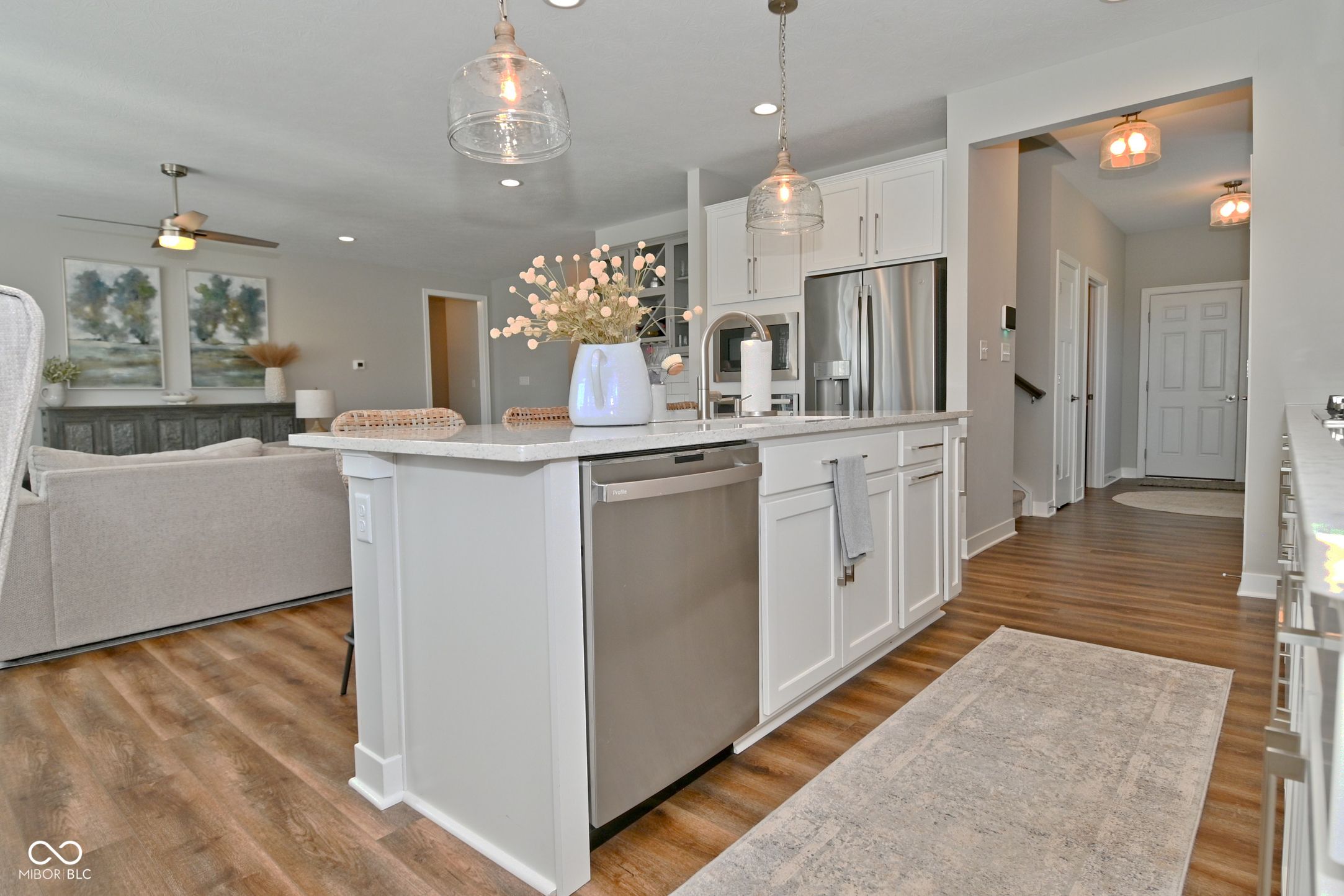 Immaculate single-family ranch with loft offering 4 bedrooms and 3.5 baths, including a versatile 4th bedroom ideal for a main-level home office. This thoughtfully designed floor plan features a spacious family room with gas fireplace, sunroom, and LVP flooring throughout the main level. The gourmet kitchen is appointed with 42" cabinetry, stainless steel appliances, double oven, gas range with vent hood, wine/beverage center with refrigerator, and ample counter space for entertaining. The spacious primary suite features a tray ceiling and an attached bath with a large walk-in shower, double vanities, and a walk-in closet The second-floor loft provides flexible living space along with a private bedroom and full bath-perfect for guests or multi-generational living. All bathrooms include raised vanities for added comfort. Additional highlights include a separate laundry room and mudroom with built-in cabinetry for added storage and functionality. Enjoy outdoor living in the fully fenced backyard with a large patio designed for entertaining. The 2-car garage includes a 4-foot bump-out for additional storage space. Newly built MI Home with transferable warranty, offering upgraded finishes throughout without the wait of new construction. Pristine condition and move-in ready.