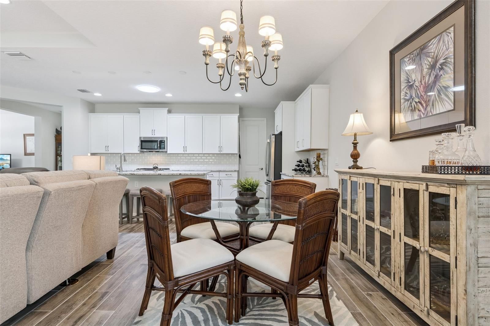 Beautifully maintained 2019 home in the highly sought-after Victoria Gardens/Cresswind 55+ community! This popular Lily floor plan offers 2 bedrooms plus a versatile flex room within a bright, open layout enhanced by elegant finishes throughout. A striking glass entry welcomes you into a foyer with a coffered tray ceiling and wood-look plank tile flooring flowing seamlessly through the main living areas. The spacious great room, dining area, and chef’s kitchen blend effortlessly in an open-concept design. Triple sliding doors lead to a recently expanded 26’ x 28’ screened lanai, complete with brick pavers and an upgraded fine-mesh screen—an ideal space for relaxing or entertaining while enjoying peaceful, private wooded views. The kitchen is both stylish and functional, featuring 42” white cabinetry with crown molding, granite countertops, a large center island, beveled tile backsplash, stainless steel appliances, a 5-burner gas cooktop, and a walk-in pantry. The primary suite offers a coffered ceiling, tranquil backyard views, and a spa-inspired bath with dual vanities, a walk-in shower, and a spacious walk-in closet. A guest bedroom, full bath, and flex room provide comfort and versatility. Additional recent enhancements include gutters, a premium Shark Coatings garage floor, along with Solatube® skylights—strategically placed in the kitchen, laundry room, and garage—to bathe the home in natural light. HOA includes lawn care, cable, high-speed internet, and reclaimed water for irrigation. Enjoy resort-style living with gated entry, renovated clubhouse (2024), restaurant, pool and spa, fitness center, tennis, and pickleball.