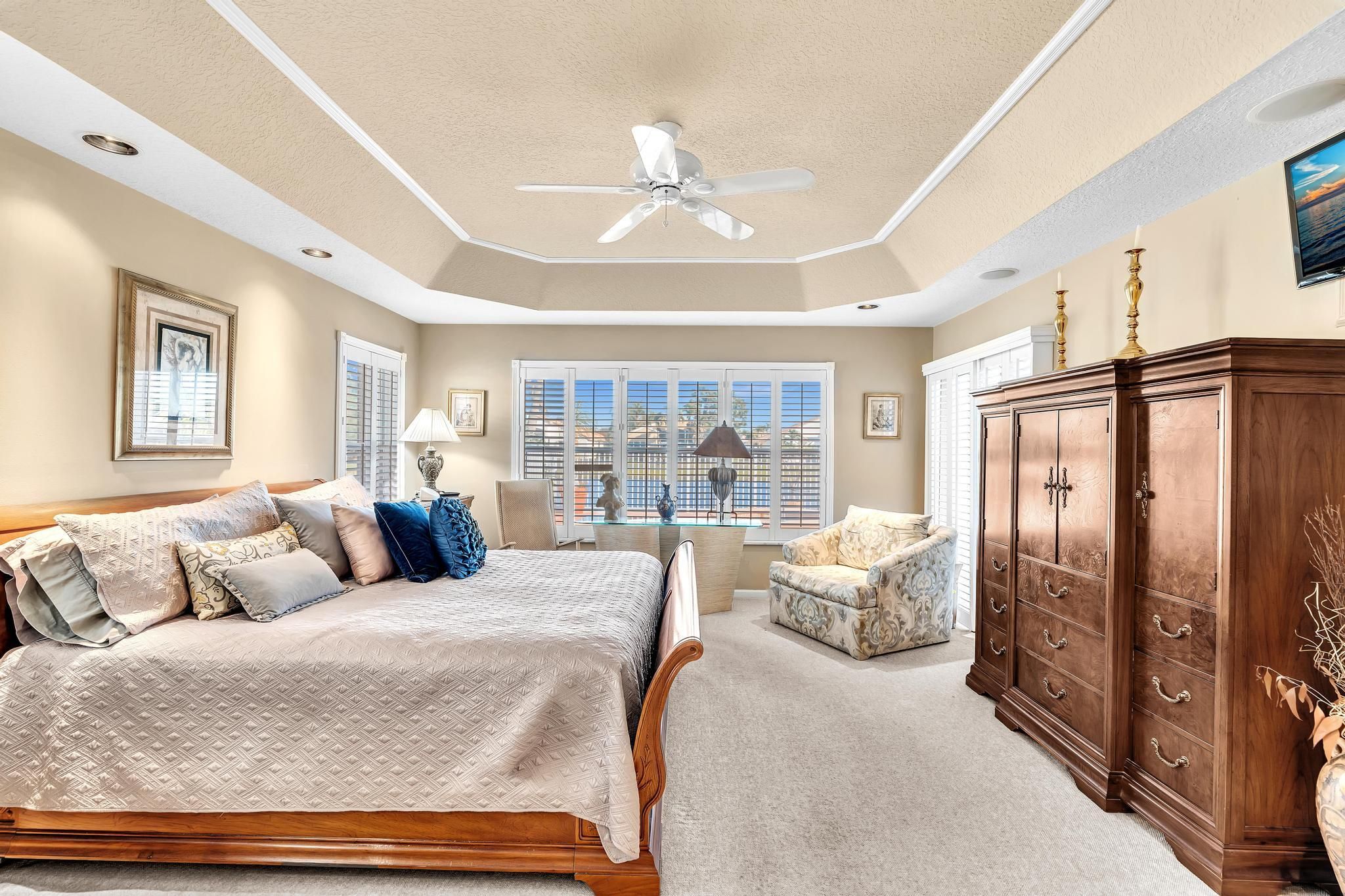 Waterfront luxury with insane panoramic lake & fountain views defines this stunning Granada model. New roof in 2025. Expansive 24'x55' bi-level patio with striking terracotta sealed pavers and contrasting diagonal white inserts offers covered and open area with inground spa-ideal for entertaining or relaxing. Exceptional curb appeal with rock garden landscaping and mature foliage, including 5 Queen Palm trees. Inside, neutral decor with elegant designer finishes and incredible custom contoured built-in bar. Kitchen has upgraded 42'' cabinets, ss appliances, decorative tile backsplash, and glass block accents. Master Suite boasts a trey ceiling, accent lighting and plantation shutters. Panoramic lake views from all primary rooms. Original owner, first time offered - elegantly appointed!