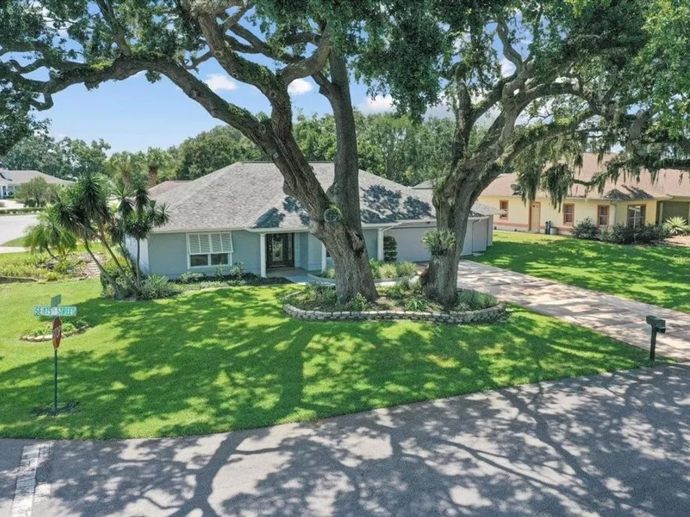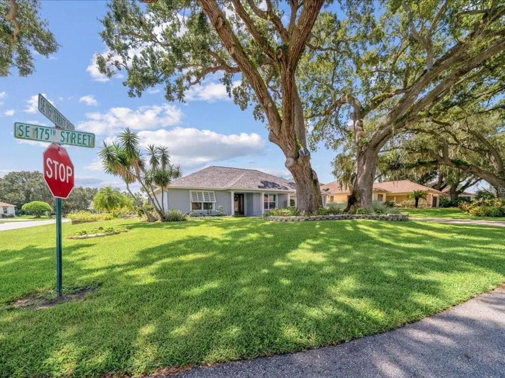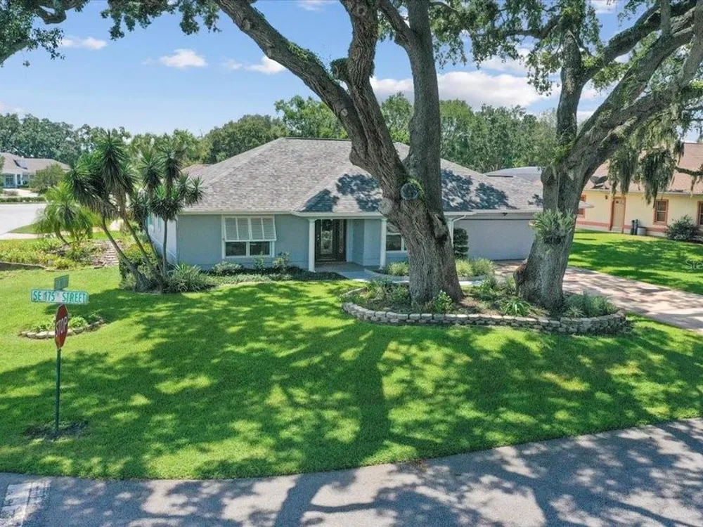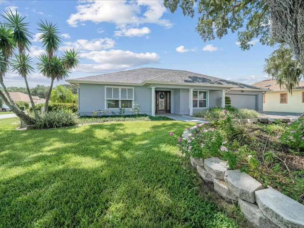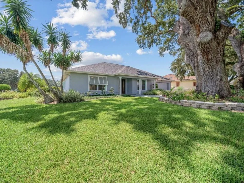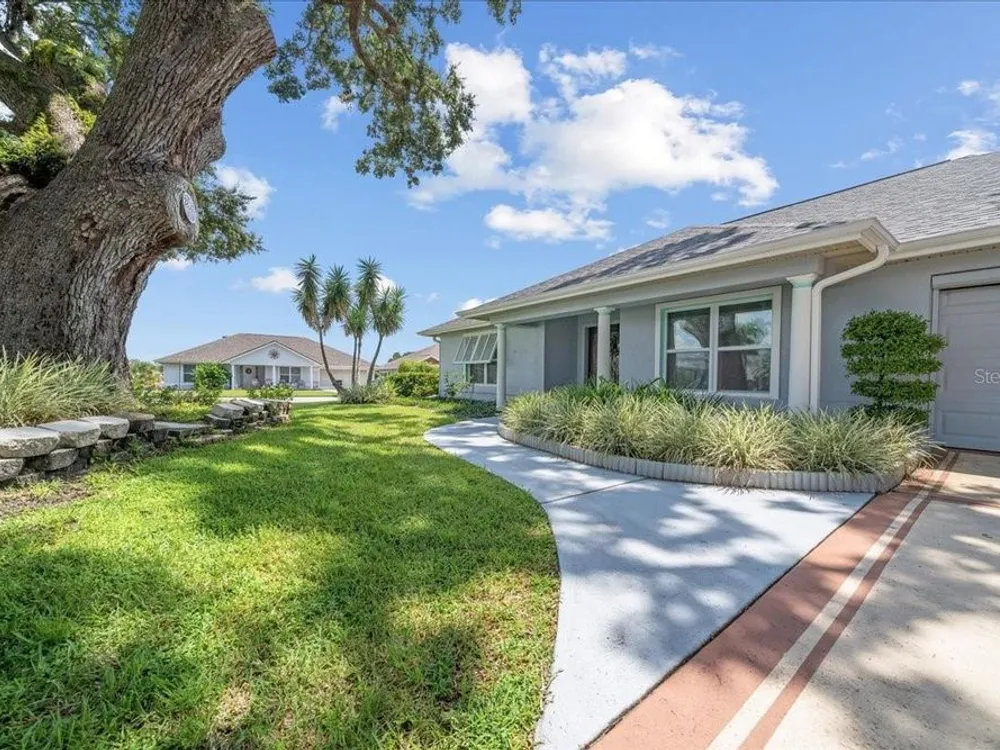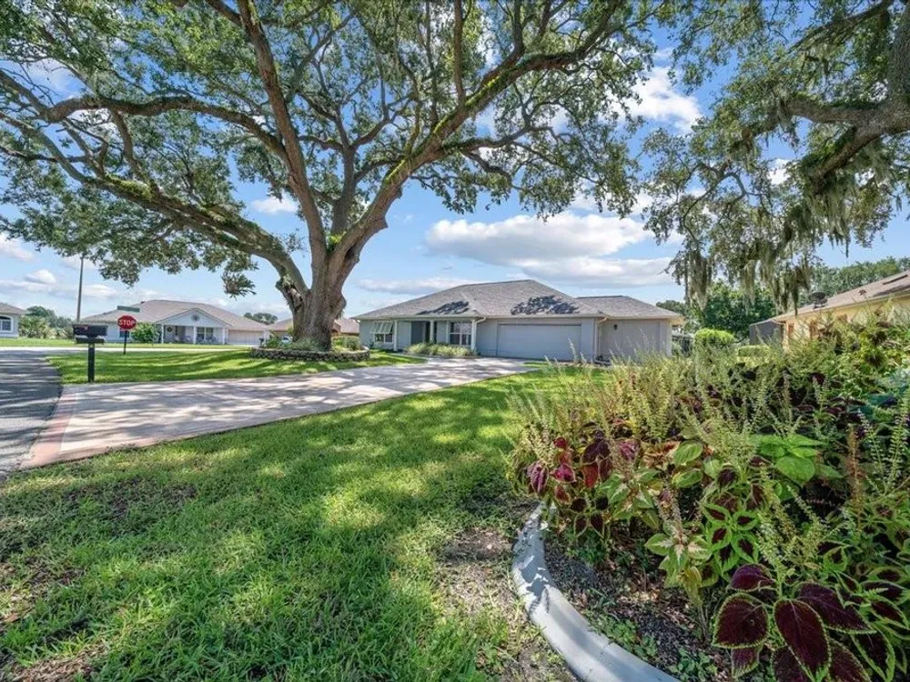 One or more photo(s) has been virtually staged. Beautifully maintained block and stucco home with 1,700 sq ft in the 55+ gated community of Stonecrest, convenient golf cart ride to The Villages, shopping, and medical. Recently PAINTED (2025) inside and out, this well cared for home sits on a shaded CORNER LOT lot with a majestic oak trees, complete with beautiful flowers and garden beds to enjoy. HIGH CEILINGS, openness throughout, and tile and WATER PROOF LUXURY VINYL PLANK flooring will greet you as you enter the home. Updates include a newer roof, upgraded windows, garage door (2019), and appliances (2020). The kitchen features updated cabinets, a tasteful backsplash, a HURRICAN-RATED SKYLIGHT that fills the space with light, and overlooks a serene garden retreat. The versatile OFFICE/CRAFT ROOM offers abundant cabinetry plus 2 closets. The dining room is complete with a BAY WINDOW, and there are 5 UPGRADED FANS/ LIGHTS throughout the home. Both bedrooms have en-suite baths; the primary includes a walk-in and linen closet. Enjoy the enclosed SUN ROOM with heating/cooling, a screened patio with a large ELECTRIC AWNING (2020), and a separate cooled golf cart garage/workshop with storage and the ATTIC offers a fan and additional storage. Wired for a generator and complete with a WATER FILTRATION SYSTEM—this home blends comfort, upgrades, and peace of mind. ROOF December, 2023, HW 2023, HVAC 2007. Start enjoying the pools, dances, clubs, pickleball, and amenities this neighborhood has to offer! Schedule your tour today!