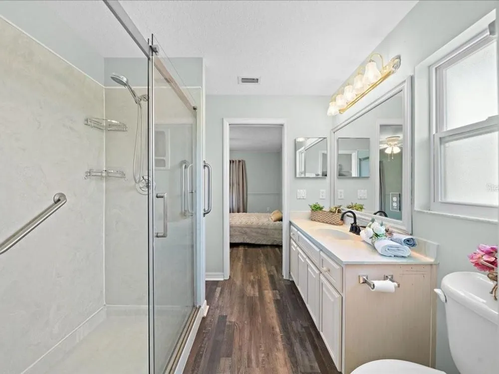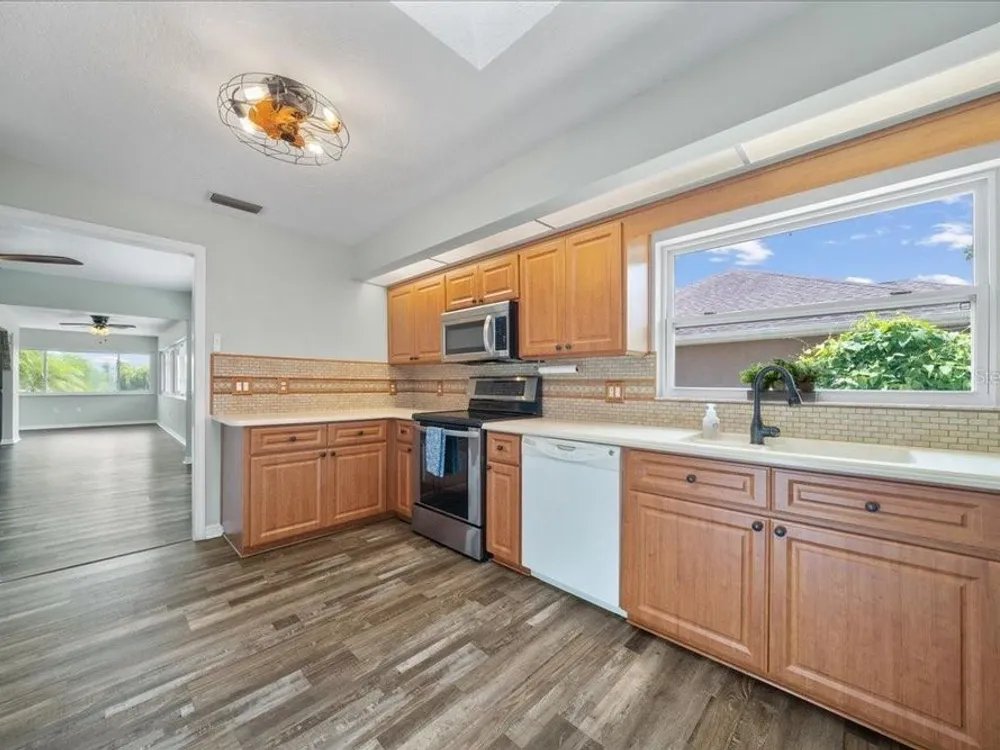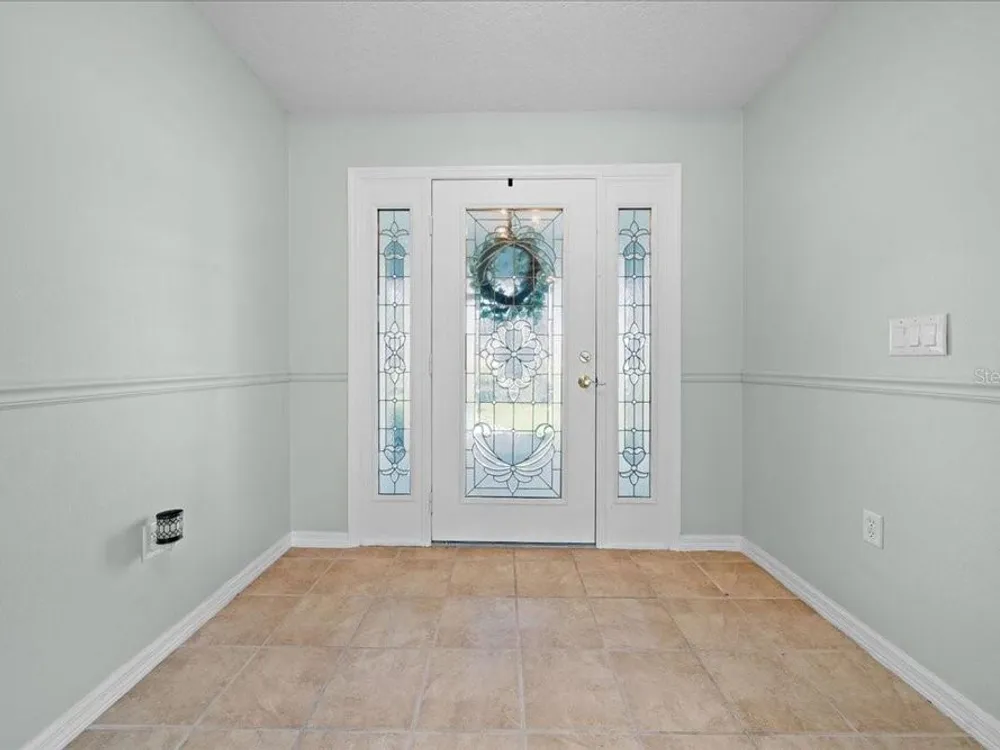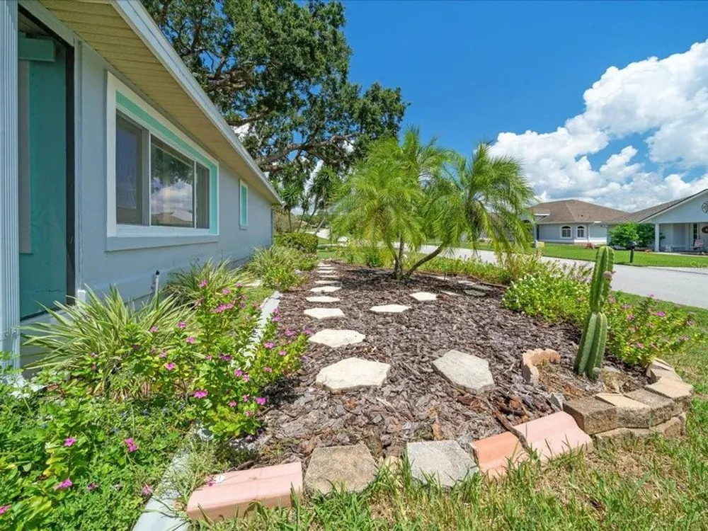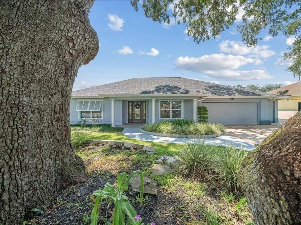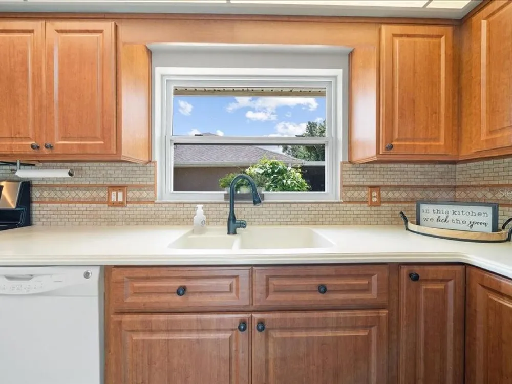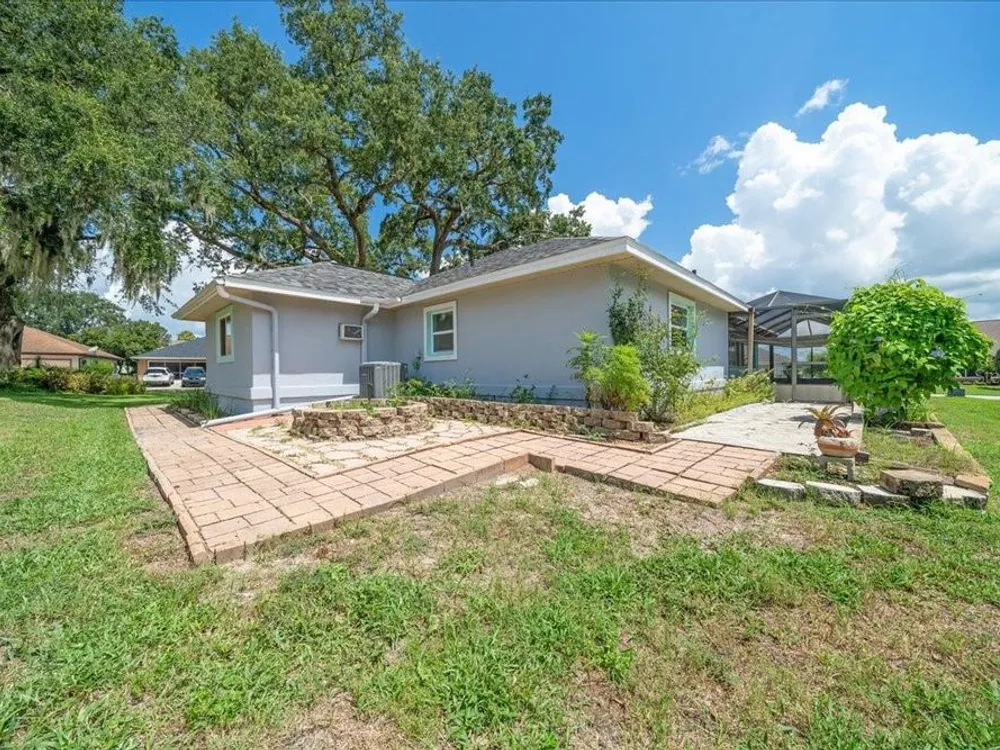 One or more photo(s) has been virtually staged. Beautifully maintained block and stucco home with 1,700 sq ft in the 55+ gated community of Stonecrest, convenient golf cart ride to The Villages, shopping, and medical. Recently PAINTED (2025) inside and out, this well cared for home sits on a shaded CORNER LOT lot with a majestic oak trees, complete with beautiful flowers and garden beds to enjoy. HIGH CEILINGS, openness throughout, and tile and WATER PROOF LUXURY VINYL PLANK flooring will greet you as you enter the home. Updates include a newer roof, upgraded windows, garage door (2019), and appliances (2020). The kitchen features updated cabinets, a tasteful backsplash, a HURRICAN-RATED SKYLIGHT that fills the space with light, and overlooks a serene garden retreat. The versatile OFFICE/CRAFT ROOM offers abundant cabinetry plus 2 closets. The dining room is complete with a BAY WINDOW, and there are 5 UPGRADED FANS/ LIGHTS throughout the home. Both bedrooms have en-suite baths; the primary includes a walk-in and linen closet. Enjoy the enclosed SUN ROOM with heating/cooling, a screened patio with a large ELECTRIC AWNING (2020), and a separate cooled golf cart garage/workshop with storage and the ATTIC offers a fan and additional storage. Wired for a generator and complete with a WATER FILTRATION SYSTEM—this home blends comfort, upgrades, and peace of mind. ROOF December, 2023, HW 2023, HVAC 2007. Start enjoying the pools, dances, clubs, pickleball, and amenities this neighborhood has to offer! Schedule your tour today!