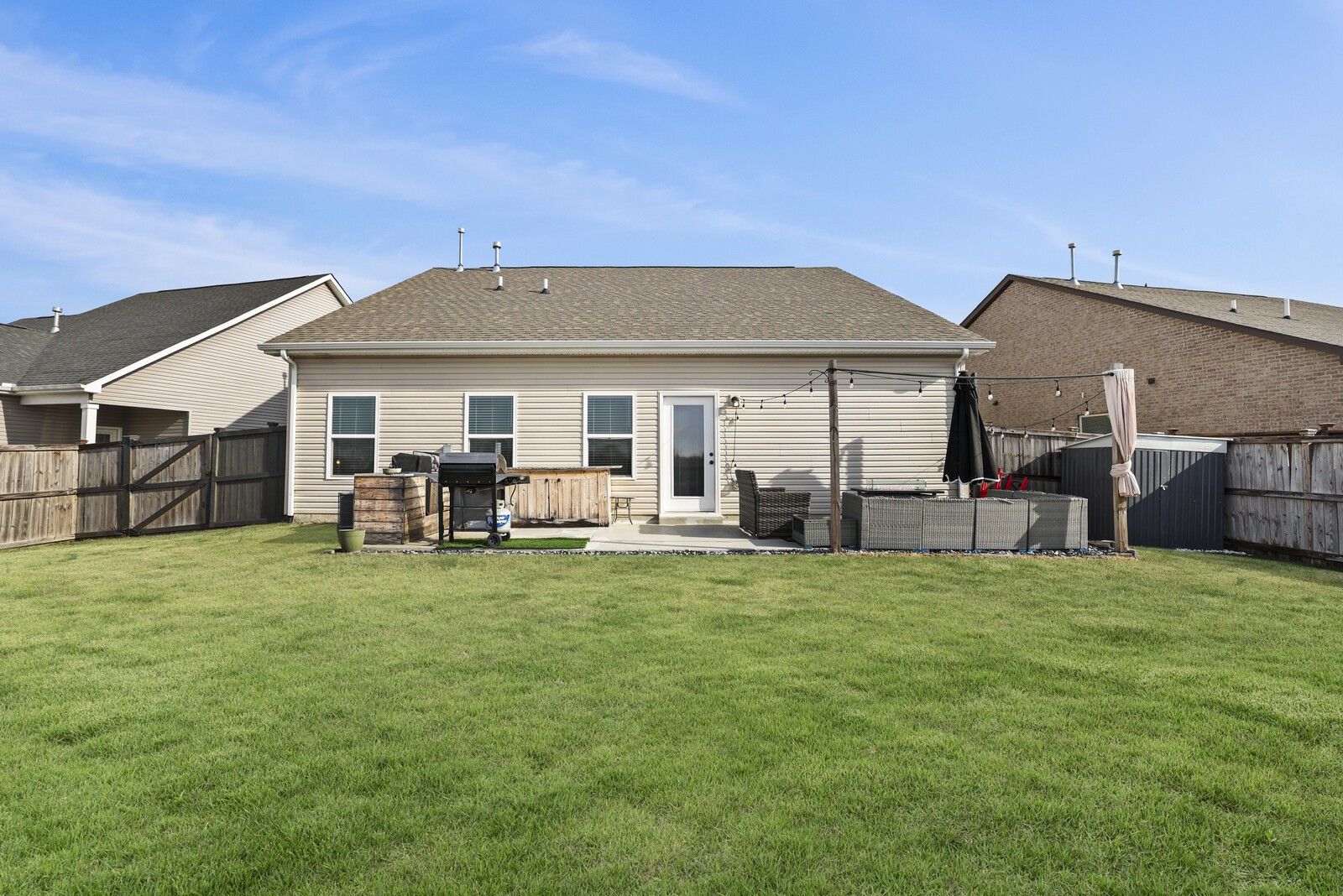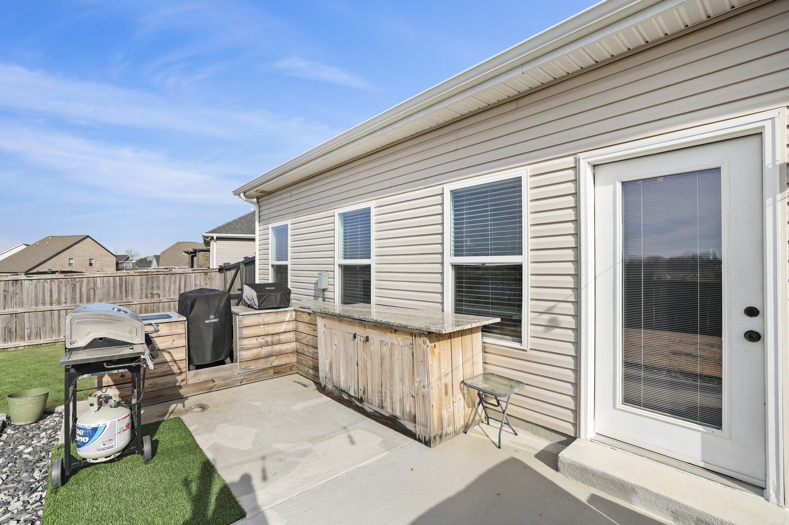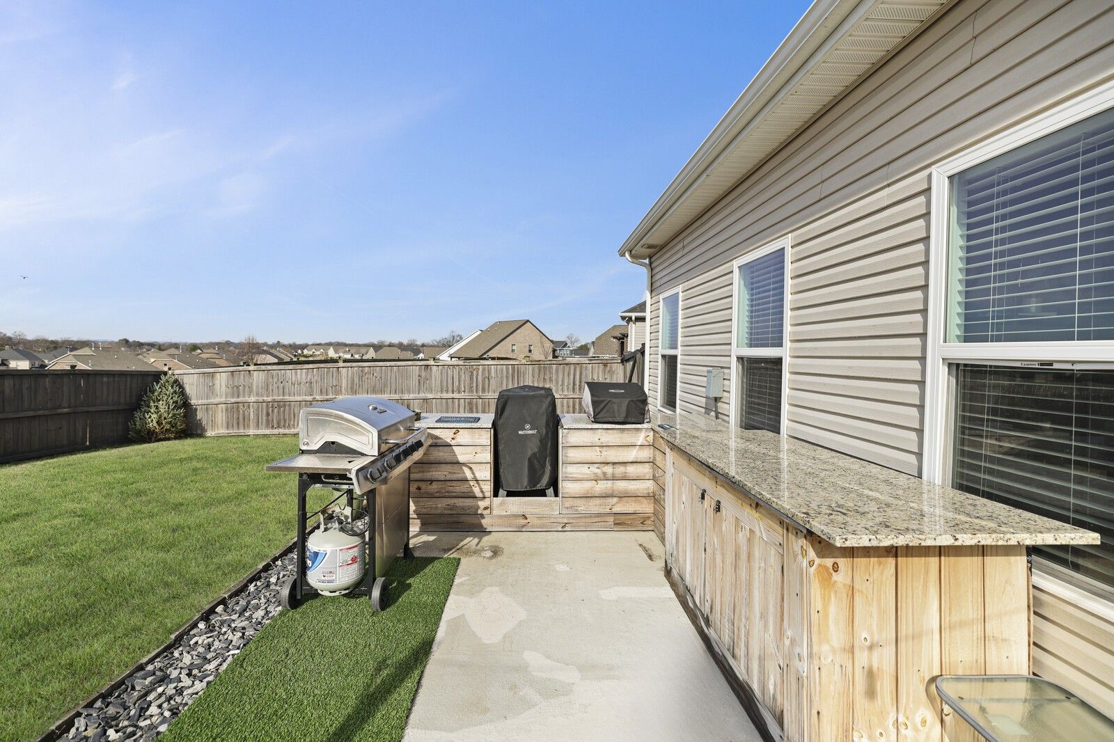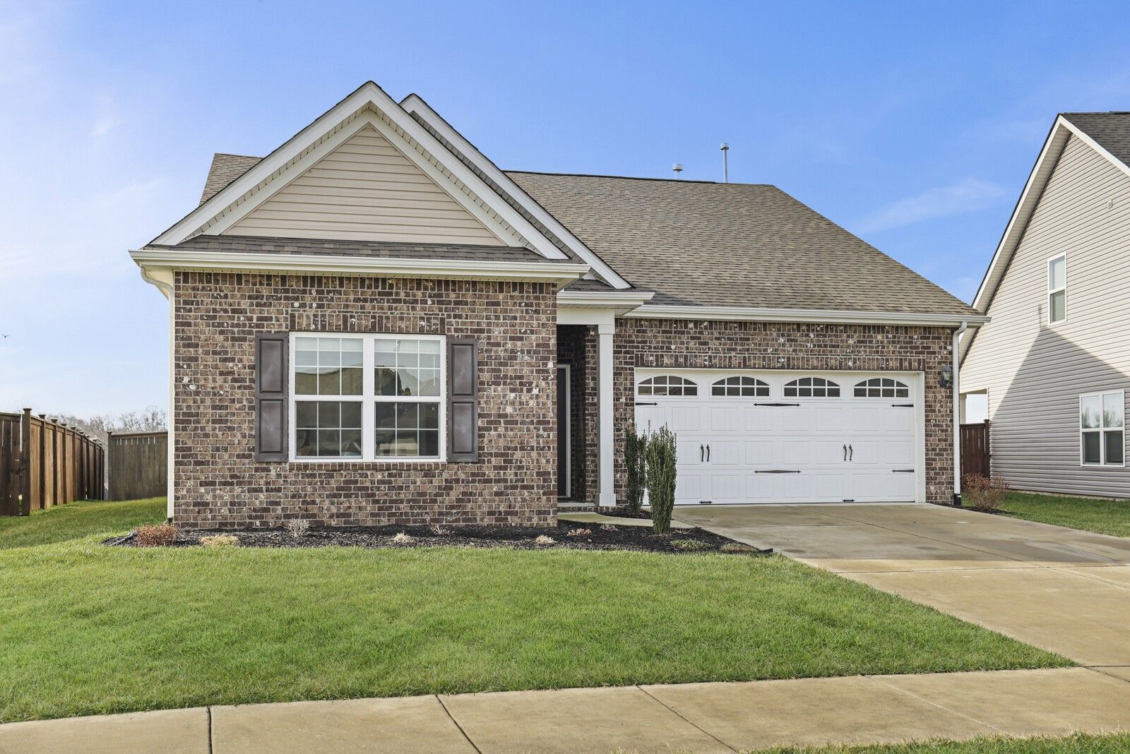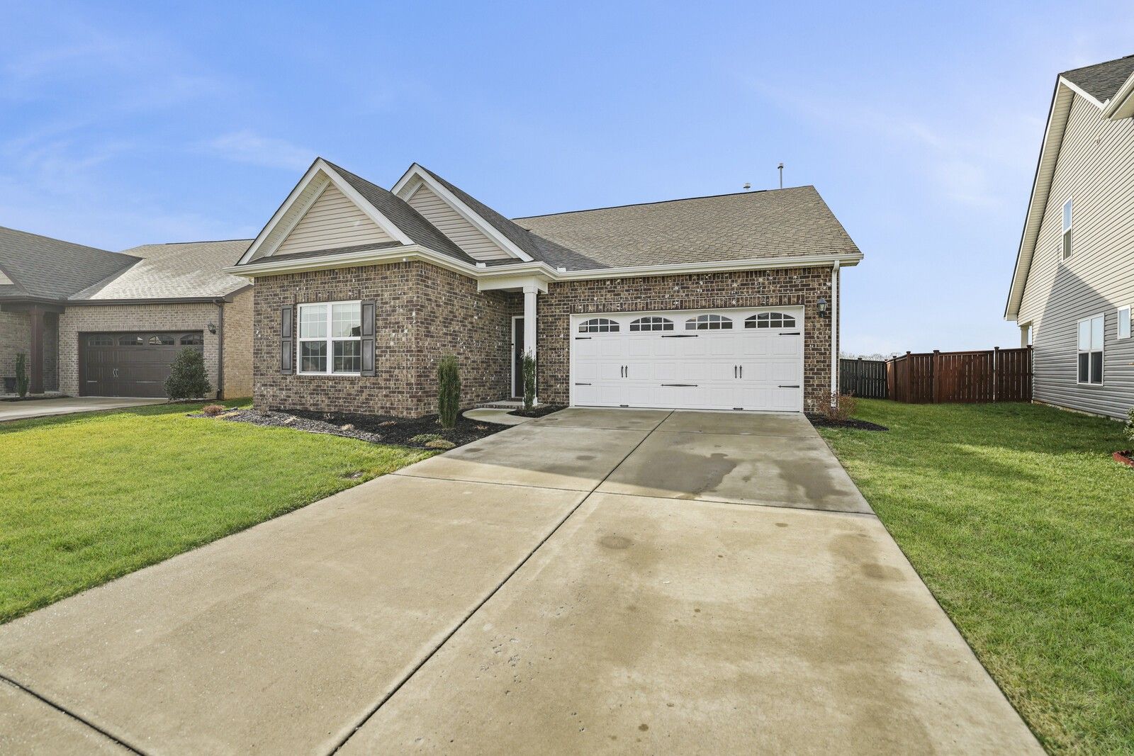 This charming 3-bedroom, 2.5-bath brick home in Gallatin offers 1,785 square feet of well-designed living space with a layout that blends comfort, style, and functionality. From the entry, two guest bedrooms are positioned at the front of the home and share a full hallway bathroom, creating a convenient and private arrangement for family or guests. The heart of the home features an open-concept living area that flows seamlessly into the kitchen and dining spaces. The modern kitchen showcases white cabinetry, granite countertops, stainless steel appliances, and an island with seating, while the attached dining area includes a built-in bar, perfect for entertaining. The spacious primary suite offers a navy accent wall and a private en-suite bathroom complete with a dual vanity, soaking tub, and separate shower. Step outside to enjoy a fully fenced backyard with a patio designed for gatherings, featuring an outdoor kitchen area ideal for grilling and hosting. An attached two-car garage adds everyday convenience, while the classic brick exterior provides timeless curb appeal. A wonderful opportunity to enjoy modern living with great outdoor space in a desirable Gallatin location.