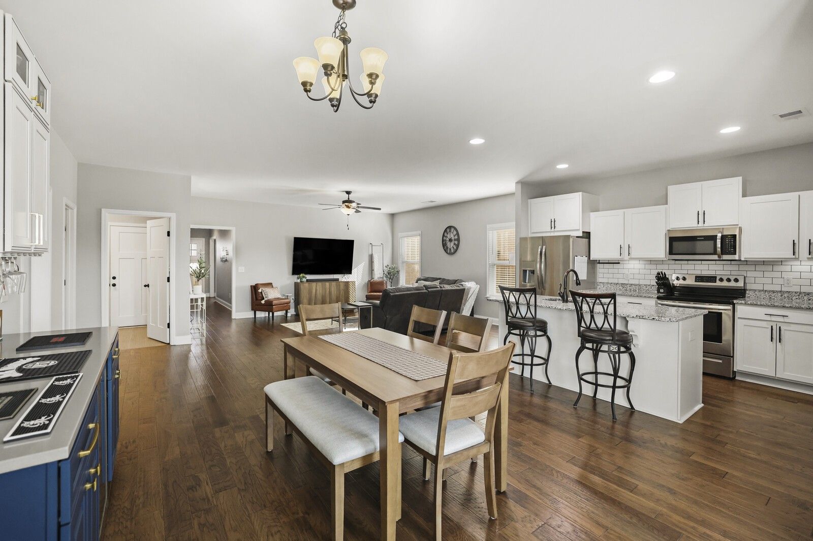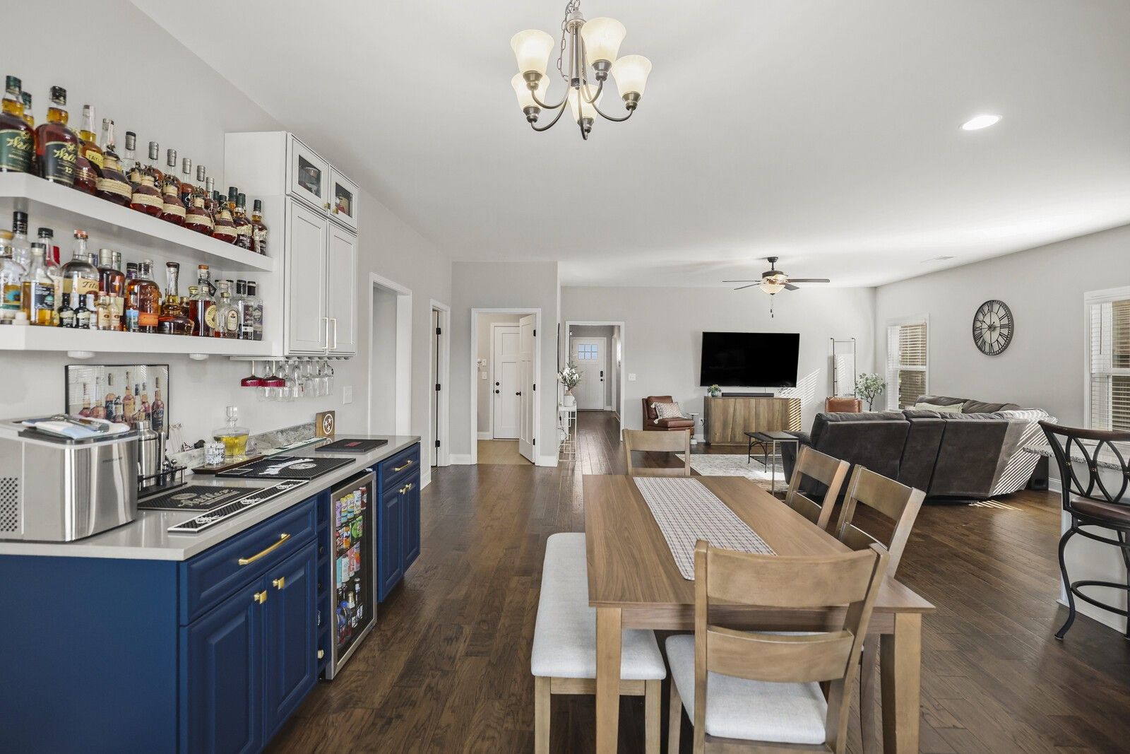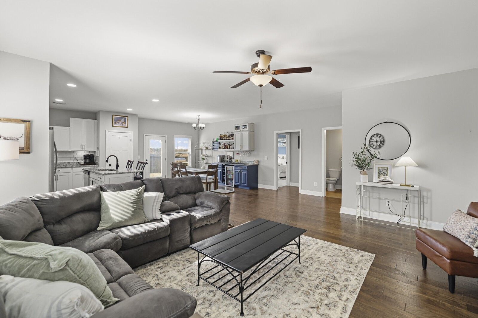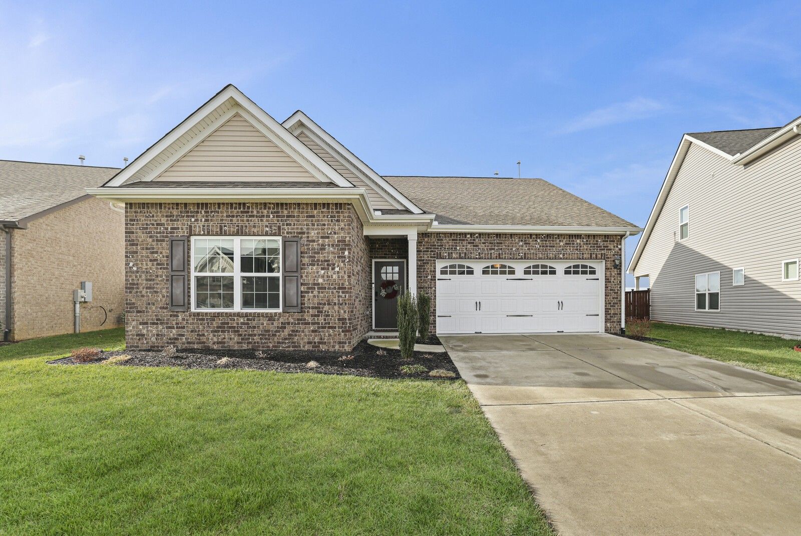 This charming 3-bedroom, 2.5-bath brick home in Gallatin offers 1,785 square feet of well-designed living space with a layout that blends comfort, style, and functionality. From the entry, two guest bedrooms are positioned at the front of the home and share a full hallway bathroom, creating a convenient and private arrangement for family or guests. The heart of the home features an open-concept living area that flows seamlessly into the kitchen and dining spaces. The modern kitchen showcases white cabinetry, granite countertops, stainless steel appliances, and an island with seating, while the attached dining area includes a built-in bar, perfect for entertaining. The spacious primary suite offers a navy accent wall and a private en-suite bathroom complete with a dual vanity, soaking tub, and separate shower. Step outside to enjoy a fully fenced backyard with a patio designed for gatherings, featuring an outdoor kitchen area ideal for grilling and hosting. An attached two-car garage adds everyday convenience, while the classic brick exterior provides timeless curb appeal. A wonderful opportunity to enjoy modern living with great outdoor space in a desirable Gallatin location.
