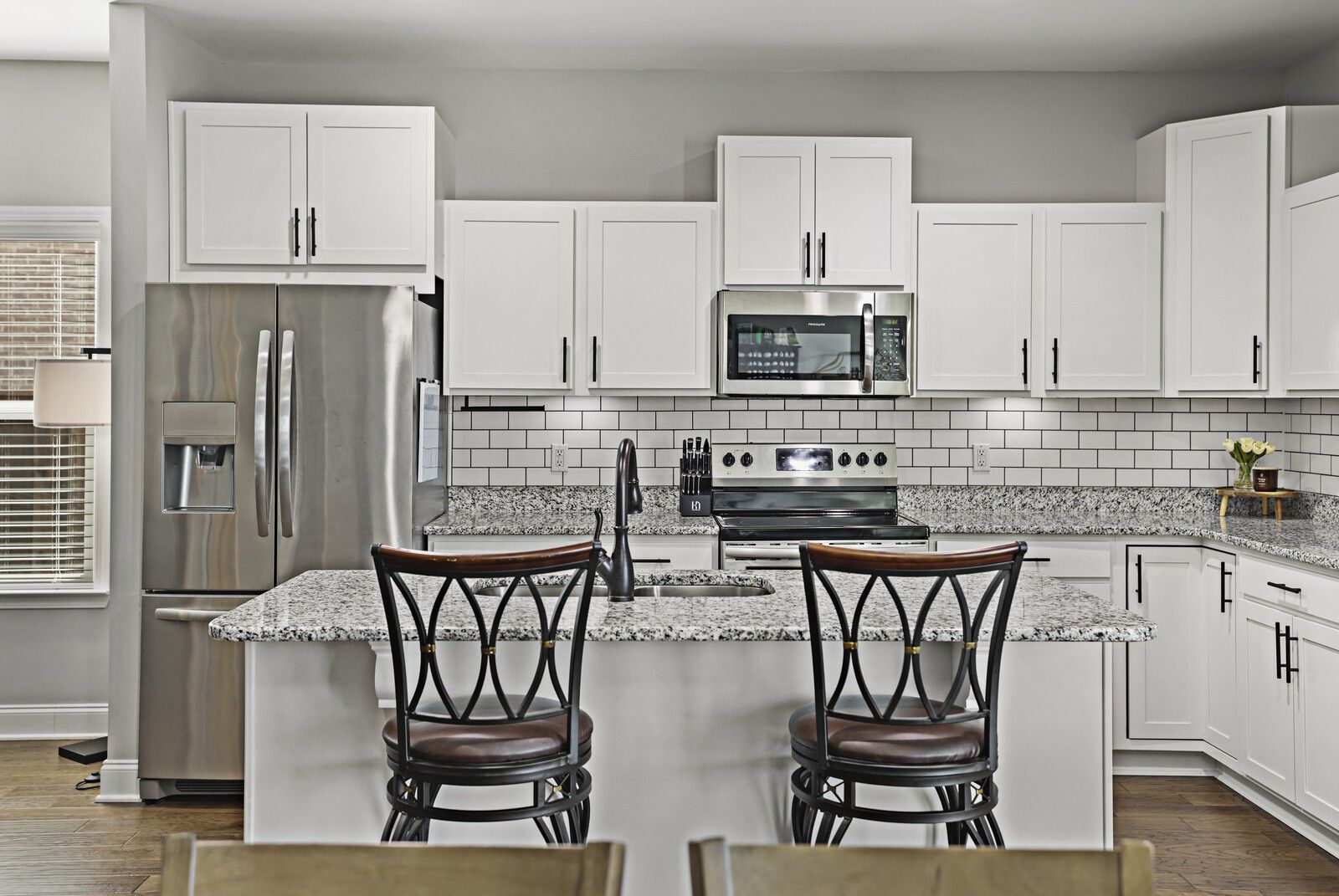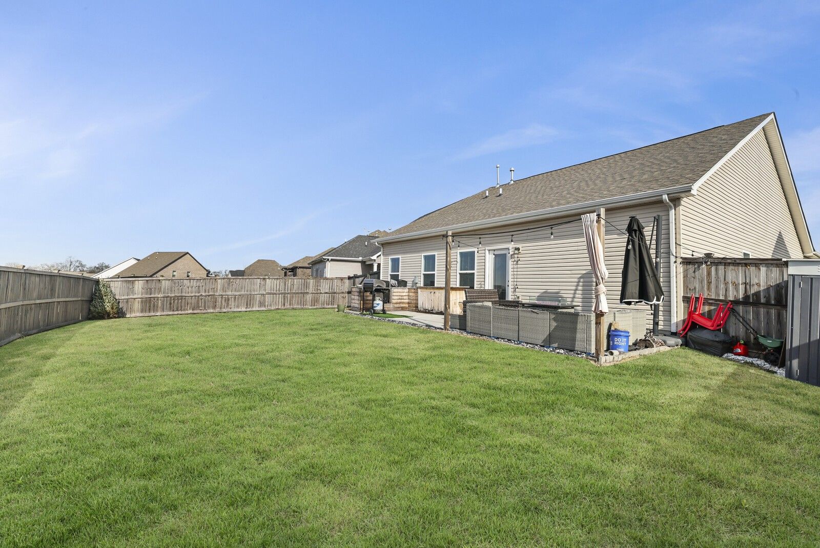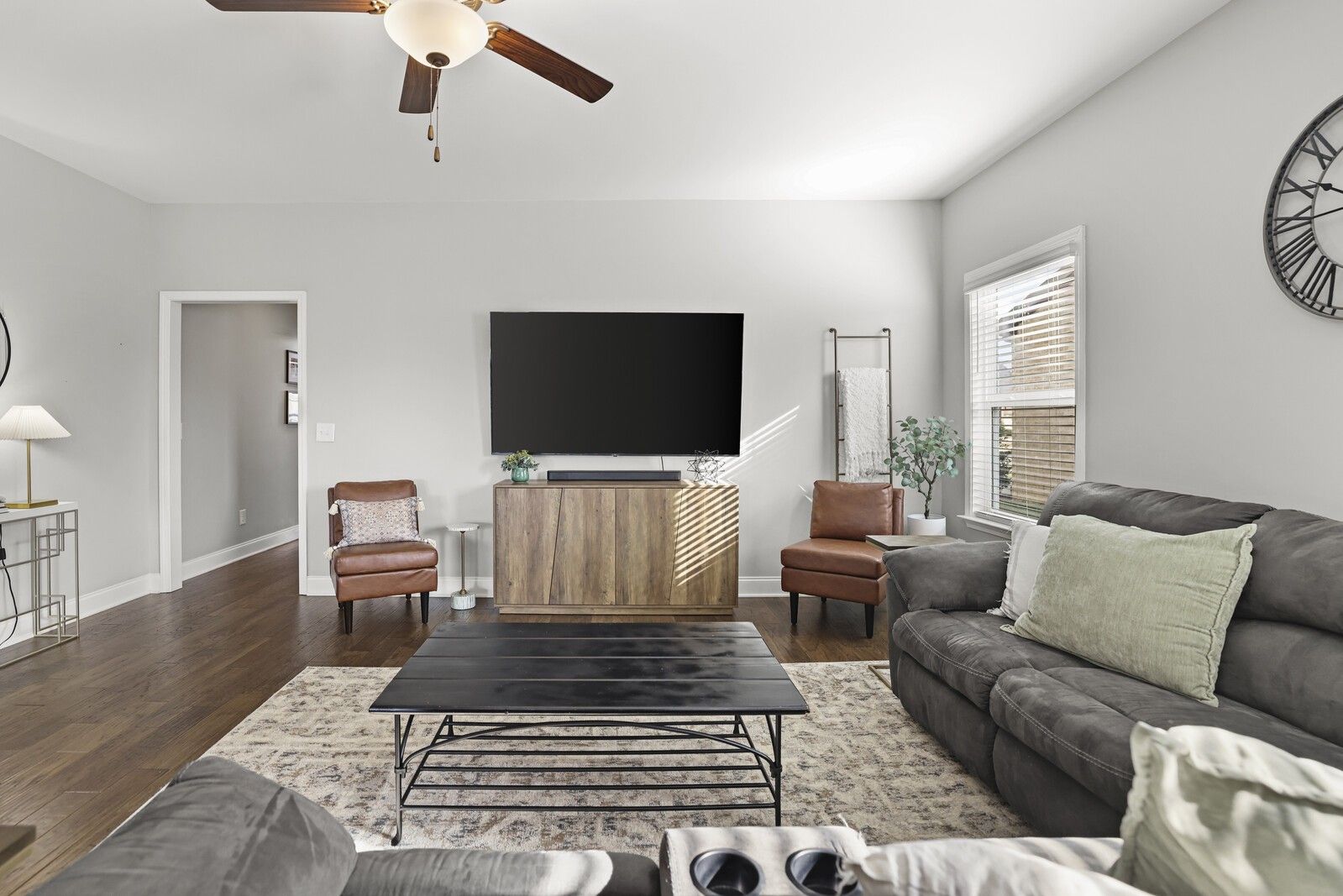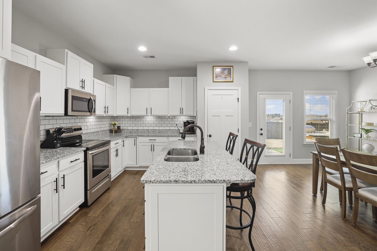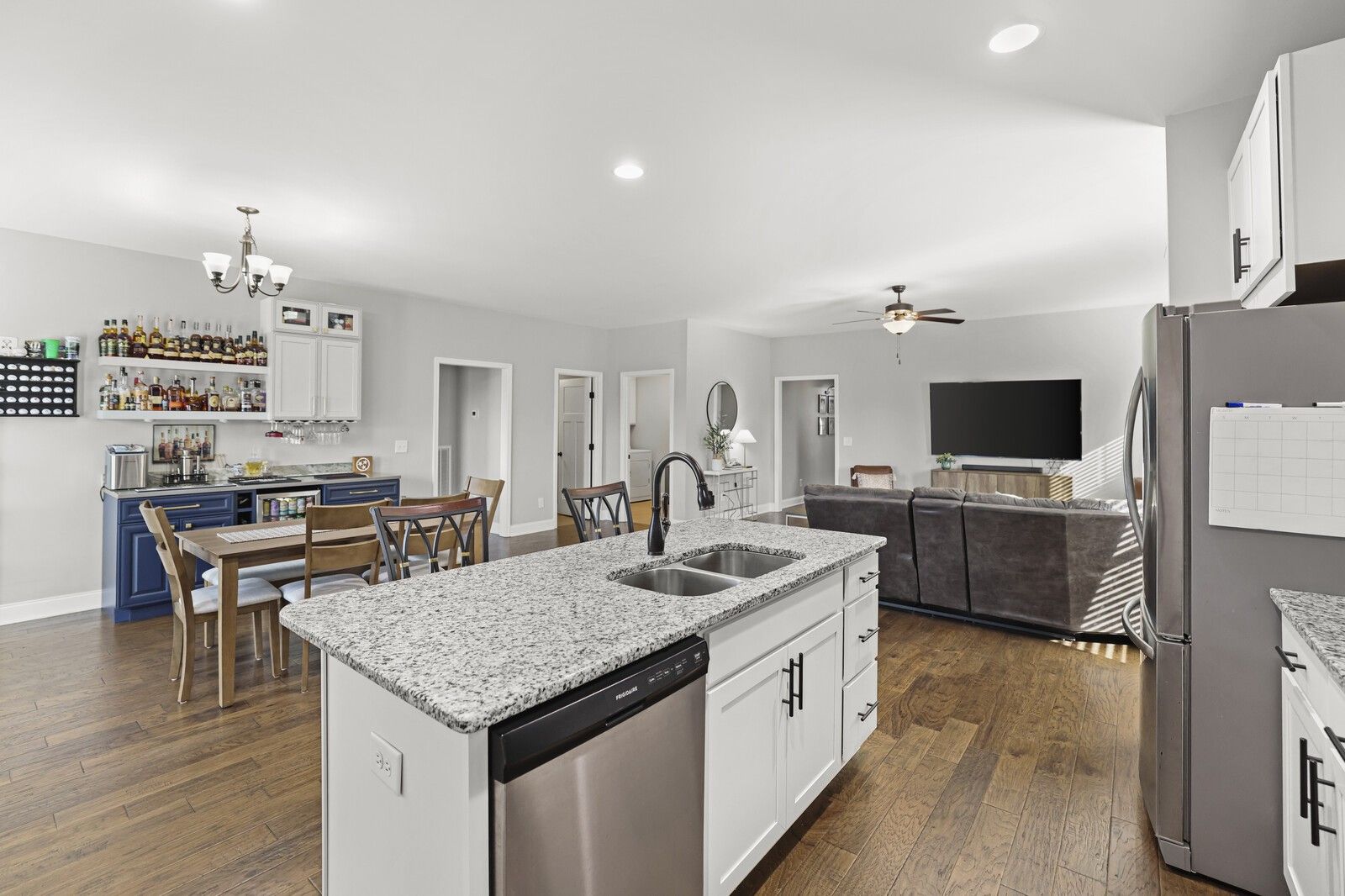 This charming 3-bedroom, 2.5-bath brick home in Gallatin offers 1,785 square feet of well-designed living space with a layout that blends comfort, style, and functionality. From the entry, two guest bedrooms are positioned at the front of the home and share a full hallway bathroom, creating a convenient and private arrangement for family or guests. The heart of the home features an open-concept living area that flows seamlessly into the kitchen and dining spaces. The modern kitchen showcases white cabinetry, granite countertops, stainless steel appliances, and an island with seating, while the attached dining area includes a built-in bar, perfect for entertaining. The spacious primary suite offers a navy accent wall and a private en-suite bathroom complete with a dual vanity, soaking tub, and separate shower. Step outside to enjoy a fully fenced backyard with a patio designed for gatherings, featuring an outdoor kitchen area ideal for grilling and hosting. An attached two-car garage adds everyday convenience, while the classic brick exterior provides timeless curb appeal. A wonderful opportunity to enjoy modern living with great outdoor space in a desirable Gallatin location.