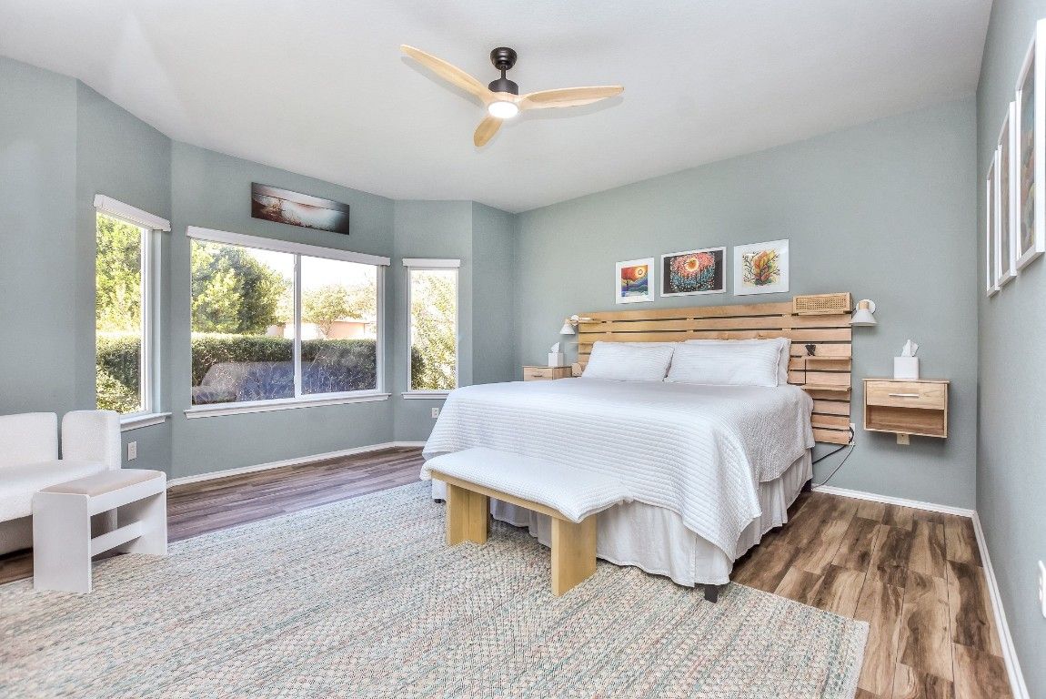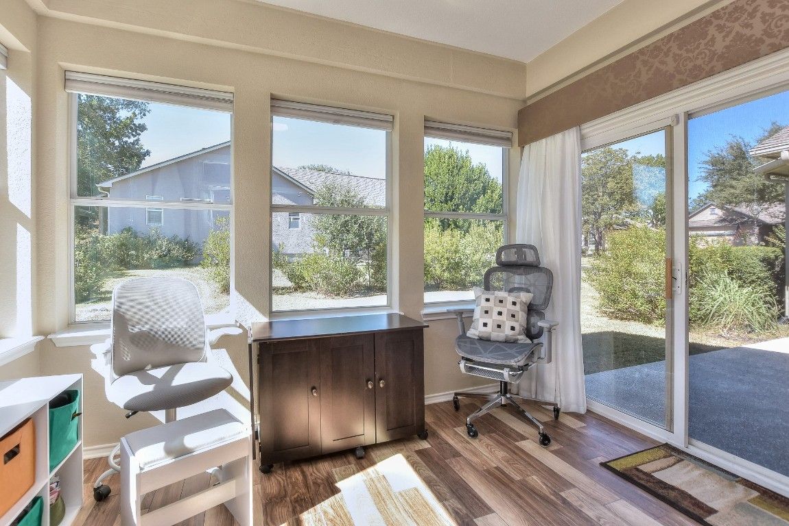Discover this rare and uniquely planned 2-bedroom, 2-full bath home featuring the desirable Long floor plan, enhanced by significant custom additions. This 1614 sqft home efficiently utilizes every space, boasting a highly desirable open floor plan that seamlessly connects the living and dining areas. Additional spaces include a private office (cleverly separated by a sliding barn door for function) and a one-of-a-kind sunroom addition, creating flexible, expanded living space. The home offers modern style and function throughout, featuring updated light fixtures and ceiling fans, and ceramic tile floors. The kitchen is a chef's delight, showcasing granite countertops, pull-out drawers for maximum storage, and newly painted cabinets (2025), complemented by a newer microwave (2024) and dishwasher (2023). The primary bedroom features a peaceful bay window, and its updated en suite bath offers quartz counters. The second bath also has been updated and offers beautiful granite countertops. The garage is a true workspace, featuring a durable epoxy floor, a practical laundry tub, and an insulated door for energy efficiency. The unique sunroom opens onto an epoxy-covered back patio, and the front features a seamless epoxy sidewalk to the front porch for superior curb appeal. The low-maintenance, xeriscaped front yard ensures low water bills and easy care. Water heater(12/2025), roof(2018), hvac(2015). This is a turnkey opportunity ready for its next owner!