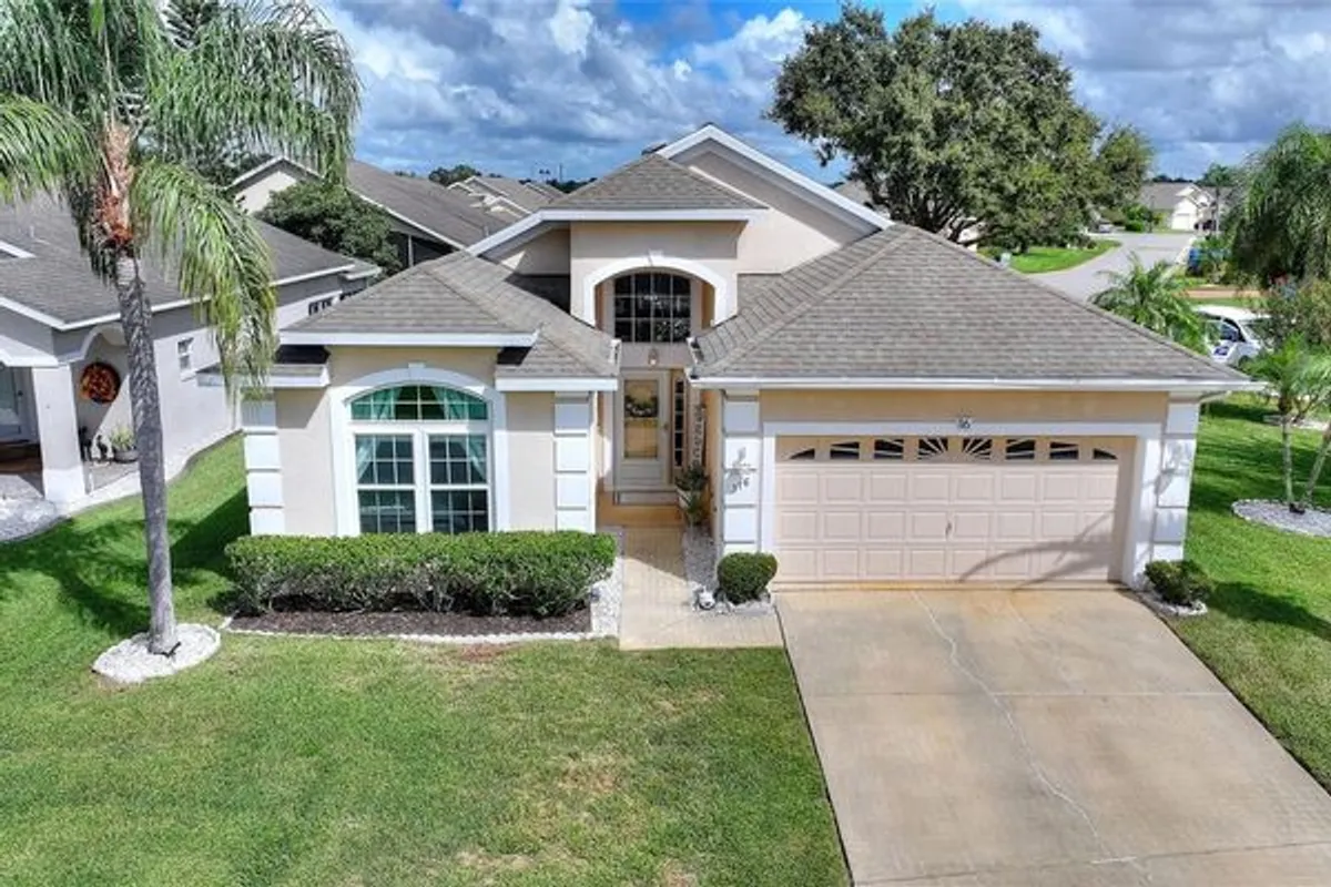 One or more photo(s) has been virtually staged. Corner lot RidgeDale 2/2/Den model has solid-surface floors, granite countertops, well for irrigation and several replacement windows, located 0.2 miles from High Vista private clubhouse and amenities center. Under roof front entry has an overhead domed transom window and full-view storm door with self-storing screen, leading to a bright open central great room with 12 FT ceilings and a wall of patio doors to the north-facing screened lanai. Granite countertops, subway tile backsplash and newly painted cabinets in eat-in kitchen with vaulted ceiling, stainless-steel appliances, built-in desk, large pantry and built-in closet. Cathedral ceiling in en suite primary bedroom with 2 walk-in closets and french door to lanai. Den, with double-door entry from Great Room, is nestled between primary and guest bedrooms. Newer interior paint, hardware, electrical outlets, smoke detectors, some ceiling lights & fans. Corridor access laundry has washer & dryer, storage closet and utility sink. Garage has epoxy floor, reinforced garage door with keypad entry, freestanding and overhead shelving. Water heater replaced 2025. Roof recently inspected. HVAC replaced 2011; HVAC condenser fan motor replaced 2025. Sold As-Is. Ridgewood Lakes is a golf cart friendly community. $230 monthly High Vista HOA fee includes Spectrum internet and basic cable TV with 2 cable boxes, lawn mowing and exclusive access to resident-owned 12,000 SF private High Vista clubhouse and amenities. $425 semi-annual Ridgewood Lakes HOA fee provides 24x7 staffed security gate and master association-owned private road maintenance. Adjacent to 18-hole White Heron Golf Club with The Nest restaurant, privately owned and open to the public. High Vista is a 55+ community with outdoor heated pool and spa, fitness center, library, pub & many organized activities. Pickle ball, tennis, bocce and shuffleboard courts. Miles of biking and walking trails within Ridgewood Lakes gated community. Shopping, Disney, Universal, Orlando & Central FL entertainment nearby, easy access to I-4, medical facilities, airports & Sunrail Station. Advent Health hospital is 3 miles away.