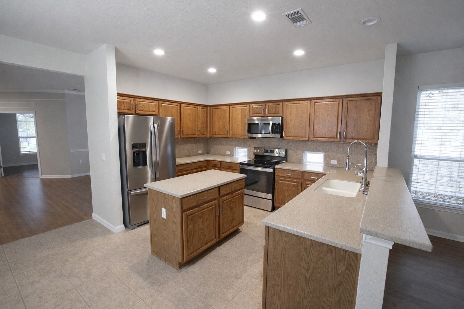 All furnishings are virtually staged. Welcome home to this beautifully maintained single-story residence in the heart of Sun City Georgetown, where comfort, convenience, and an active lifestyle come together seamlessly. Situated on a quiet street just minutes from the clubhouse and golf amenities, this 3-bedroom, 2-bath, plus office home offers 2,112 square feet of thoughtfully designed living space—all on one level. Inside, you’ll find tile and wood look flooring throughout, a welcoming family room with a cozy fireplace, and a flexible floor plan that includes a dedicated office—perfect for hobbies or working from home. The kitchen is well-appointed with built-in electric range, ample cabinetry, and opens easily to the dining and living areas for effortless entertaining. The spacious primary suite features dual vanities, a walk-in closet, and a separate shower, creating a comfortable private retreat. Two additional bedrooms provide space for guests or additional uses. Step outside to a patio overlooking a beautifully landscaped backyard with mature trees and wrought-iron fencing—ideal for relaxing mornings or evening gatherings. Residents enjoy access to Sun City’s exceptional amenities, including golf courses, fitness centers, pools, walking trails, clubs, and on-site dining, all within a vibrant 55+ community. This home offers low-maintenance living in one of Georgetown’s most desirable neighborhoods—ready for you to enjoy from day one.