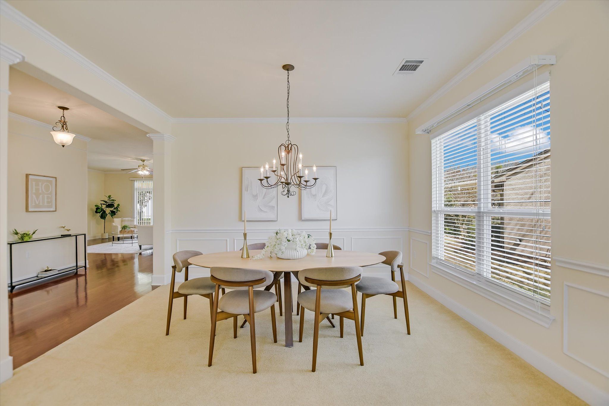 - Ceiling Fan(s), Crown Molding, Separate/Formal Dining Room, Double Vanity, Eat-in Kitchen, Kitchen Island, Multiple Living Areas, Multiple Dining Areas, Main Level Primary, Open Floorplan, Recessed Lighting, Solid Surface Counters