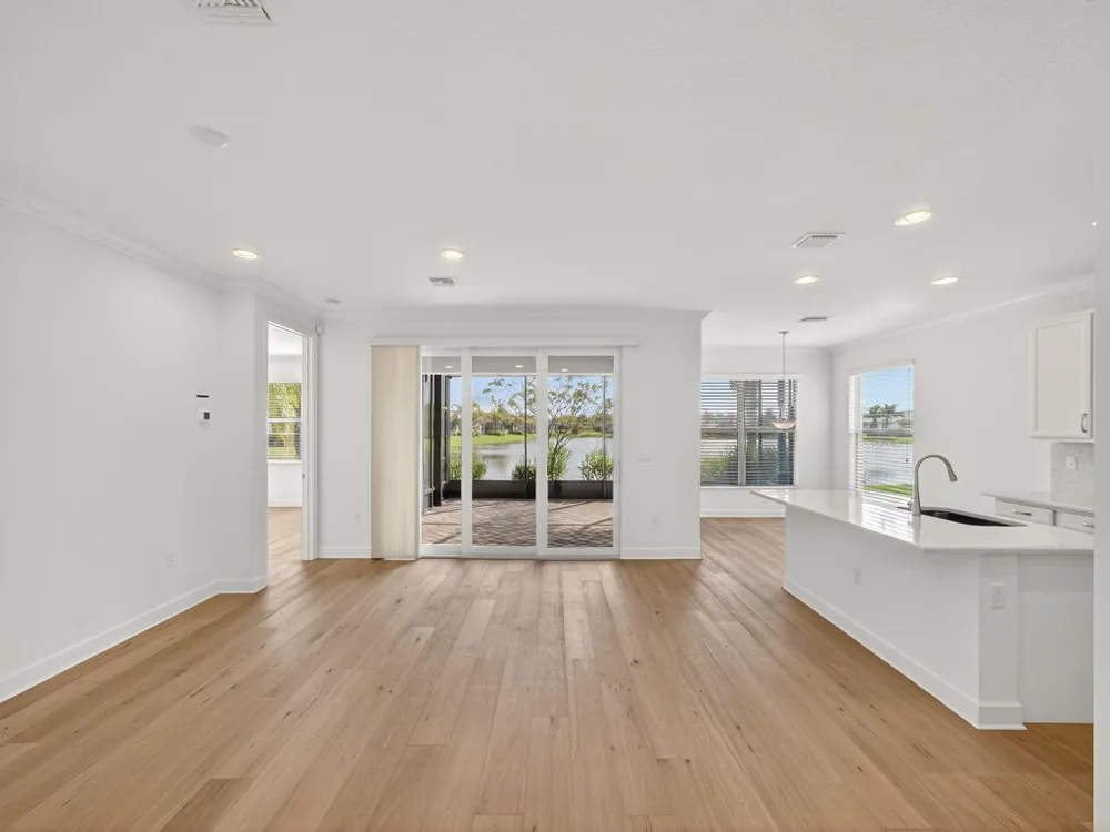 Welcome to this impeccable and beautifully upgraded 2 Bedroom + Den, 2 Bathroom lakefront home in the highly desirable 55+ community of Valencia Cay at Riverland. Perfectly positioned on an oversized, premium water-view lot, this residence combines elegant modern design, thoughtful upgrades, and access to a vibrant, resort-style lifestyle. Step inside to discover Oak-hardwood plank flooring throughout, detailed crown molding, and 36 recessed LED high hats that create a warm, inviting ambiance. The versatile den with French doors is ideal for a home office, library, or guest retreat. The chef-inspired kitchen showcases upgraded cabinetry and hardware, granite countertops with matching backsplash. A vented microwave and a spacious pantry with custom shelving.
