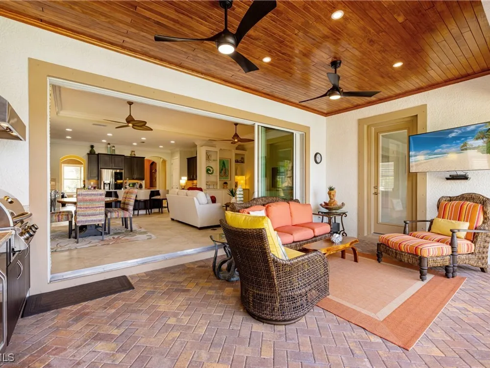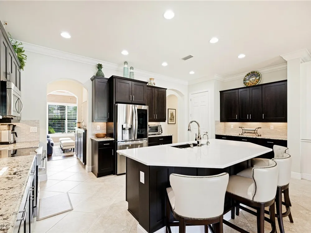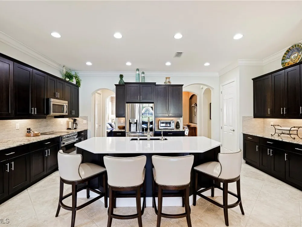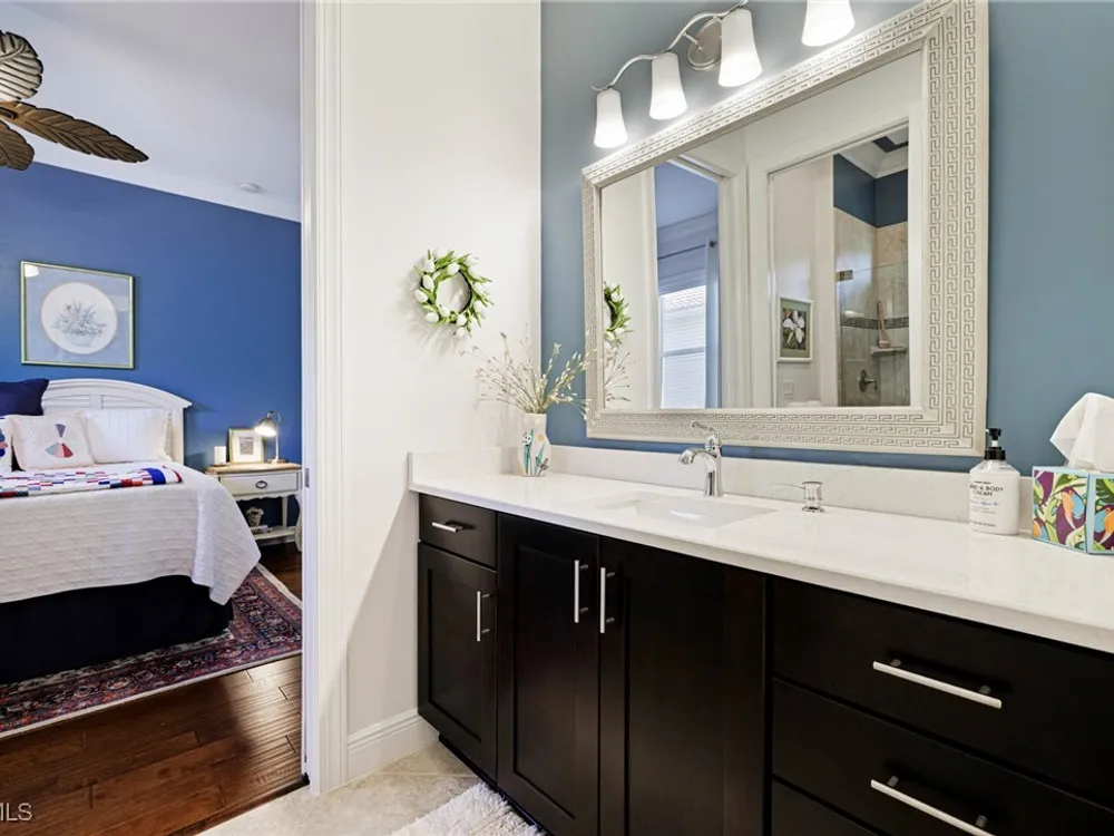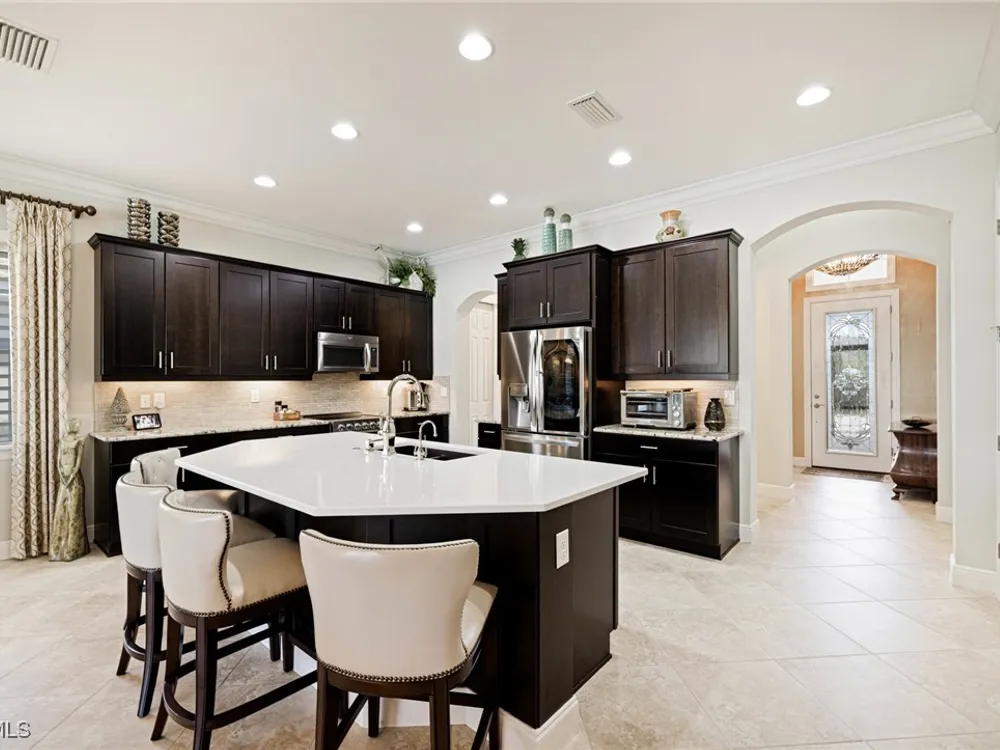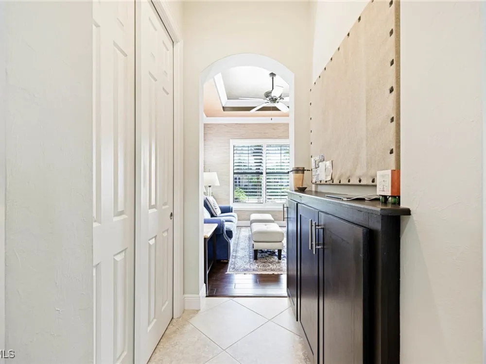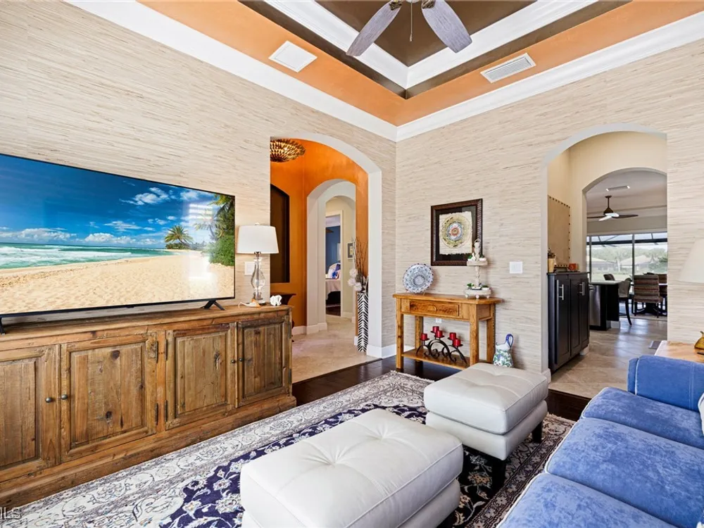 Nestled within the intimate Carena neighborhood of Pelican Preserve, this San Remo floor plan blends style, comfort, and resort-style living. This 2251 SF home offers 3 bedrooms, 2 ½ baths, and a versatile flex room for whatever your heart desires. A bright, open design flows seamlessly through expansive sliding glass doors to the covered lanai, where a tongue & groove ceiling sets the stage for an inviting outdoor kitchen, a heated sparkling pool and spillover spa-all overlooking a serene lake through an unobstructed clear-view screen. Inside, upgrades abound, including a chef’s kitchen with quartz and granite countertops, water filtration system, abundant storage, and premium appliances. The owner’s craftmanship shines throughout the home, transforming otherwise unused space into creative custom cabinetry-including a home organization station with storage and charging capabilities, a striking built-in wall unit, and a guest-area hall storage cabinet - each blending beauty, practicality and style. The primary suite enjoys calming lake views, a spa-like bath with large tub and walk-in shower, dual sinks, custom closet, and private patio access. Two inviting and private guest bedrooms share a full bath. There is an additional half bath as a convenience for all. Diagonal tile and/or engineered wood plank flooring throughout. Added features include hurricane shutters and a convenient Storm Smart roll-down screen for the covered lanai, a screened-in front porch, professional landscape lighting, garage ceiling mount storage, and an epoxy garage floor and so much more! Living in Pelican Preserve means access to world-class 55+ amenities—tennis, fitness, pools, dining, entertainment, optional golf, and endless social activities. This isn’t just a home, it’s a lifestyle. (NOTE: Kitchen Countertop Portable Oven and Generator do not convey with sale).