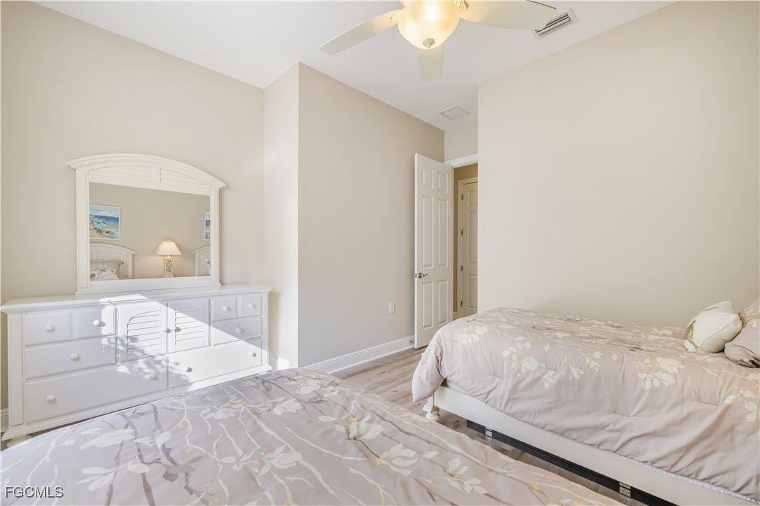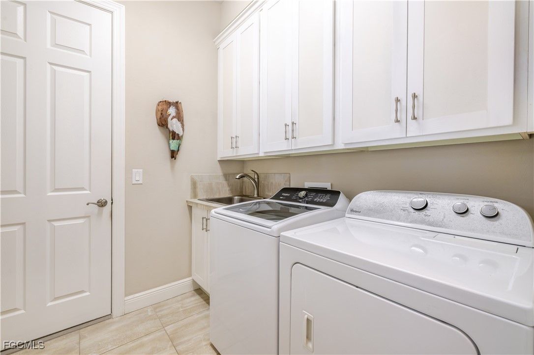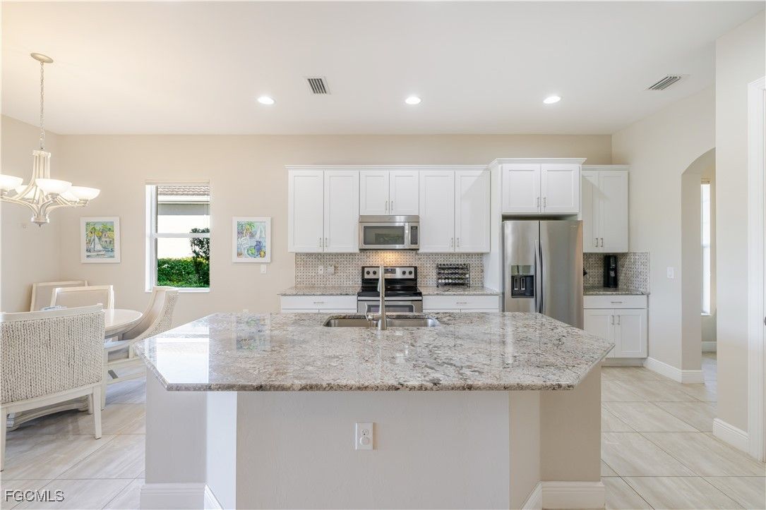 Get the benefit of three private rooms and a flex in the beautiful Carena neighborhood of Pelican Preserve, one of the most desirable 55+ communities in SW Florida. This popular Florencia floorplan offers exceptional flexibility and an open, inviting layout. The home features two spacious bedrooms, PLUS AN ADDITIONAL PRIVATE ROOM the owners currently use as a third guest-room with a shared full bathroom. A separate flex room provides even more versatility, ideal for a formal dining area, extra sitting space, or office, so many options. Enjoy panoramic water views through the large glass wall sliding doors that fill the home with natural light. The upgraded kitchen incudes 42" cabinets, beautiful granite countertops, a stylish backsplash and large island that flows seamlessly into the living and dining areas - a perfect setup for entertaining. The primary suite is a peaceful retreat with vinyl plank flooring, a private glass door leading out to the lanai pool area and a luxurious bathroom featuring a glass enclosed walk-in shower, separate deep soaking tub, dual vanities and a generous sized walk-in closet. Step outside to the expansive screened lanai with an inviting heated pool and the sounds of the spill over water feature spa overlooking a sparkling serene lake - perfect for relaxing or enjoying Florida sunsets. Additional highlights include lush landscaping, a screened front porch, summer kitchen rough-in, Hurricane shutters, storm smart screen on lanai, no carpets - tile, vinyl plank flooring and a bright laundry room complete with washer, dryer, sink and a window for natural light. This vibrant 55+ community offers an array of world-class amenities, including a championship 27-hole golf course, scenic bike and walking trails, lakes, fountains, restaurants, resort style pools, indoor pool with walking track, spa, dog park, fitness center, movie theater, bocce ball, tennis, pickleball, softball field and much more.