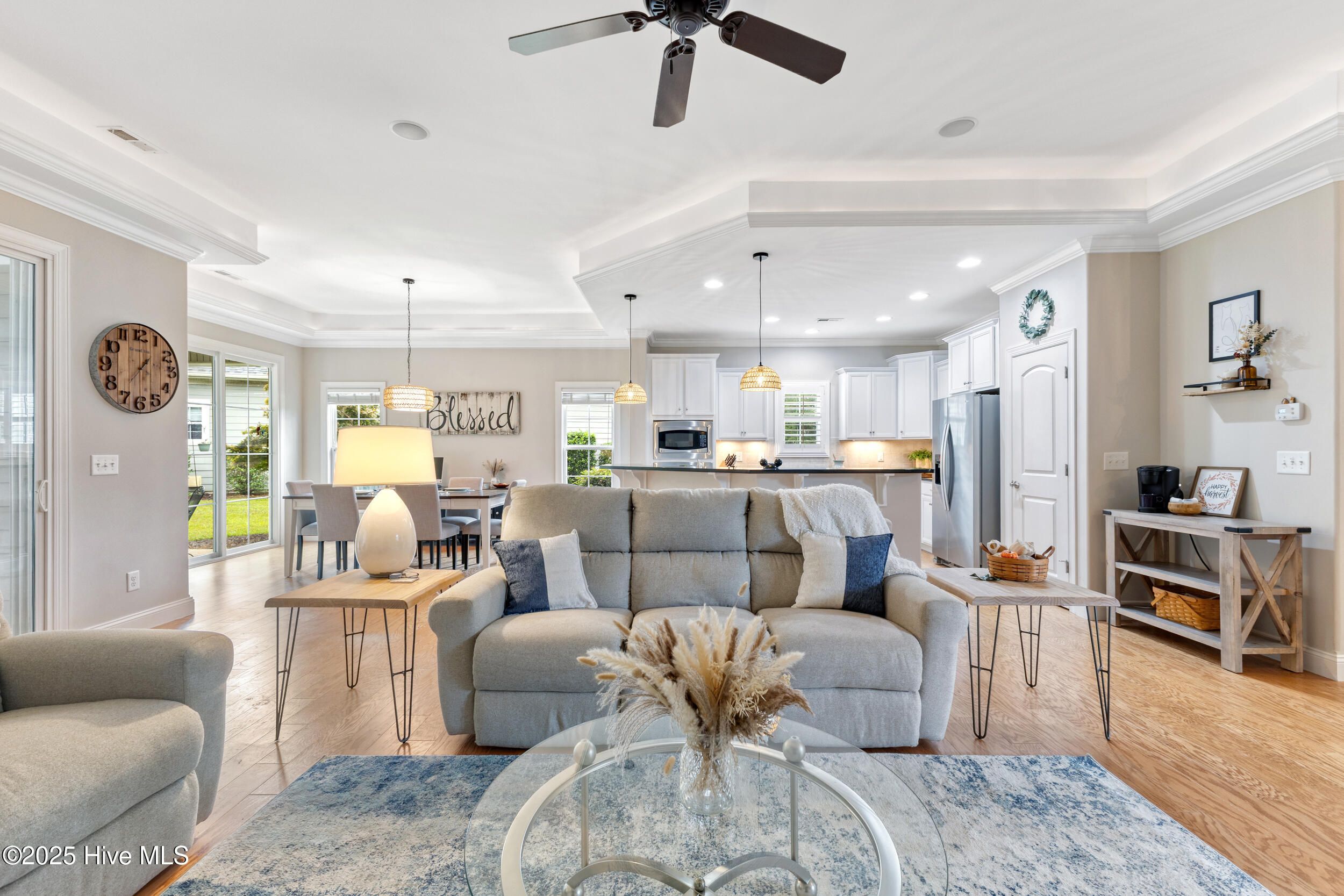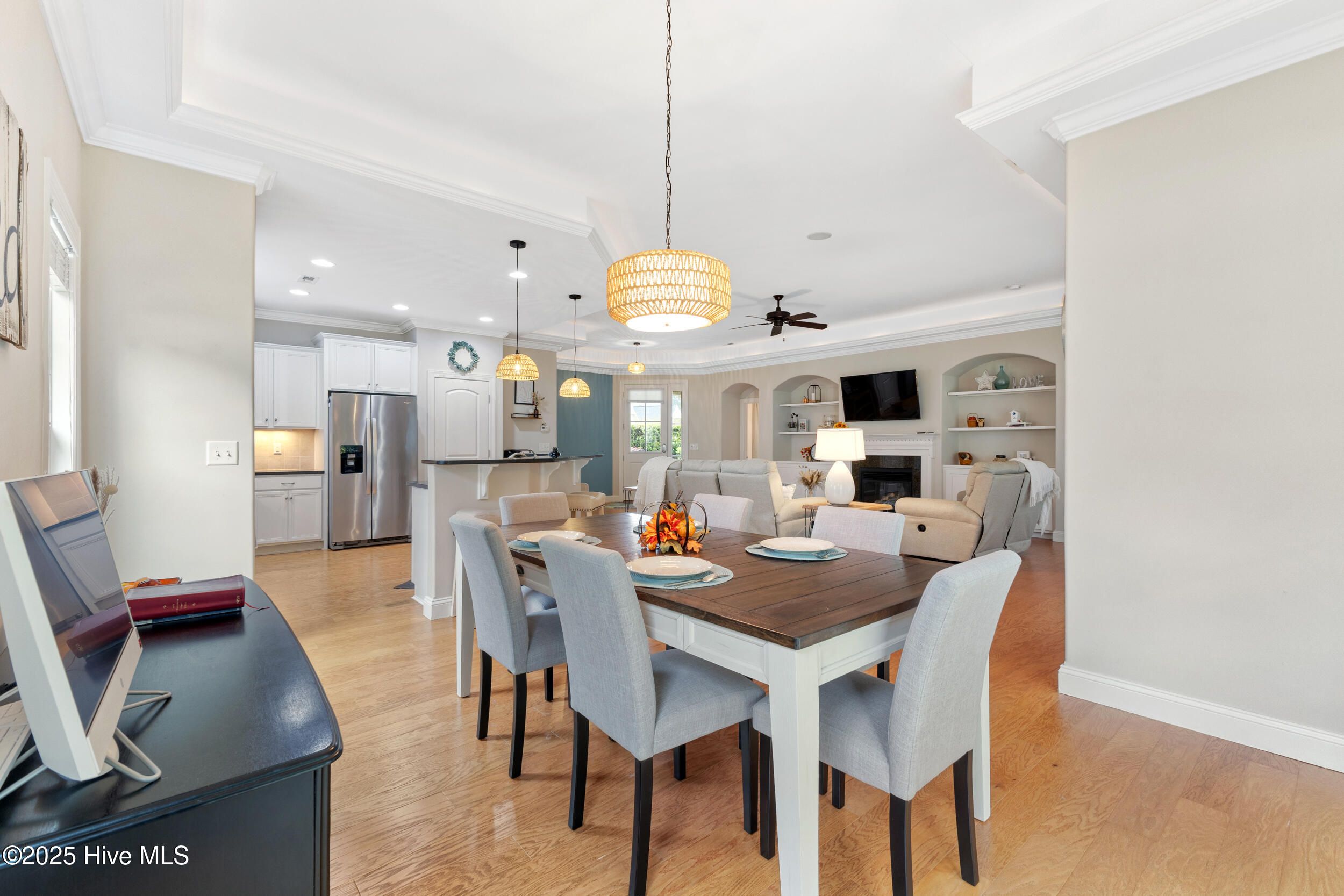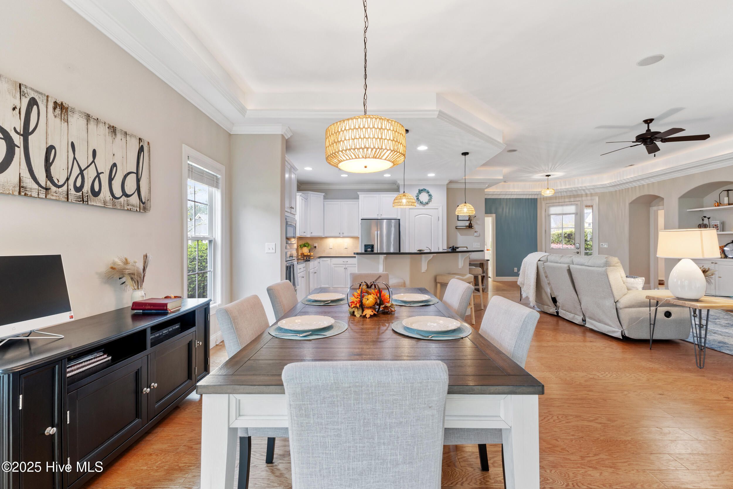 - Master Downstairs, Walk-In Closet(s), Tray Ceiling(s), High Ceilings, Entrance Foyer, Bookcases, Kitchen Island, Ceiling Fan(s), Pantry, Walk-In Shower, Blinds, Separate/Formal Dining Room